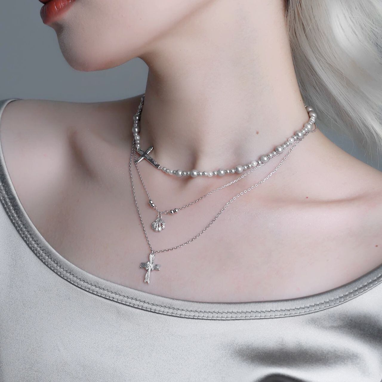 重ね付けも楽しめる、クロスモチーフとビーズが特徴のマルチネックレス。