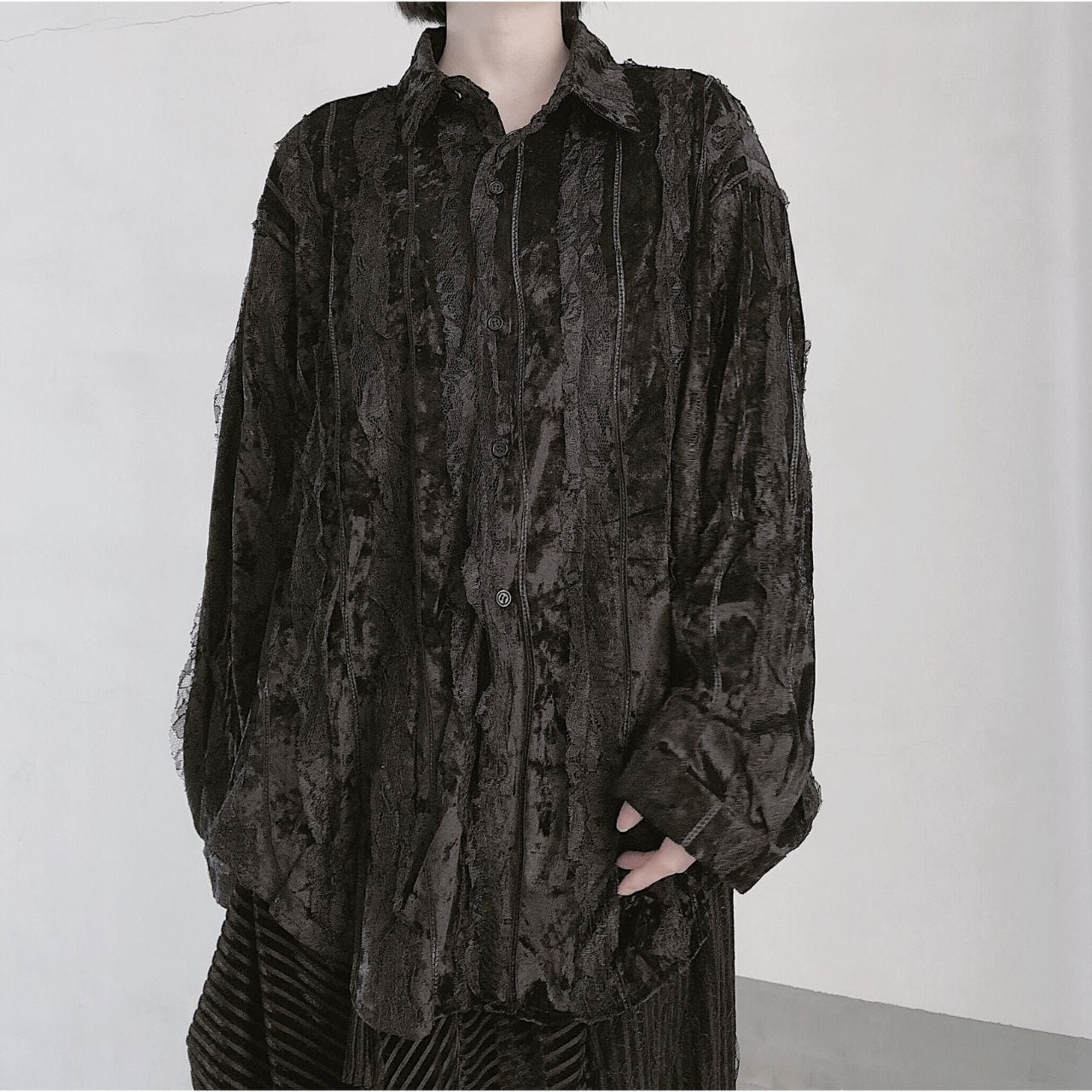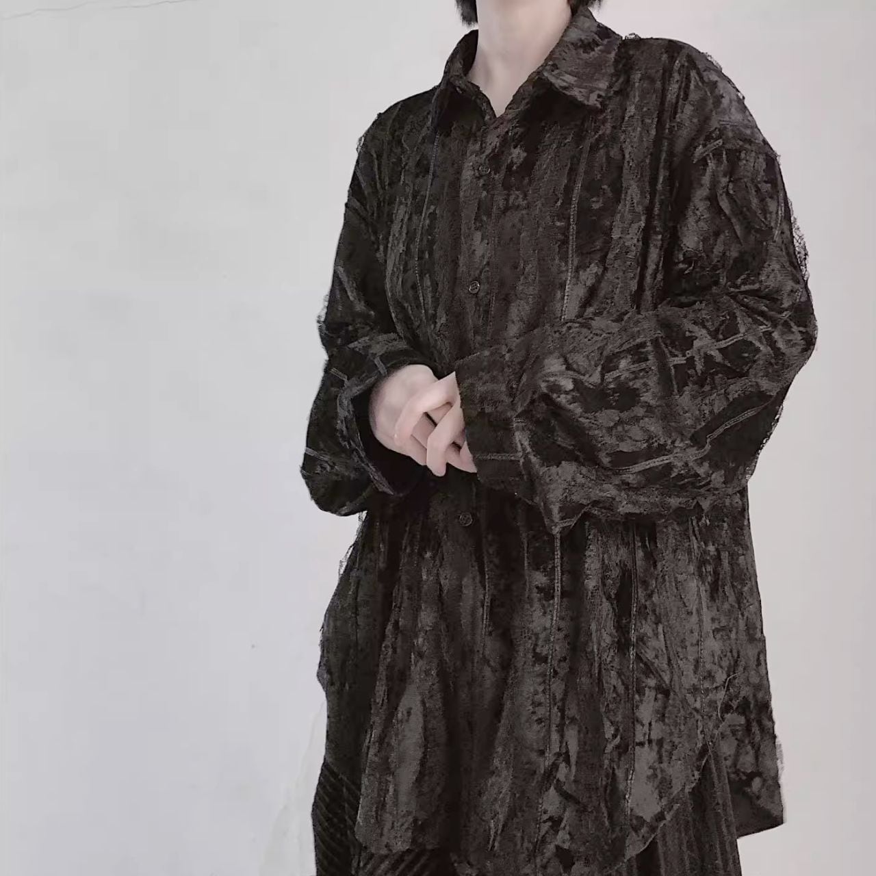 ダークなベルベット素材が醸し出す、リュクスなロングシャツ。