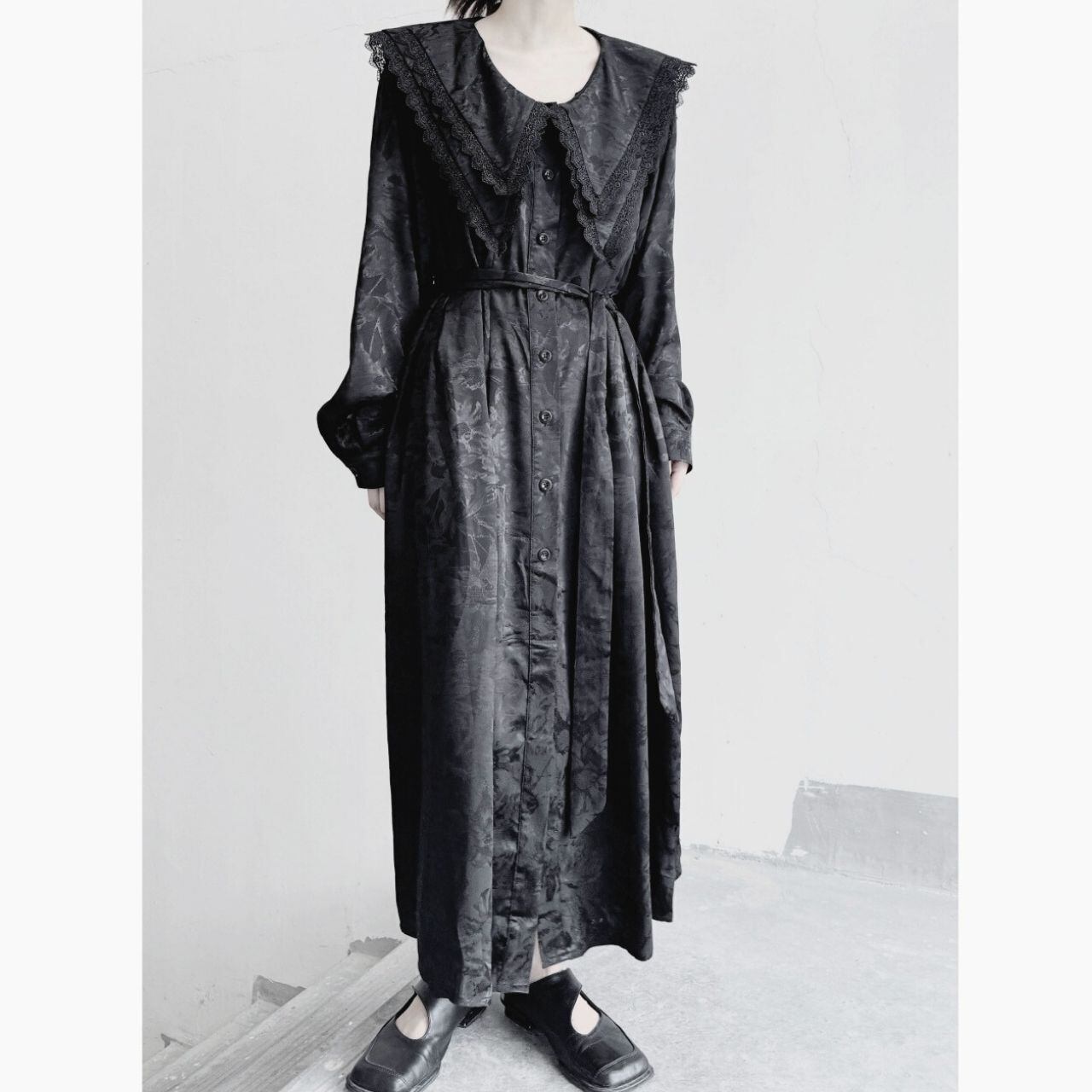 ブラックレースカラーが目を惹くロングシャツドレス。