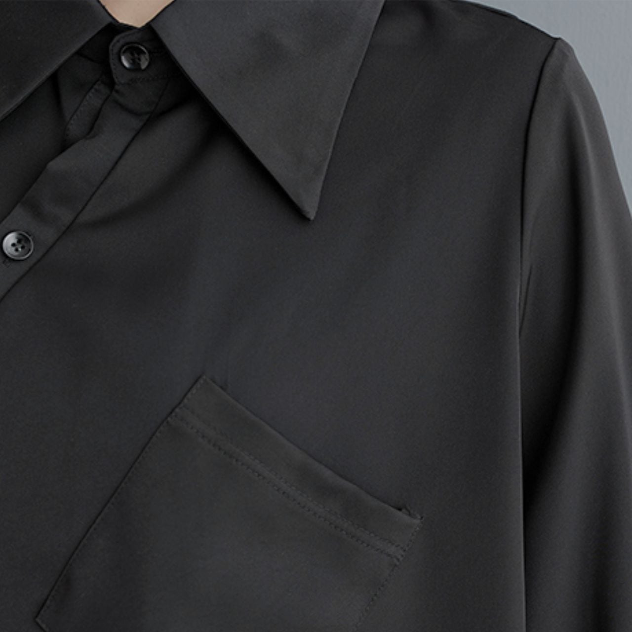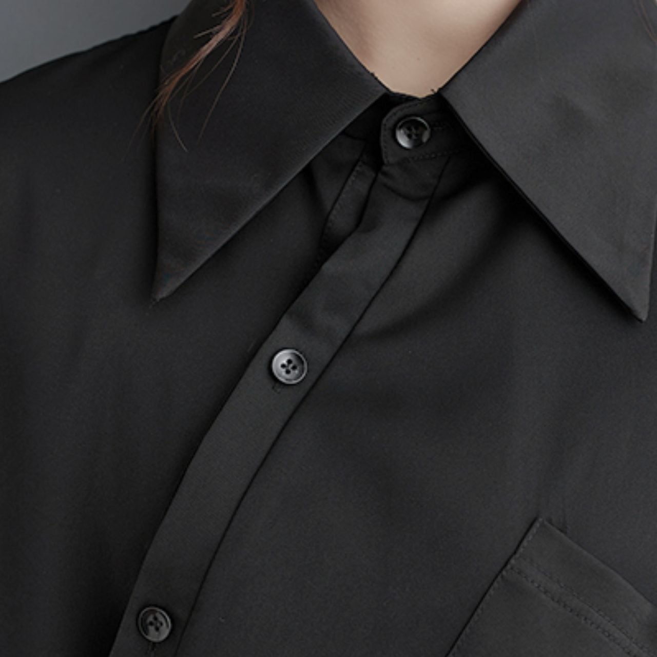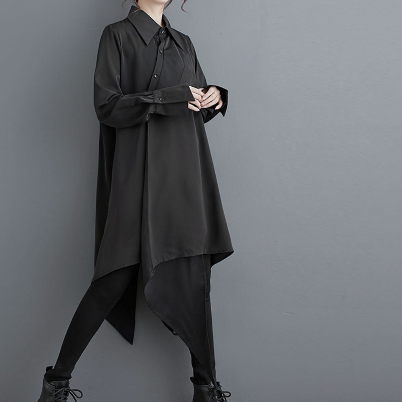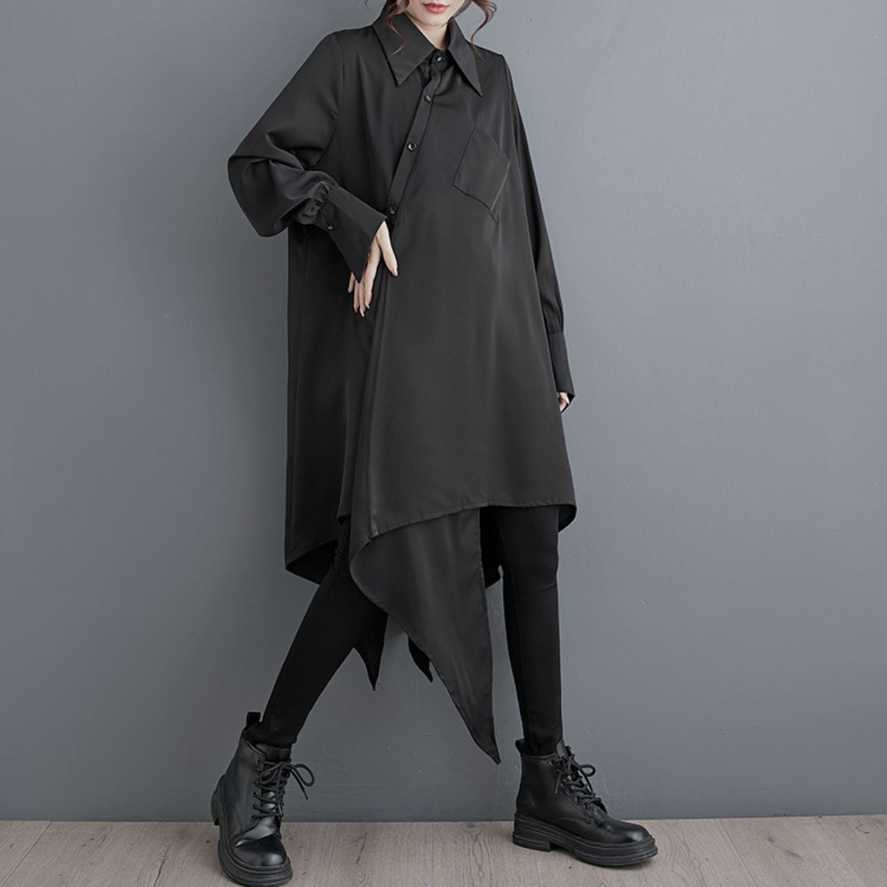 大胆なアシンメトリーな裾が、スタイリッシュな印象を与えます。
