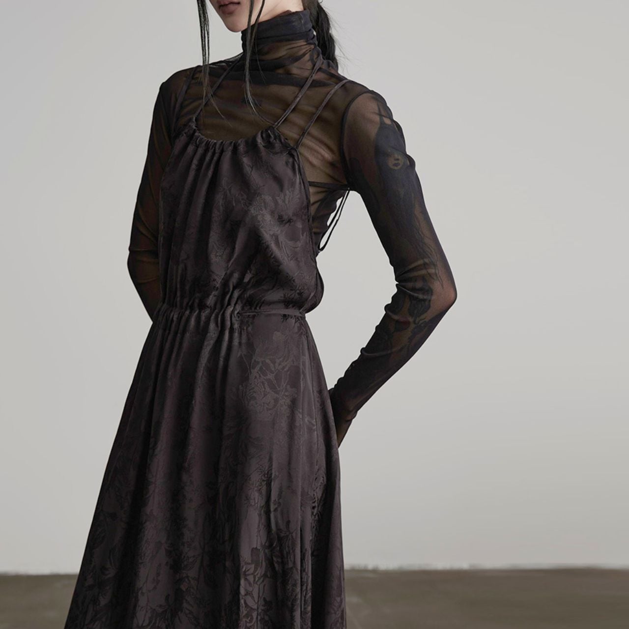 ウエスト、胸元部分がドローストリング仕様になっており、繊細なシルエットの変化もお楽しみいただけます。