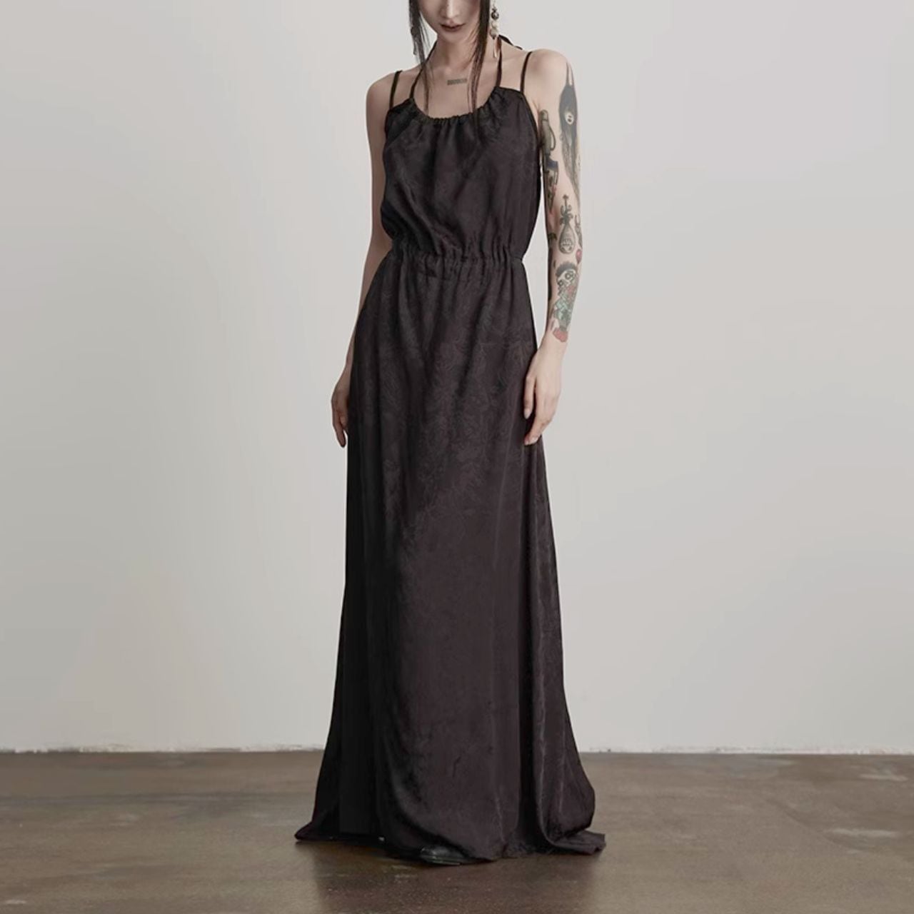上品な光沢を放つ生地で仕立てたホルターネックのマキシワンピース。