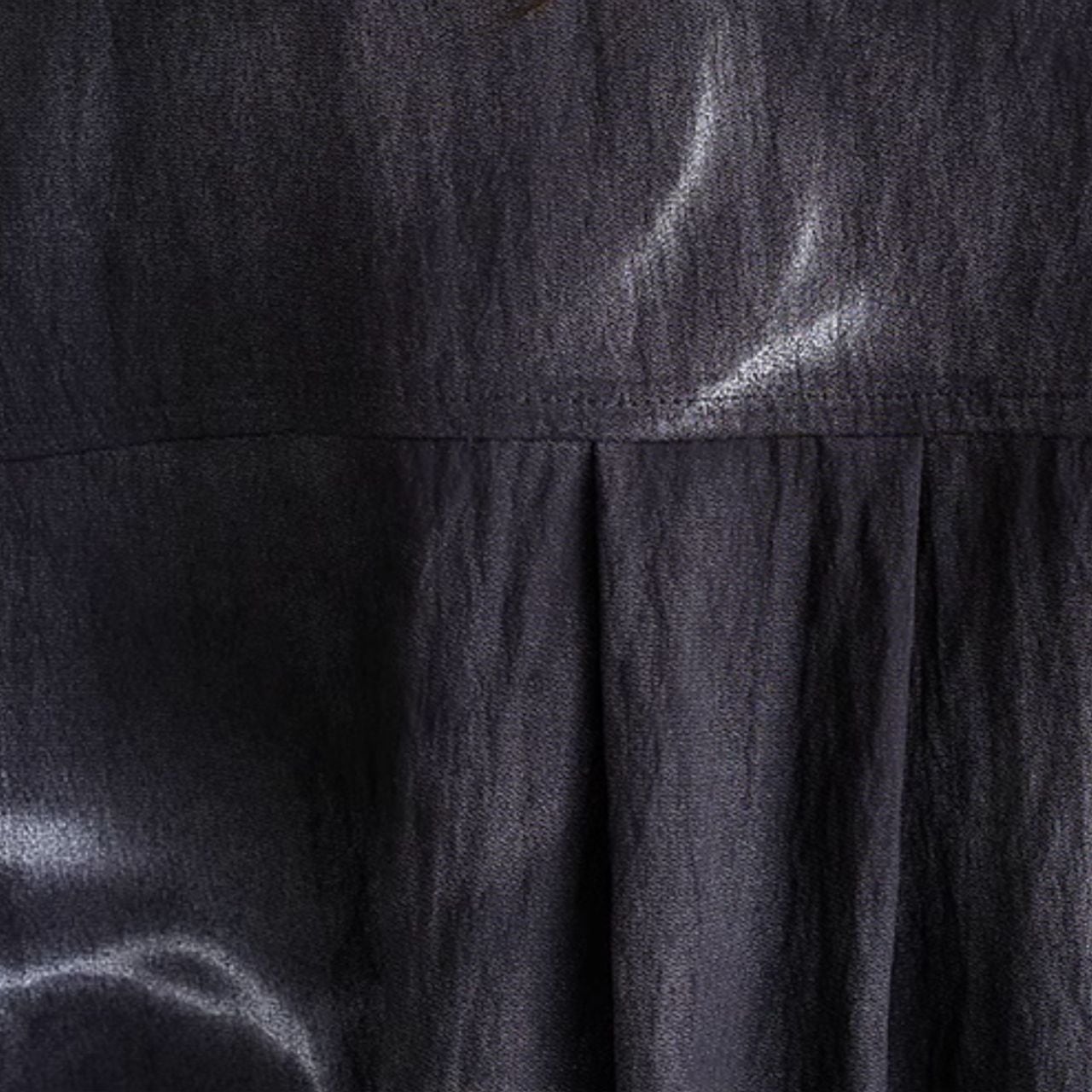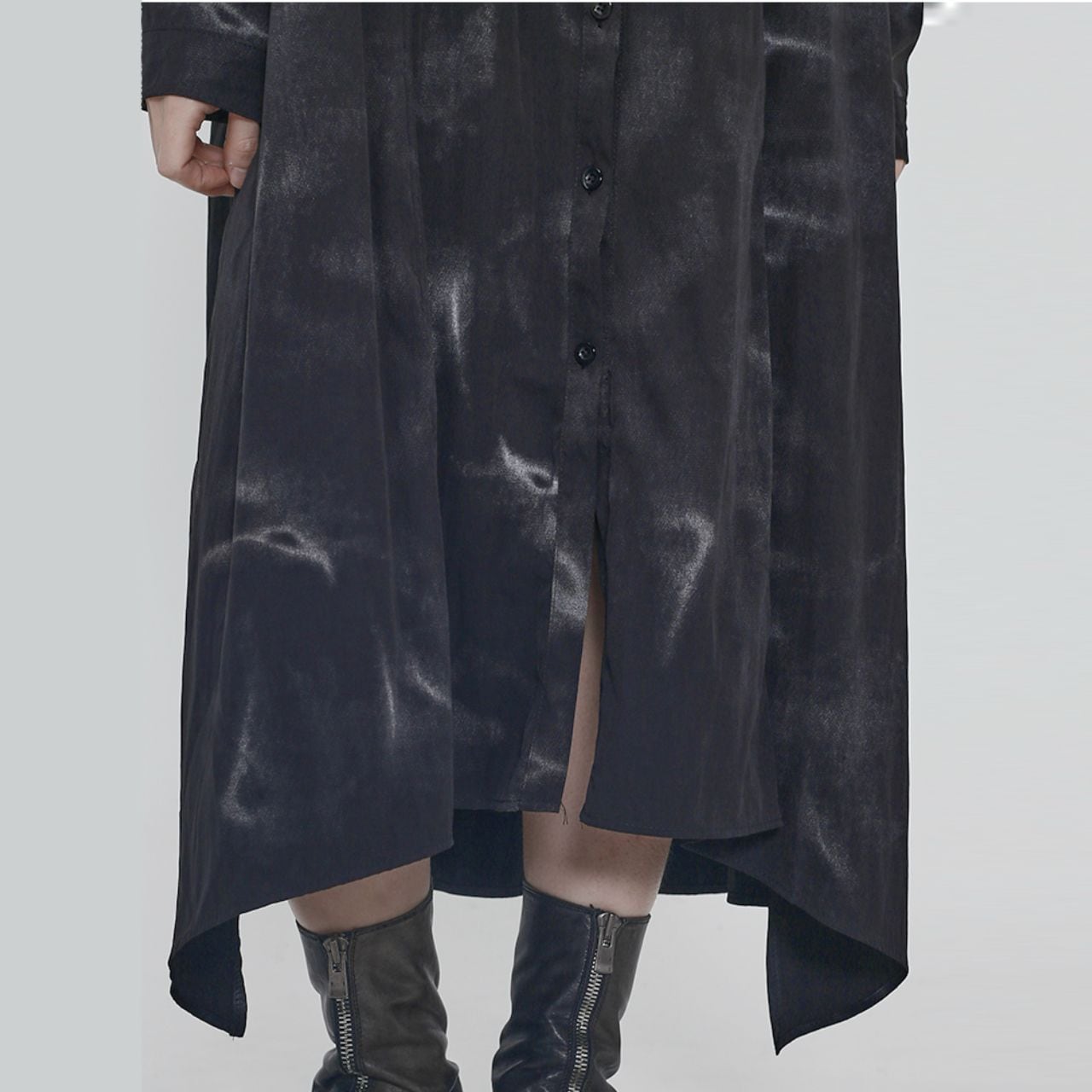 アシンメトリーなヘムラインが、歩くたびに軽やかに揺れ動き、女性らしい魅力を引き立てます。