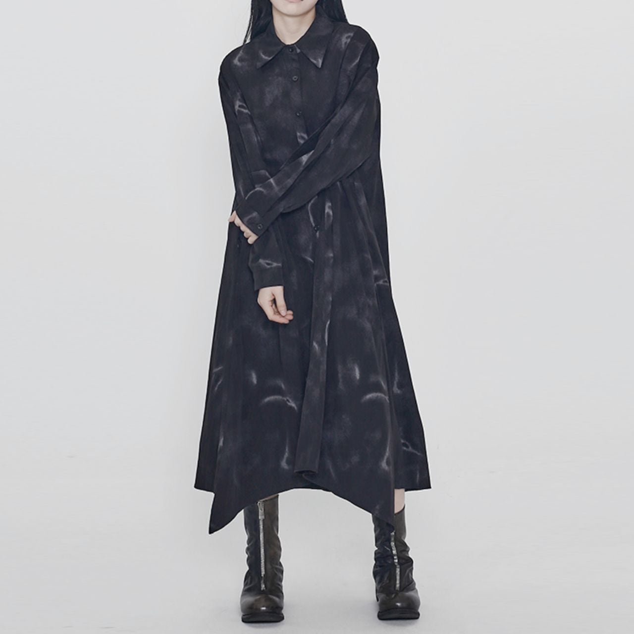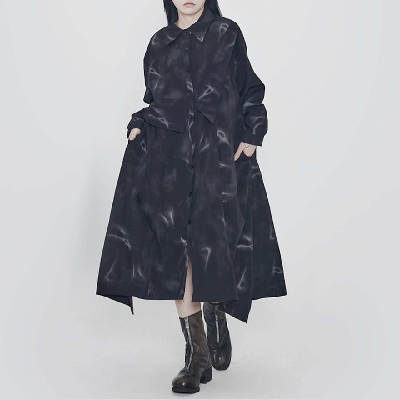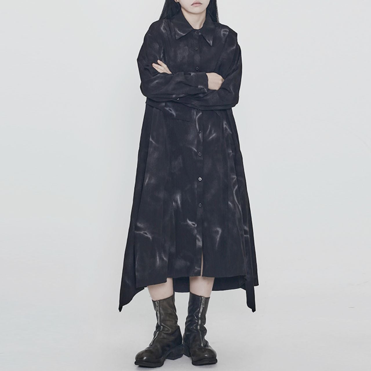 ランダムに配置されたモチーフとアート柄が目を惹くロングシャツドレス。
