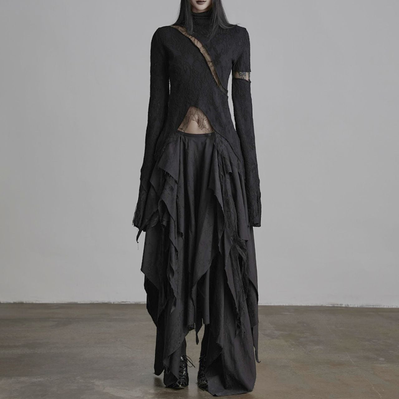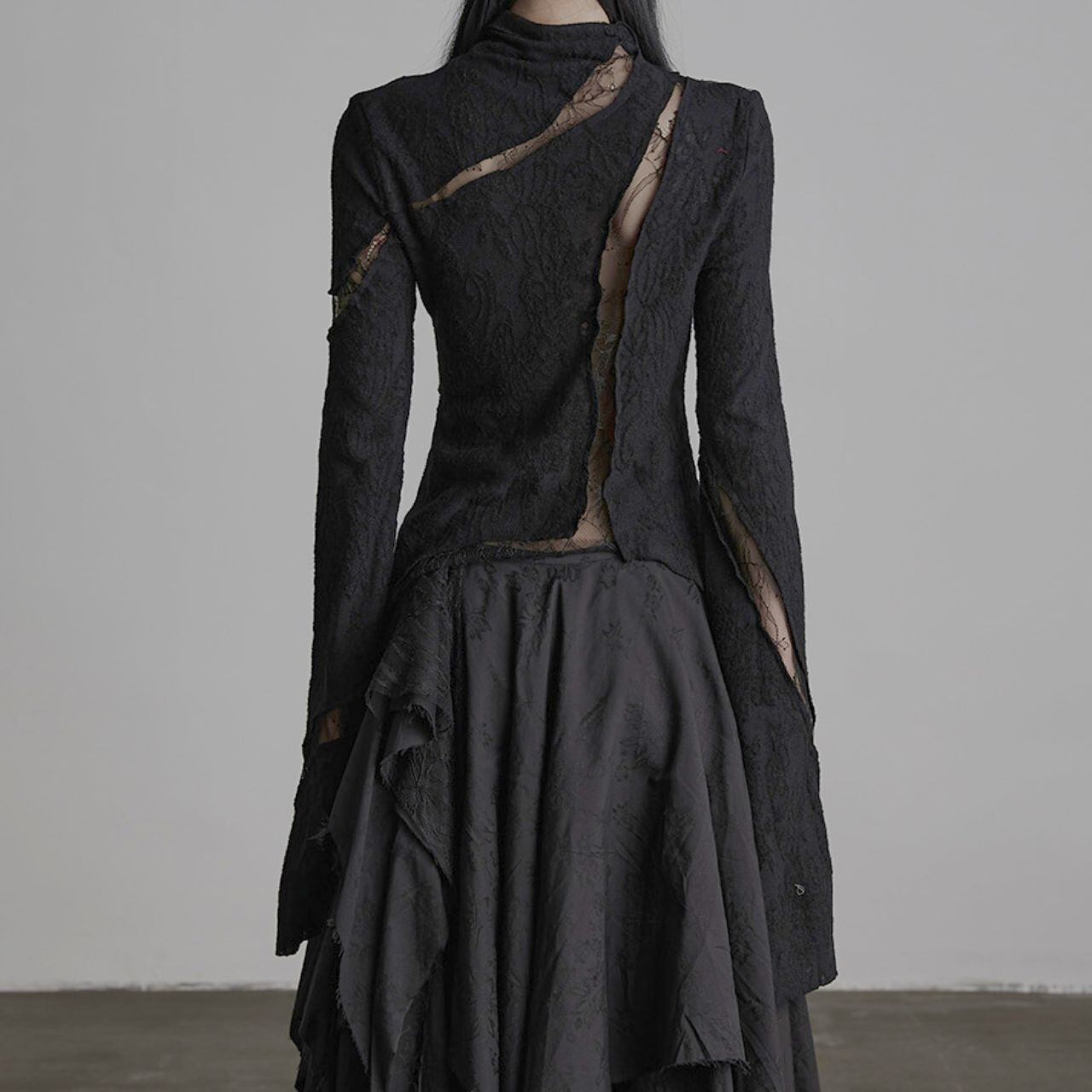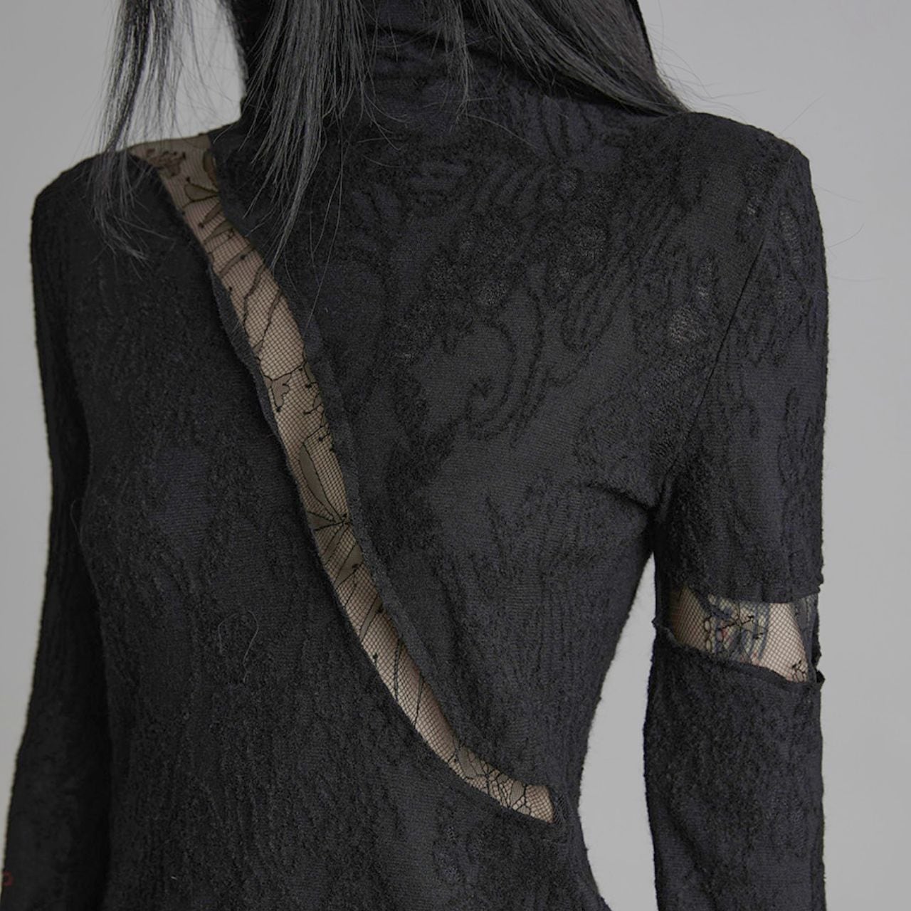 ハイネックのロングスリーブトップスは、大胆なカットアウトデザインが個性を際立たせます。