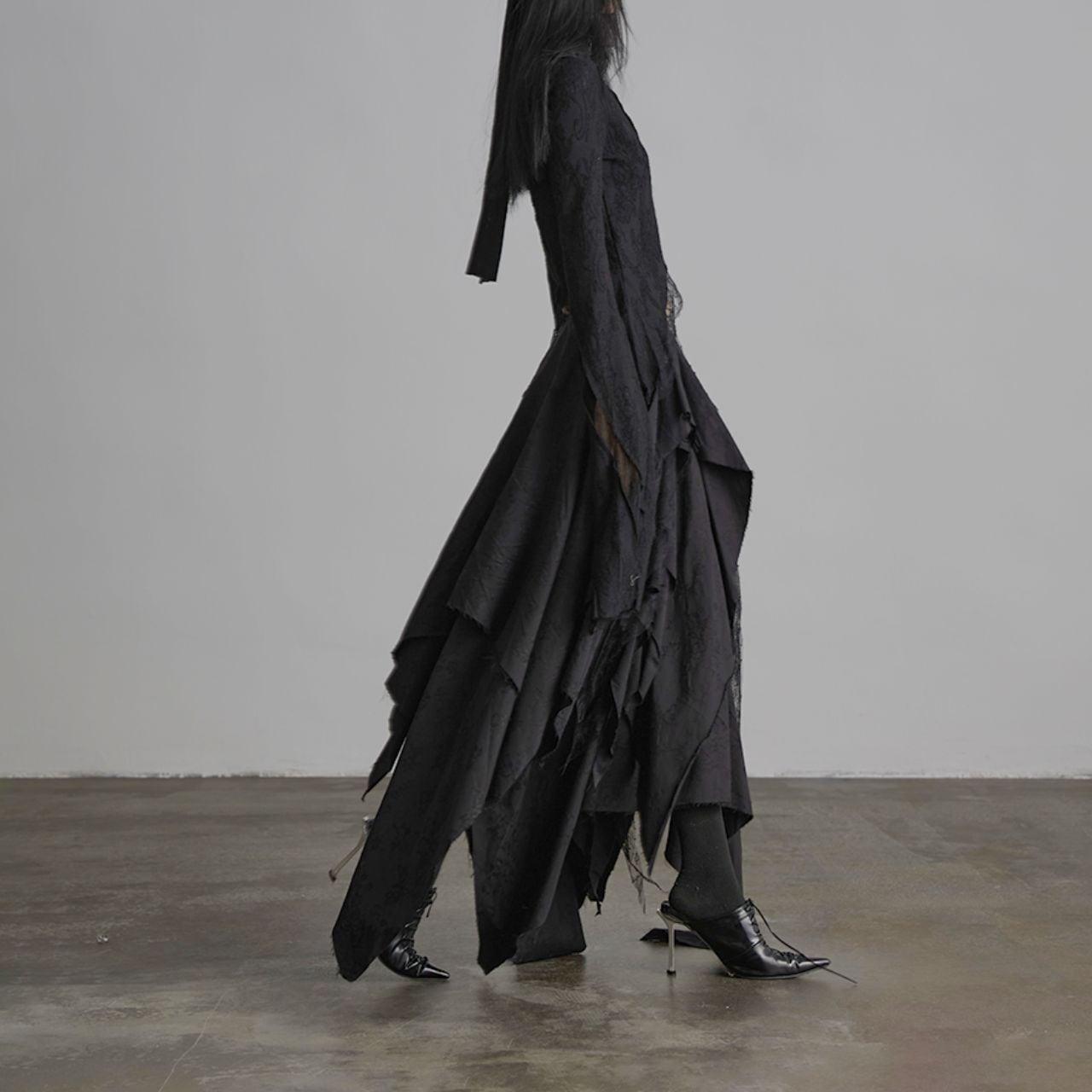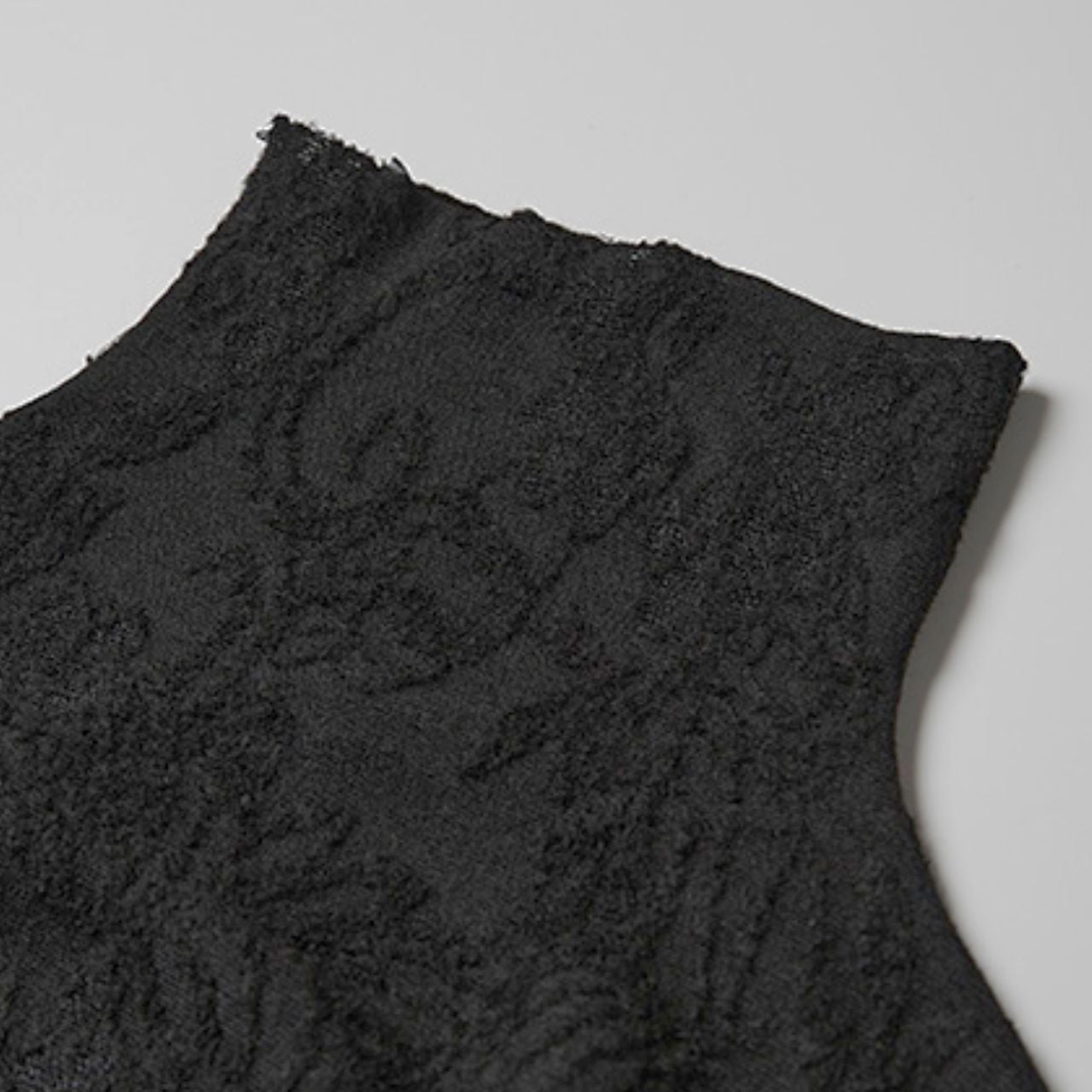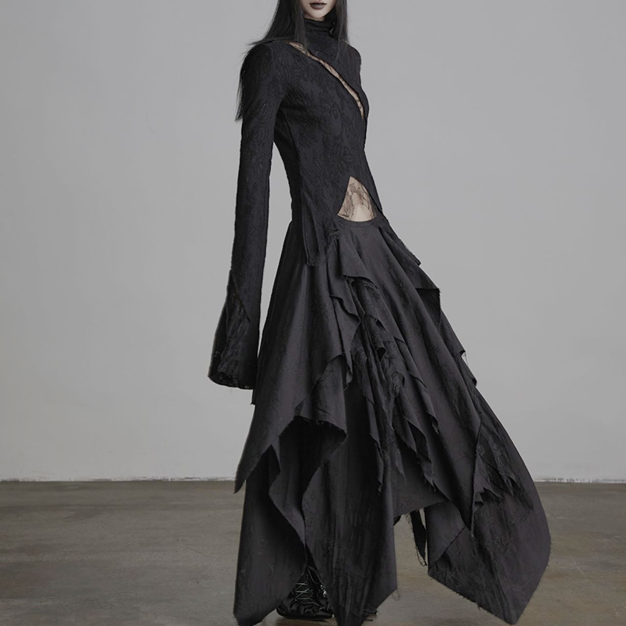 ハイネックのロングスリーブトップスは、大胆なカットアウトデザインが個性を際立たせます。