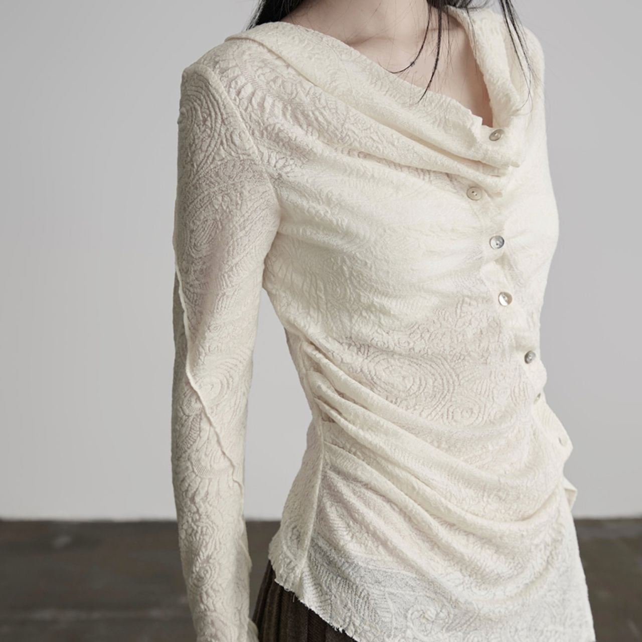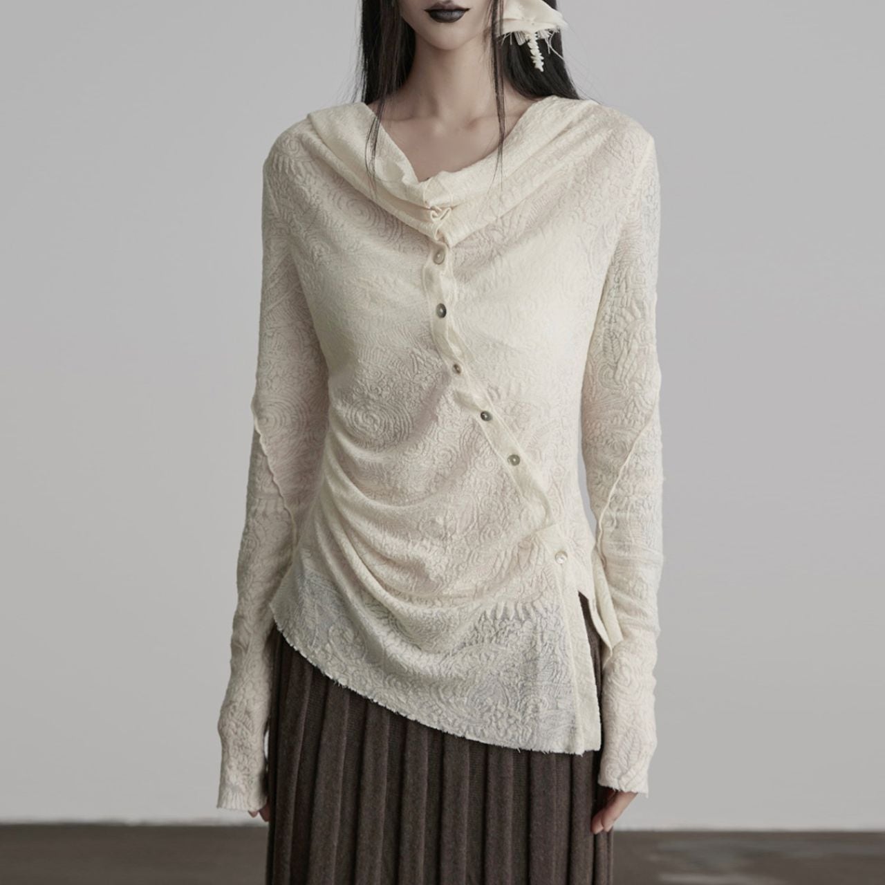 ドレープネックとアシンメトリーなヘムラインが特徴的なニットトップス。