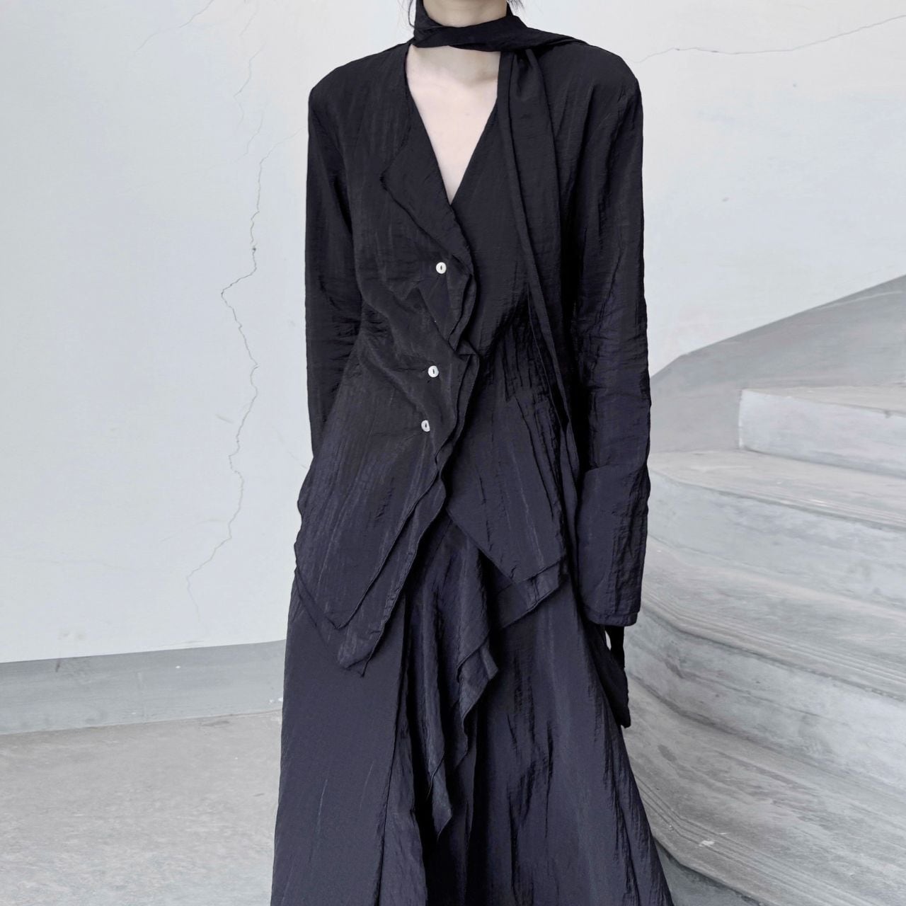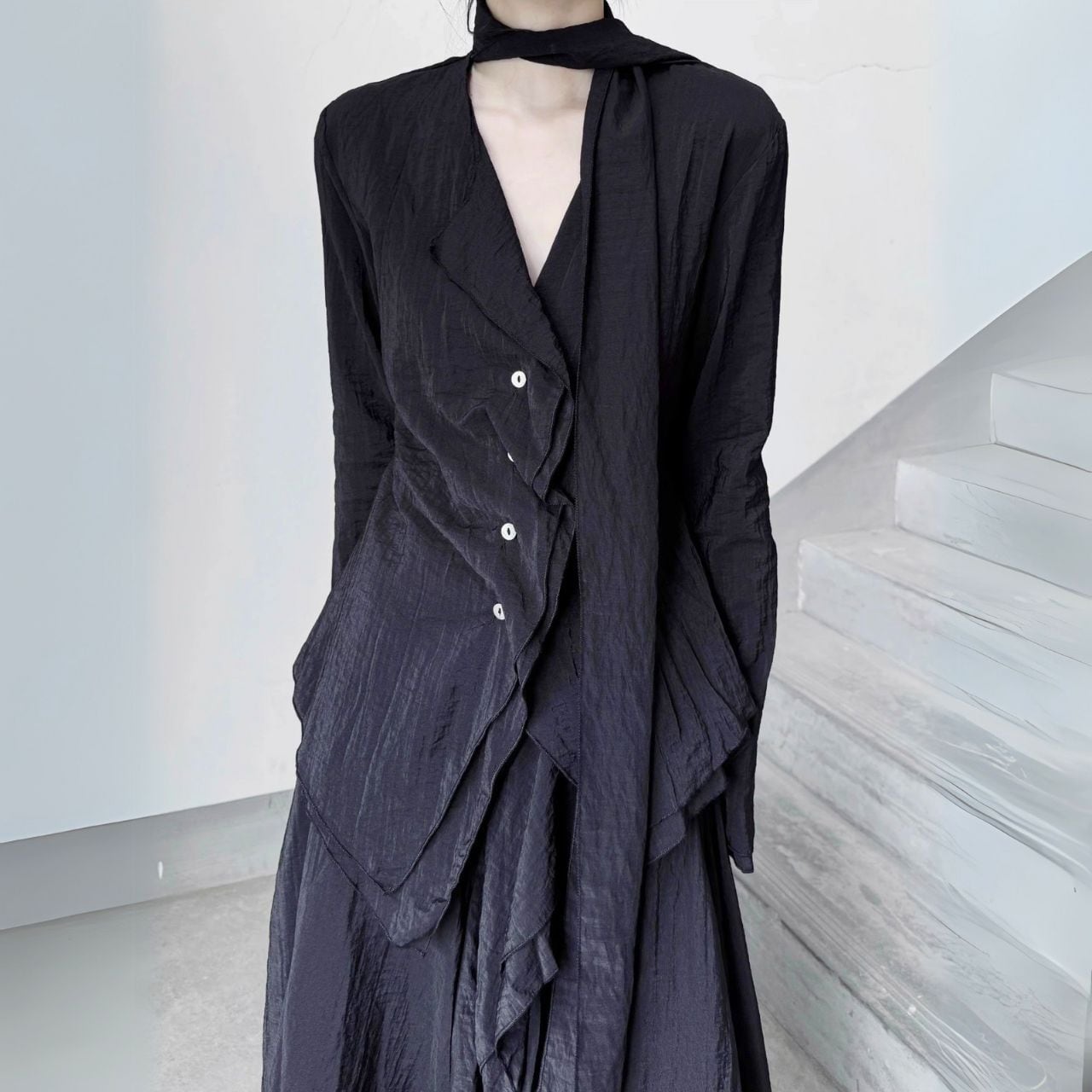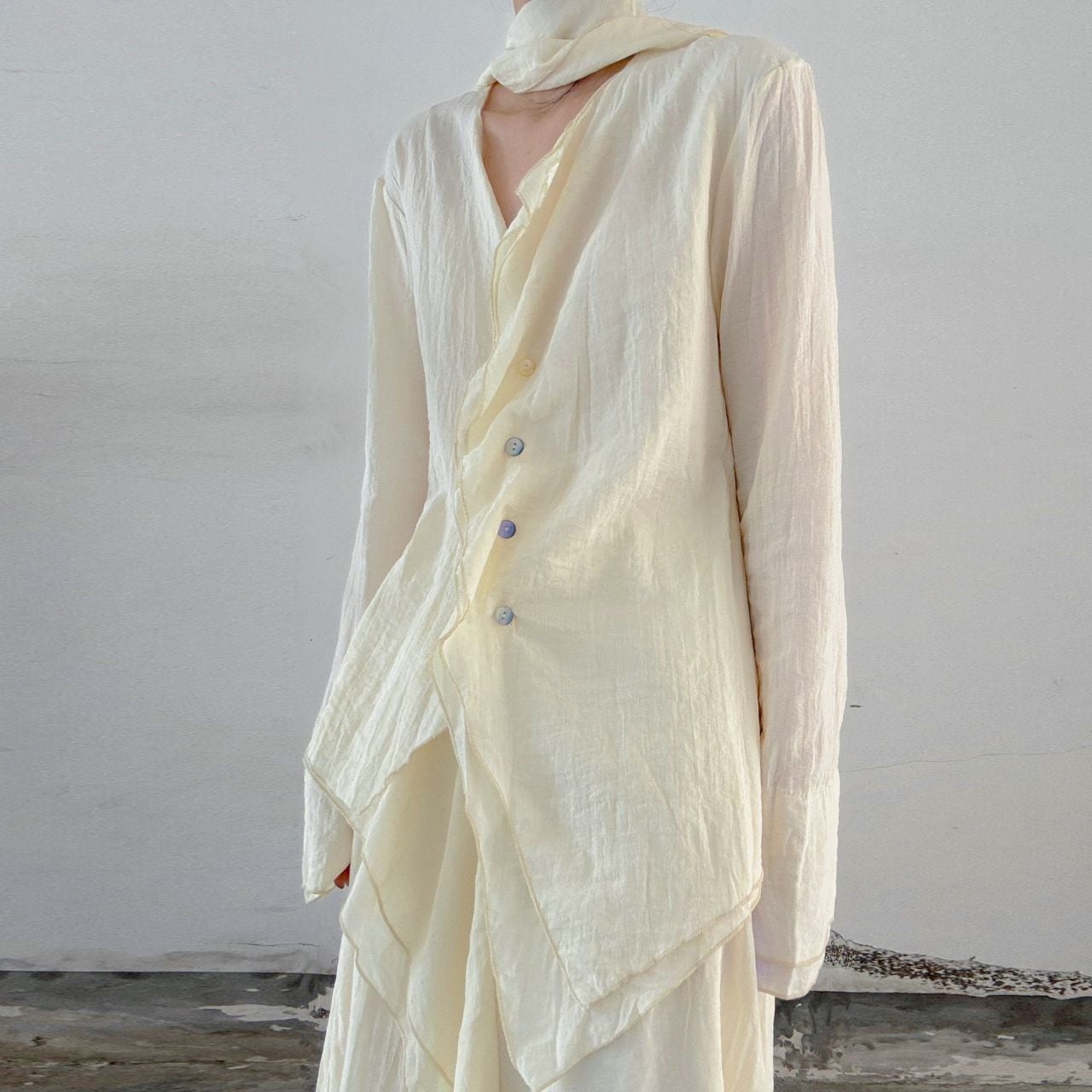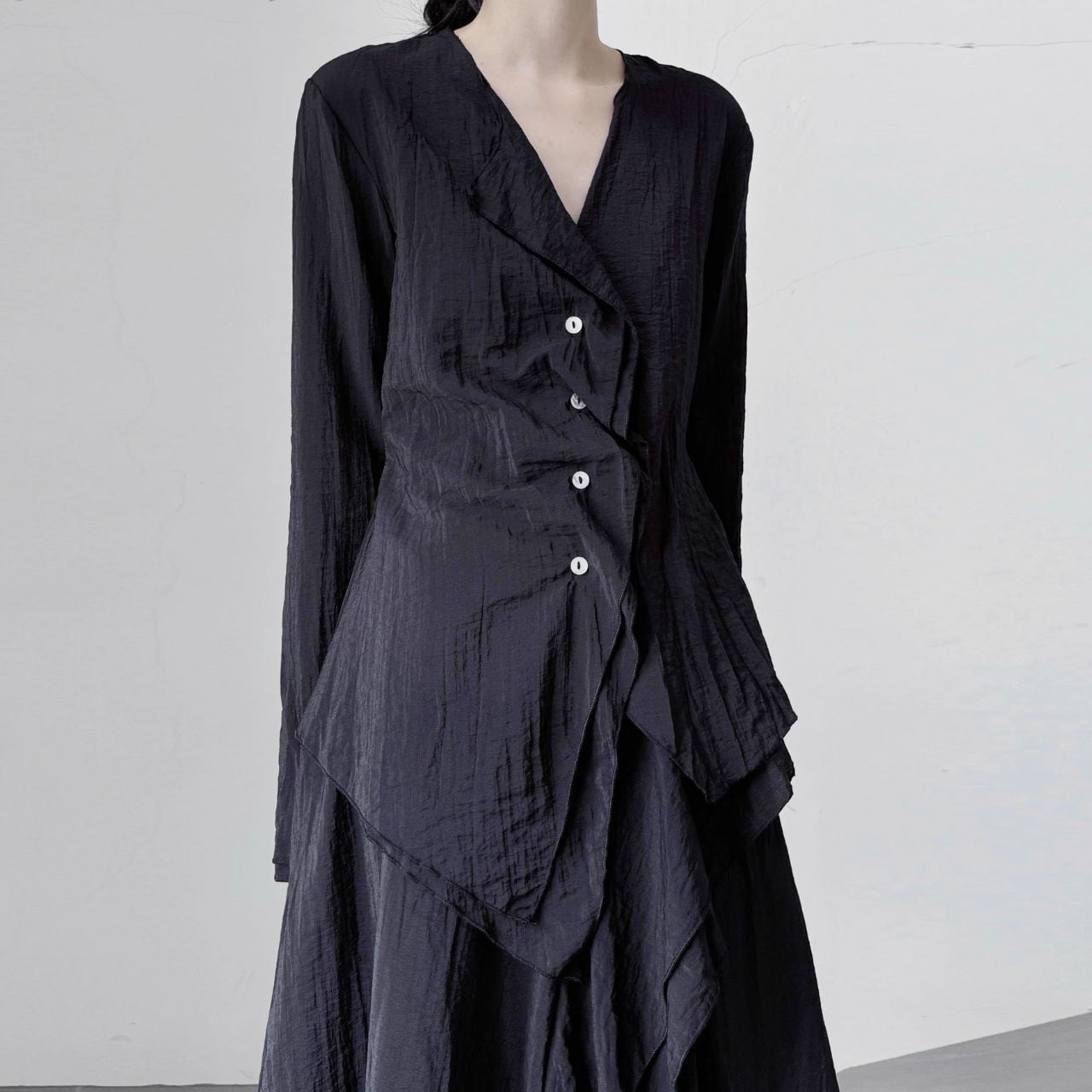 非対称のデザインが魅力的な、ウエストを美しく見せるブラウス。