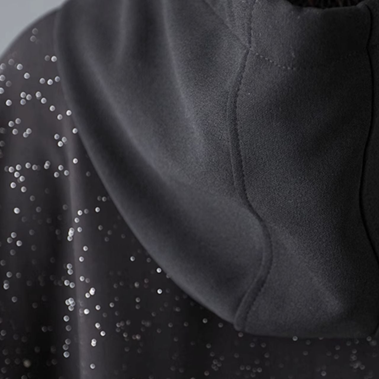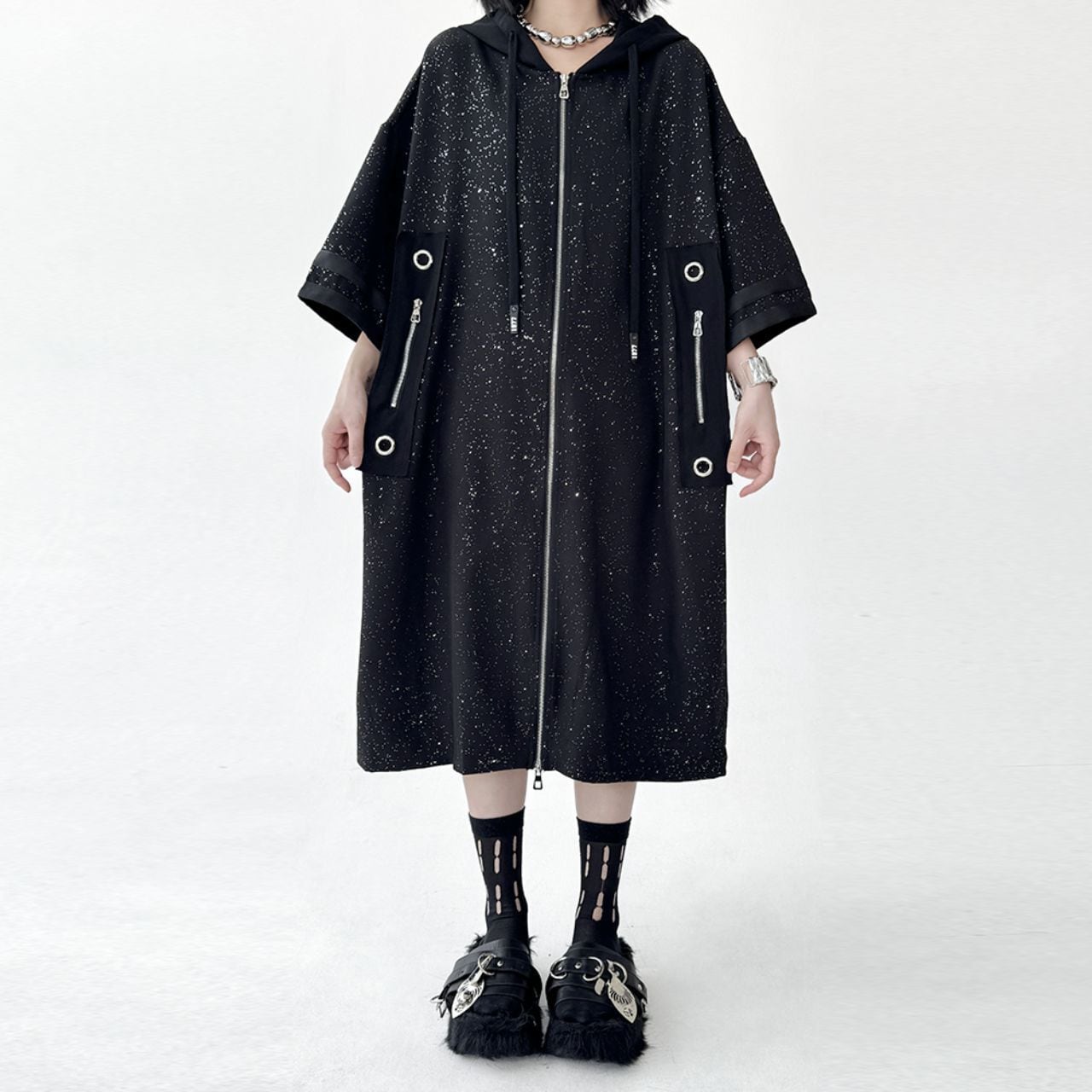 フード付きでカジュアルな着こなしにも、ひざ丈のAラインシルエットで女性らしさも演出します。