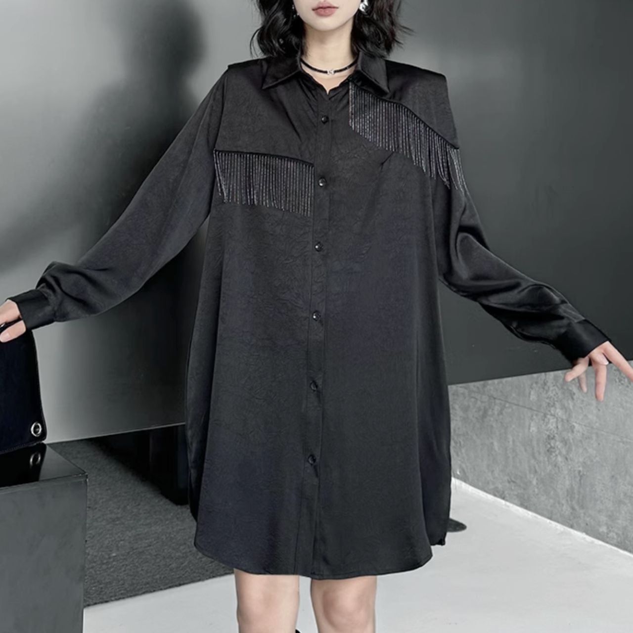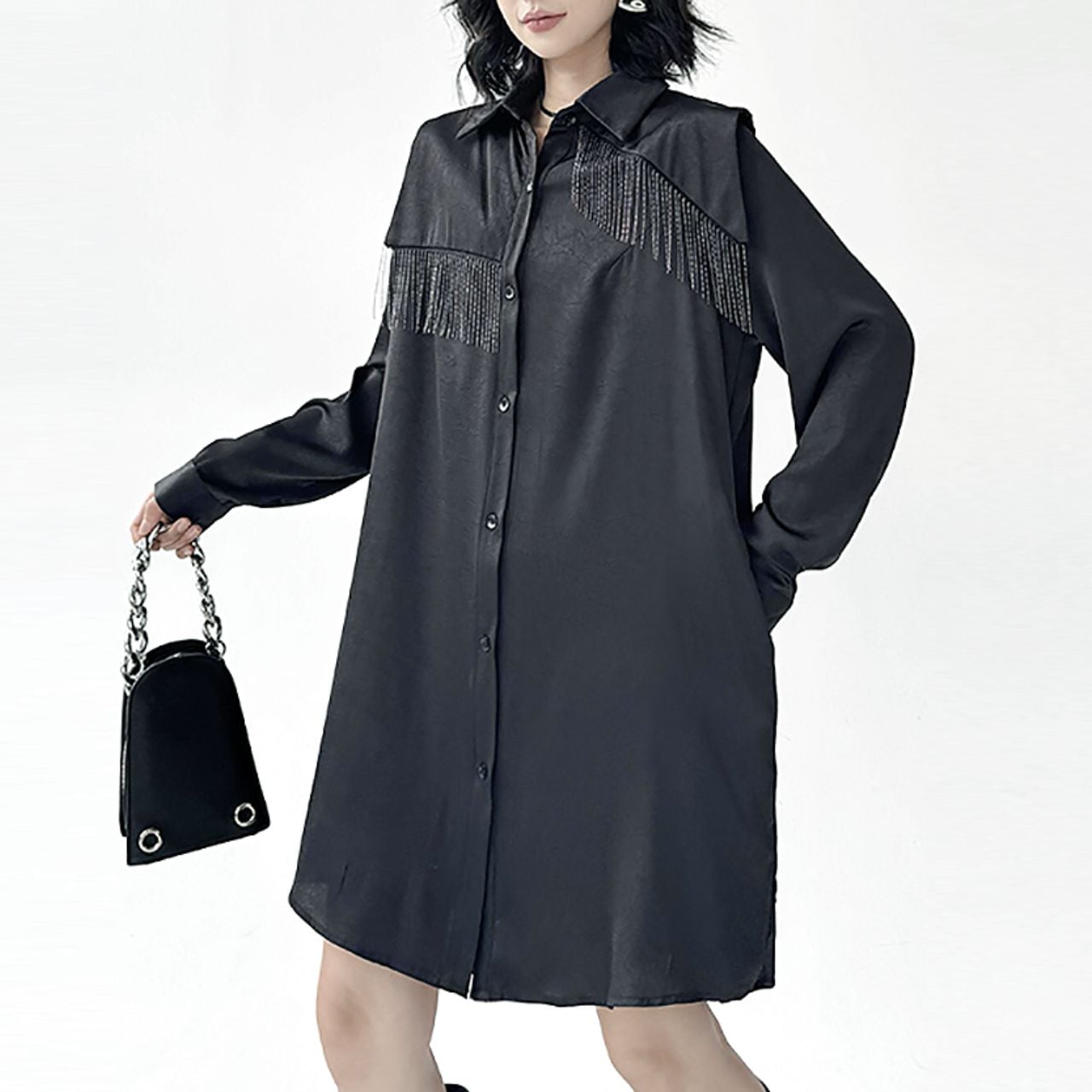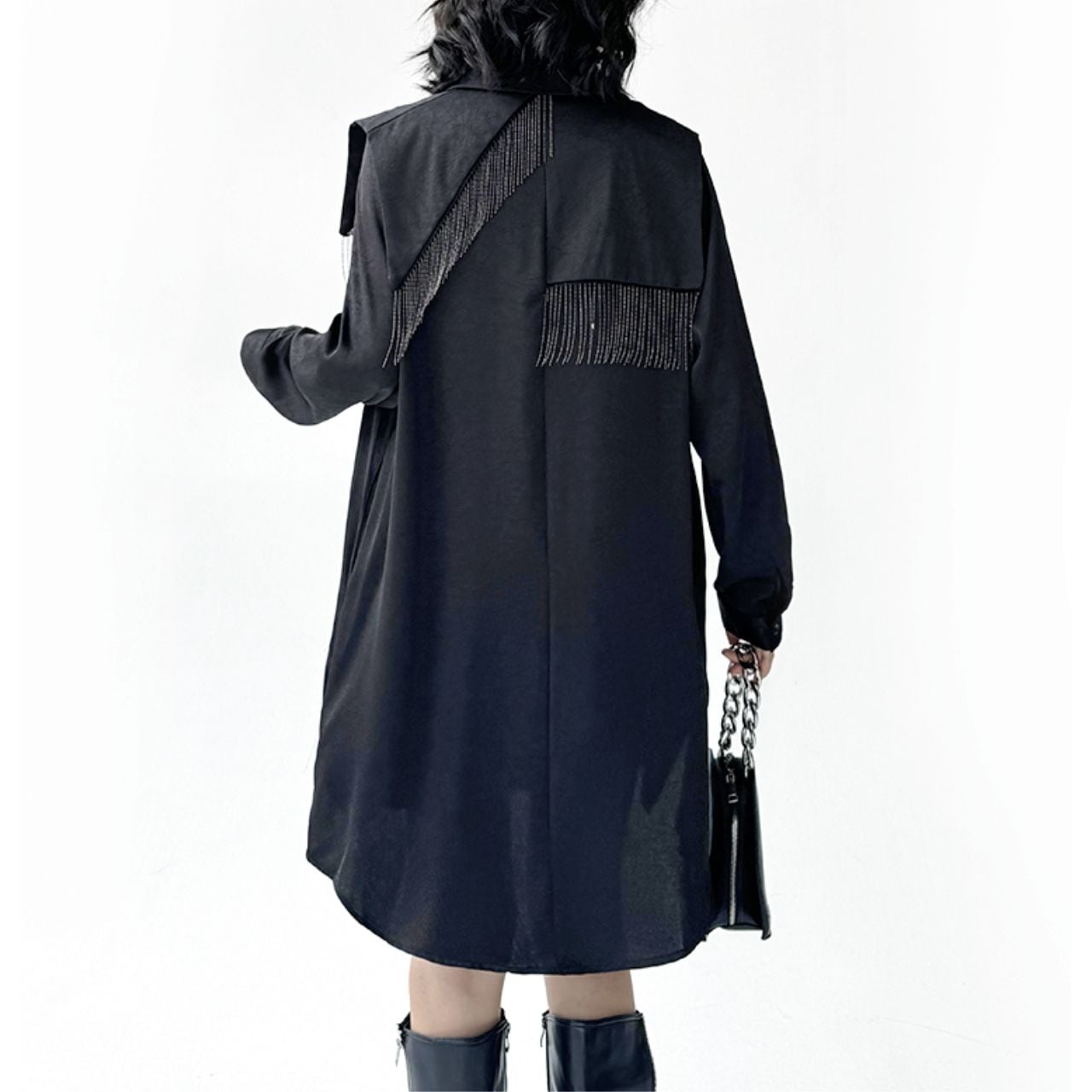 フリンジのアクセントが目を惹く、一枚でスタイリングが決まるロングシャツワンピース。