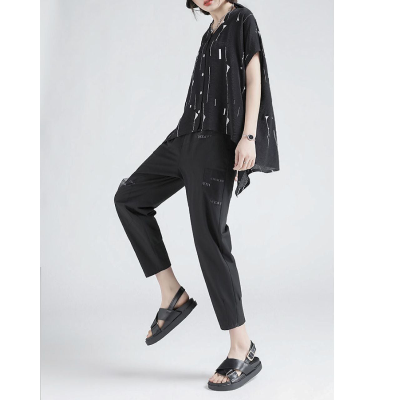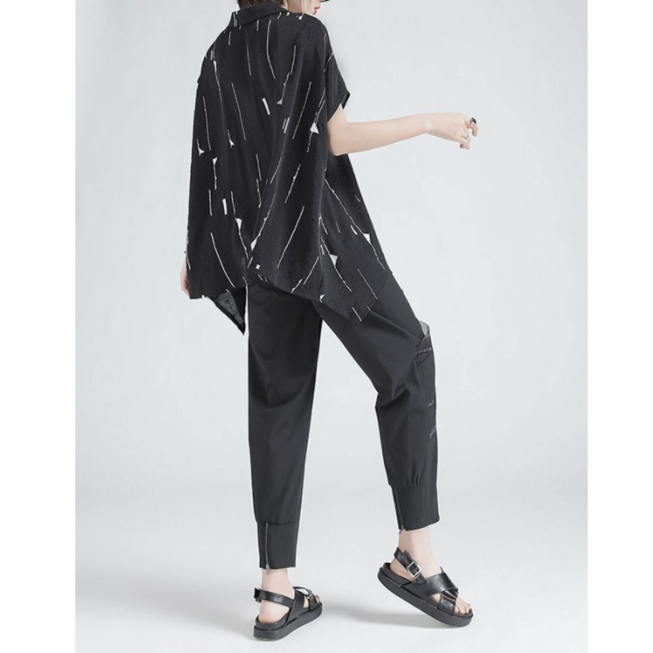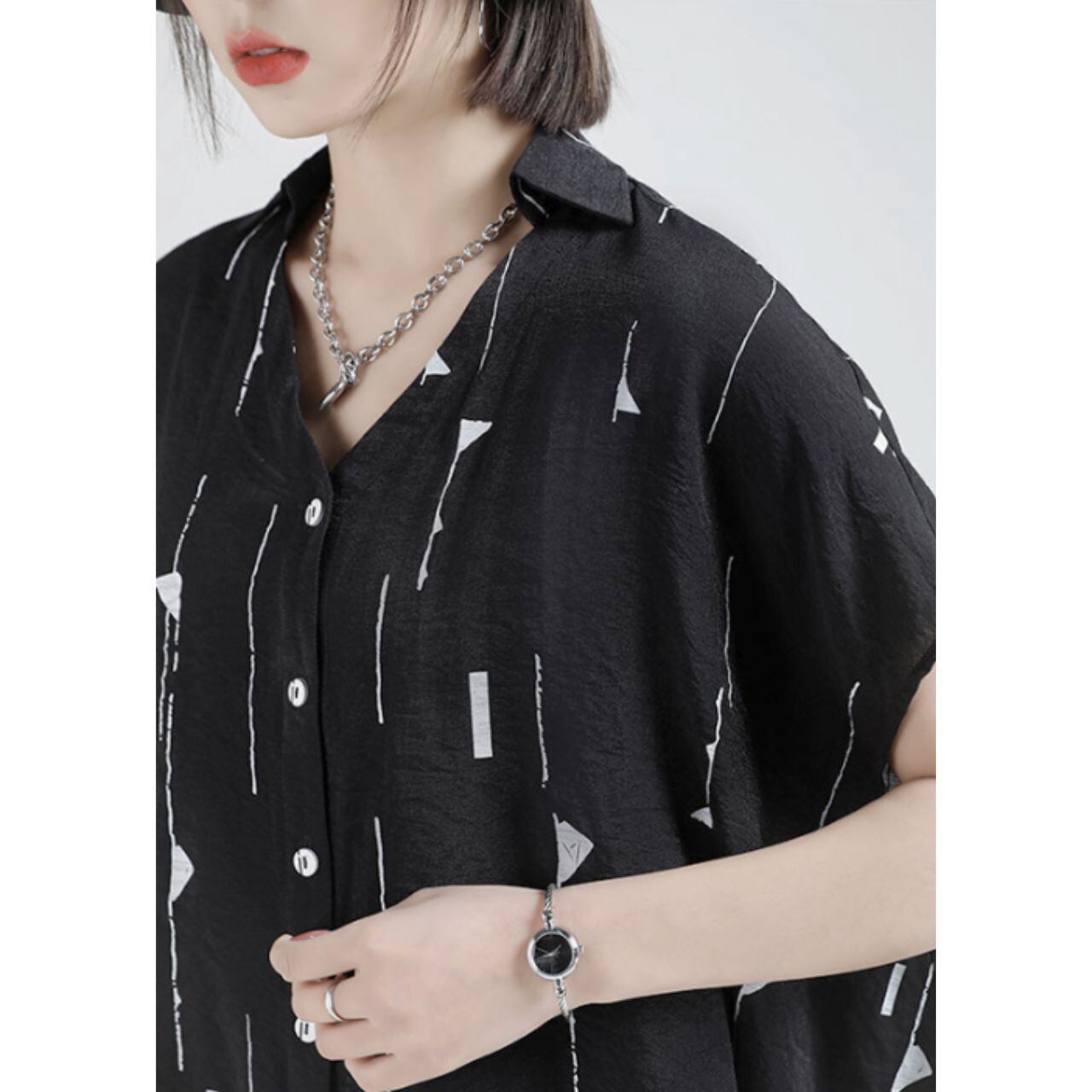 幾何学模様が印象的なオープンカラーシャツブラウス。