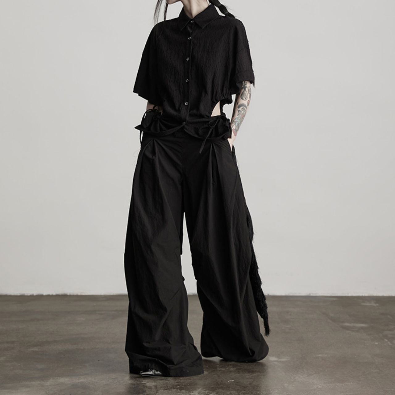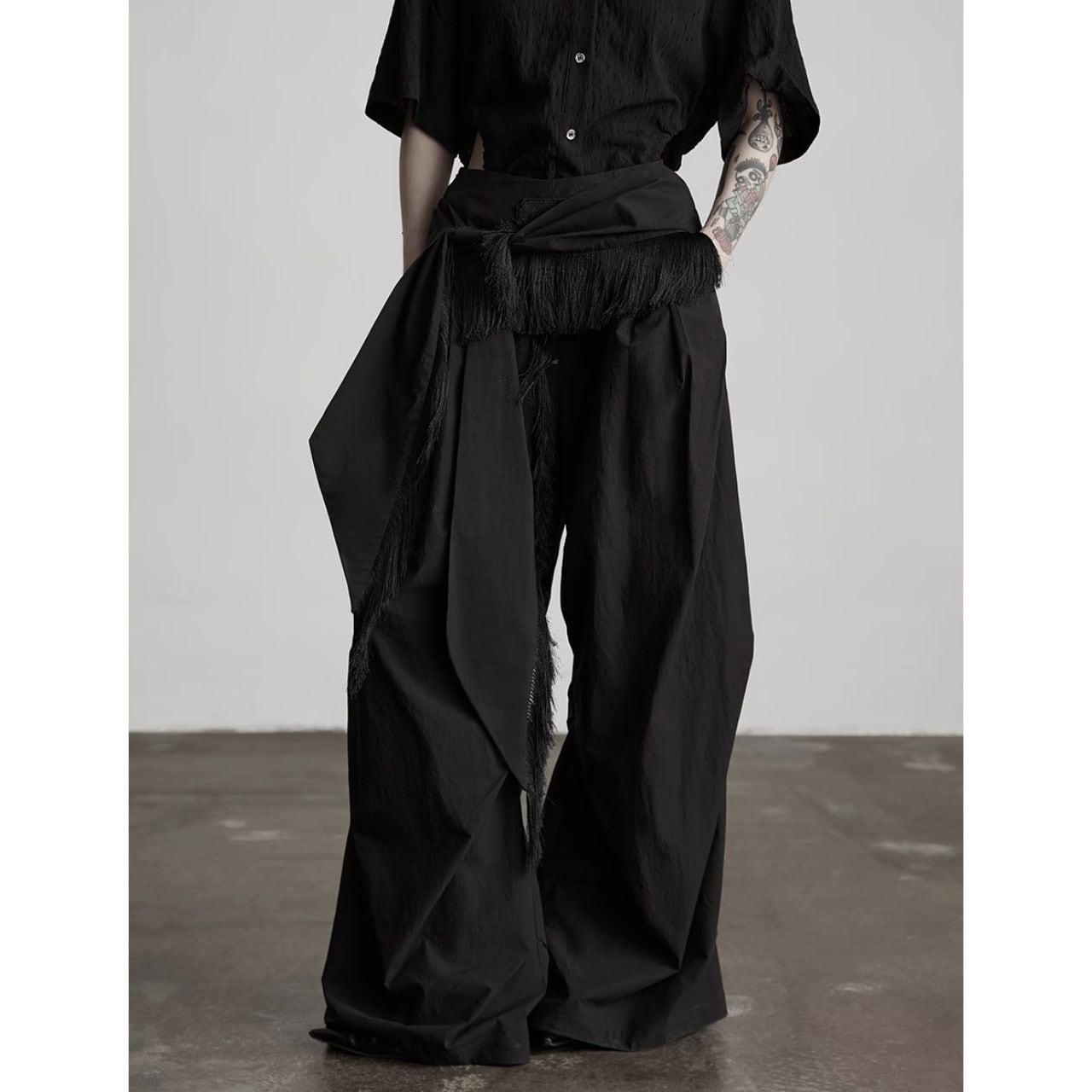 独特のタッセルデザインが目を惹くワイドパンツ。