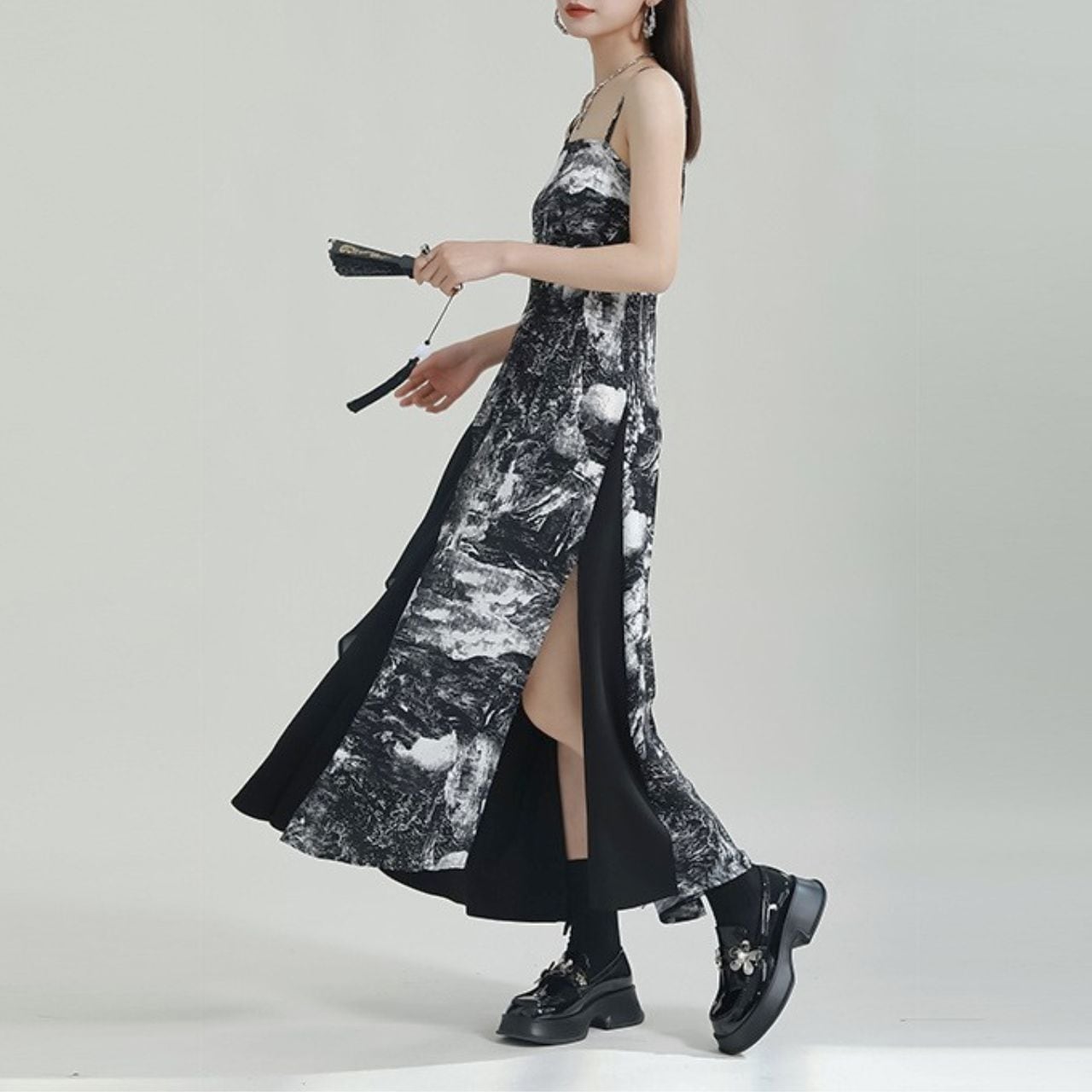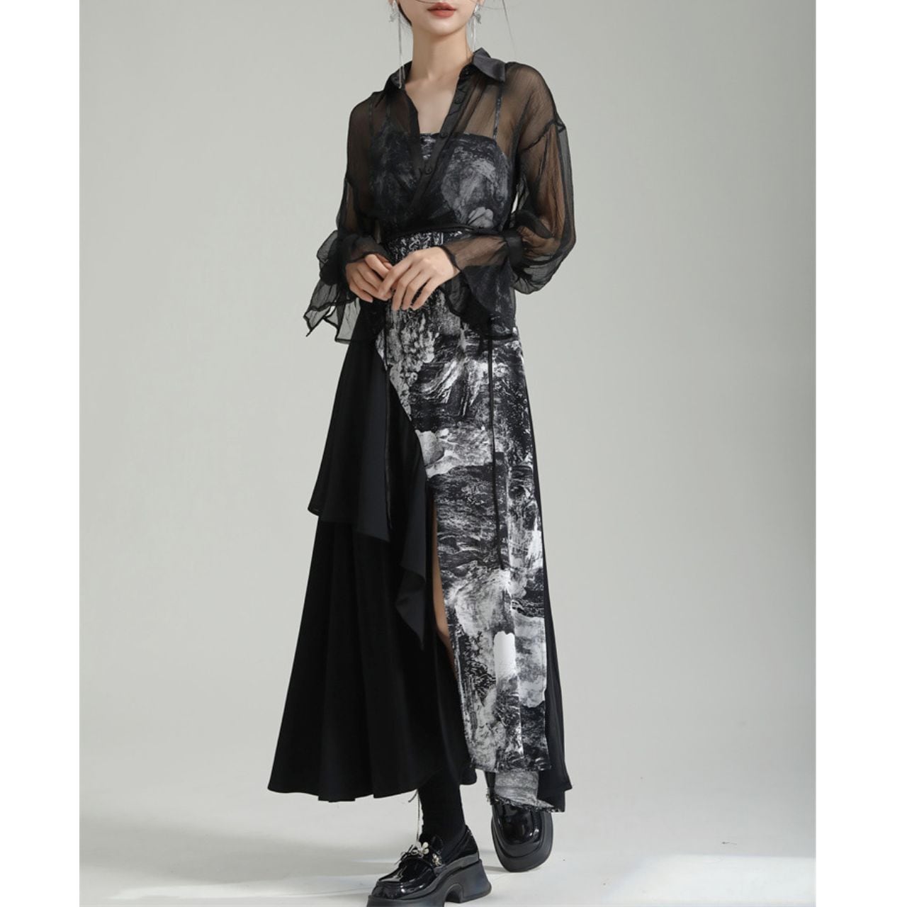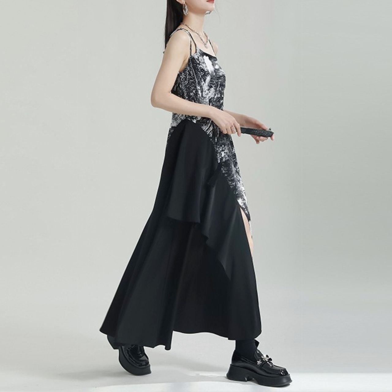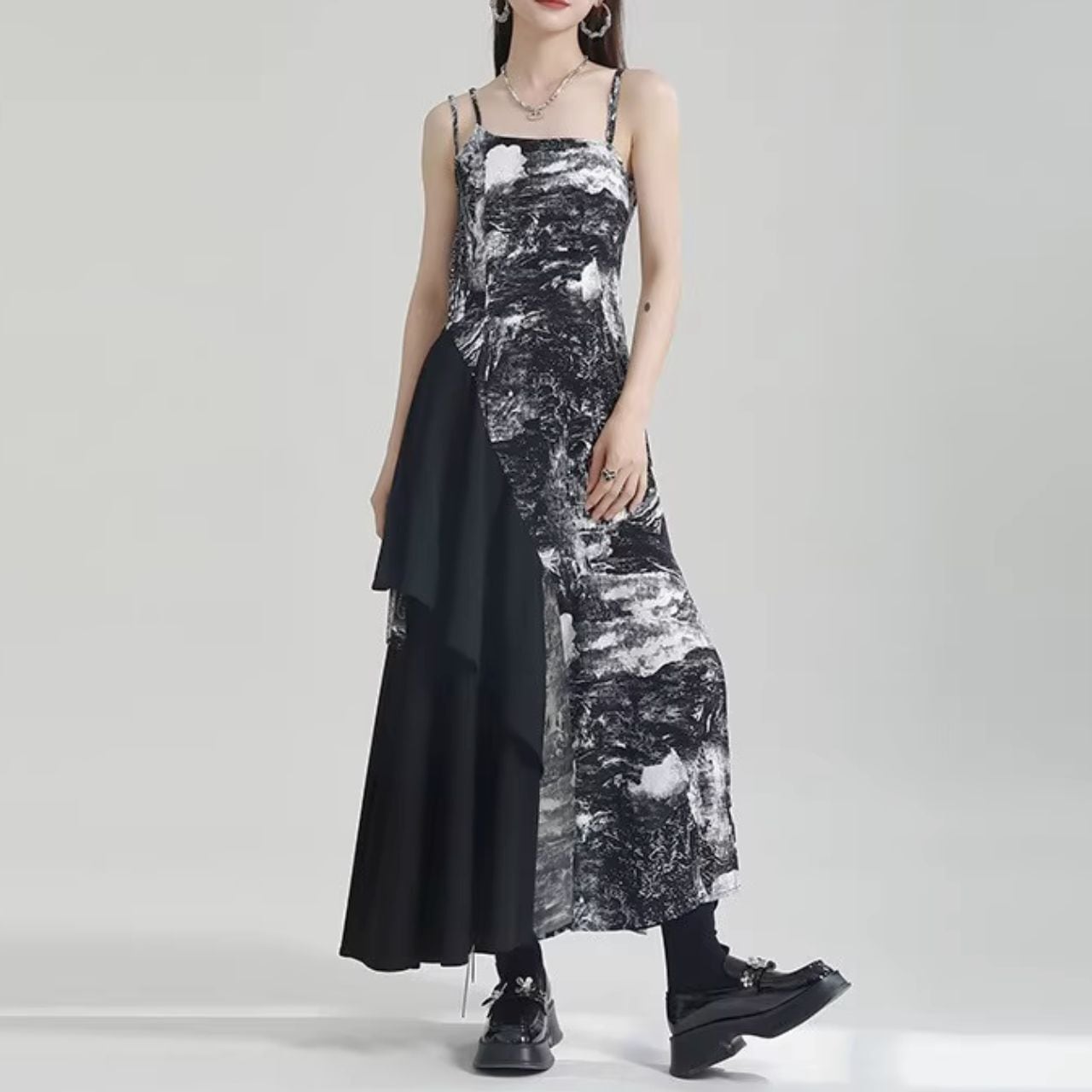 大胆なアシンメトリーデザインが特徴のロングワンピース。