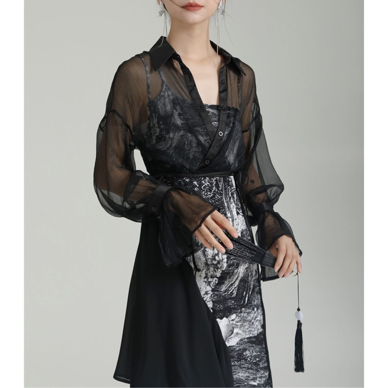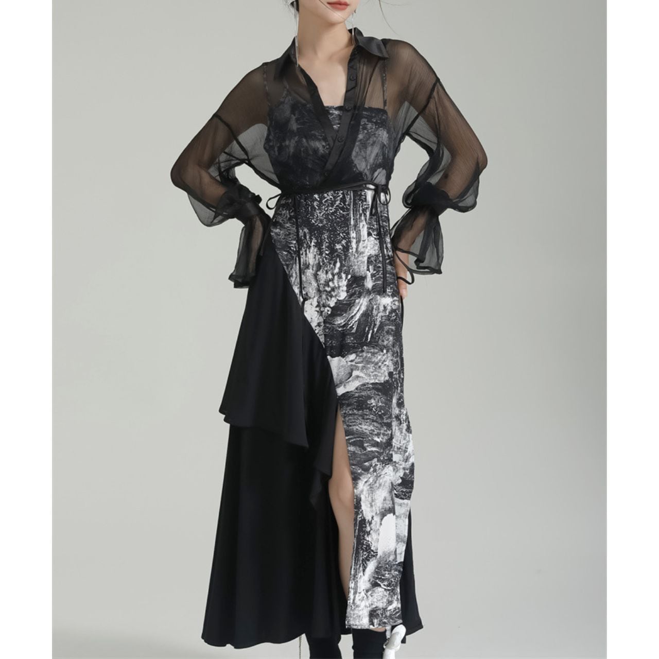 部分的にレイヤードされたデザインが、動きのあるシルエットを生み出します。