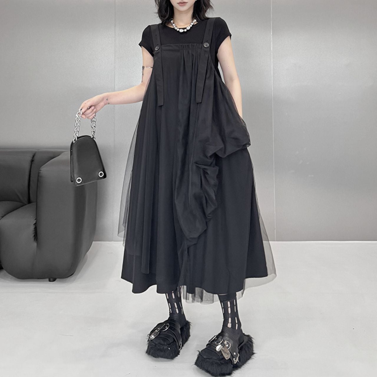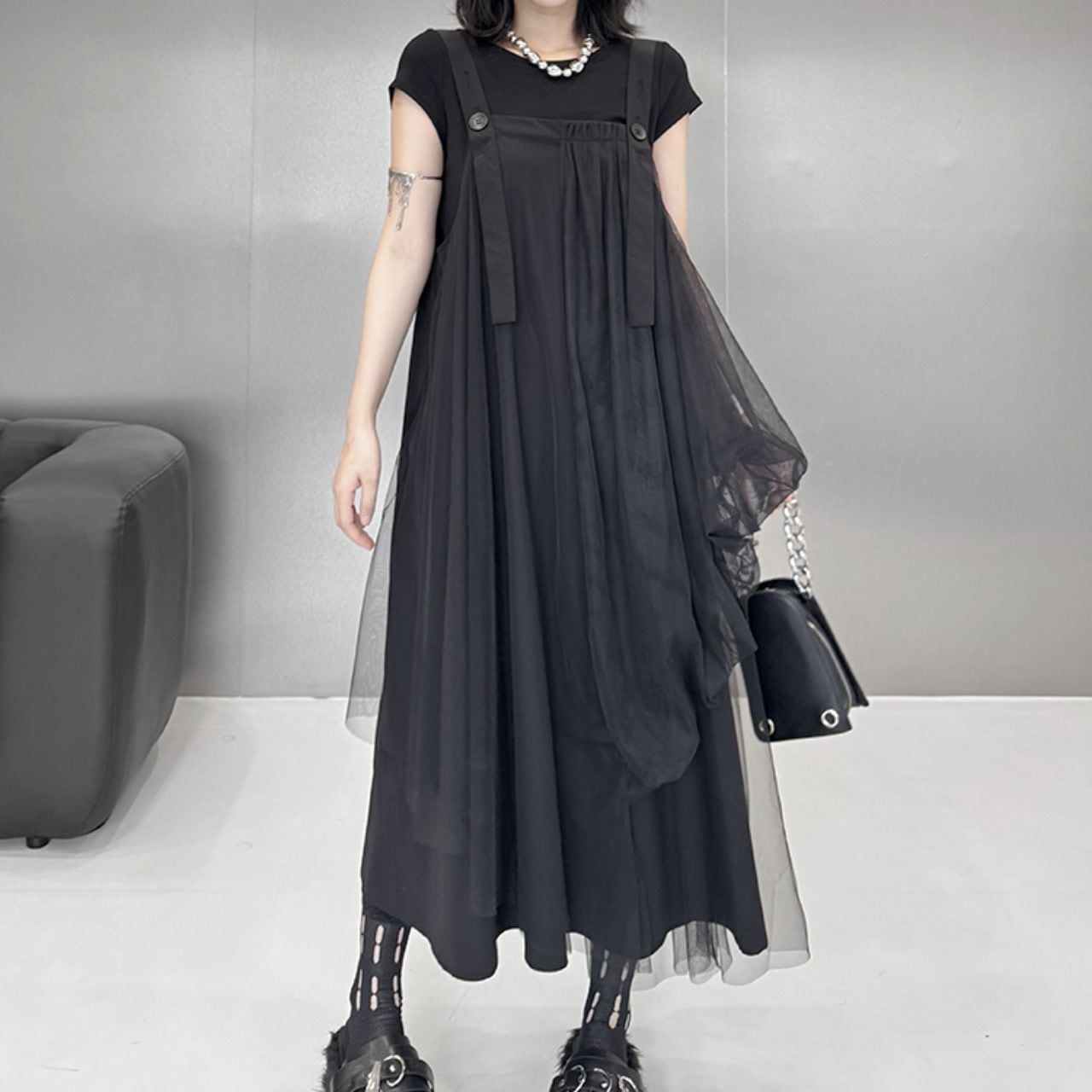 Aラインシルエットのオーバーラップデザインが目を惹くロング丈サスペンダードレス。