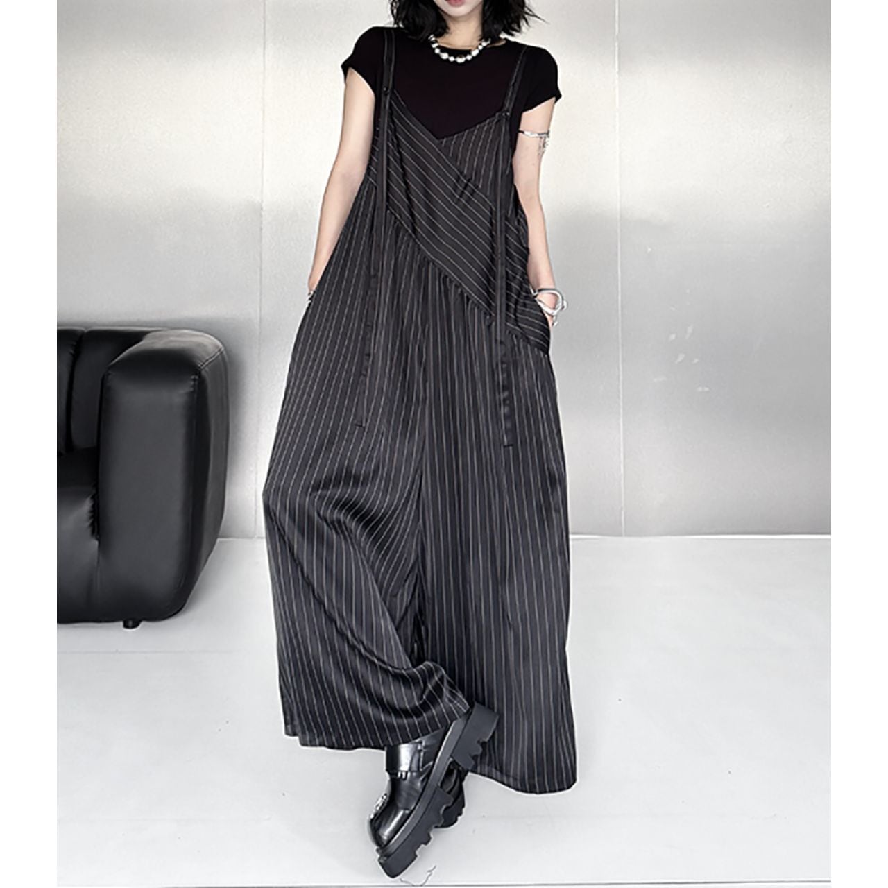 洗練されたストライプ柄が目を惹くワイドサロペット。