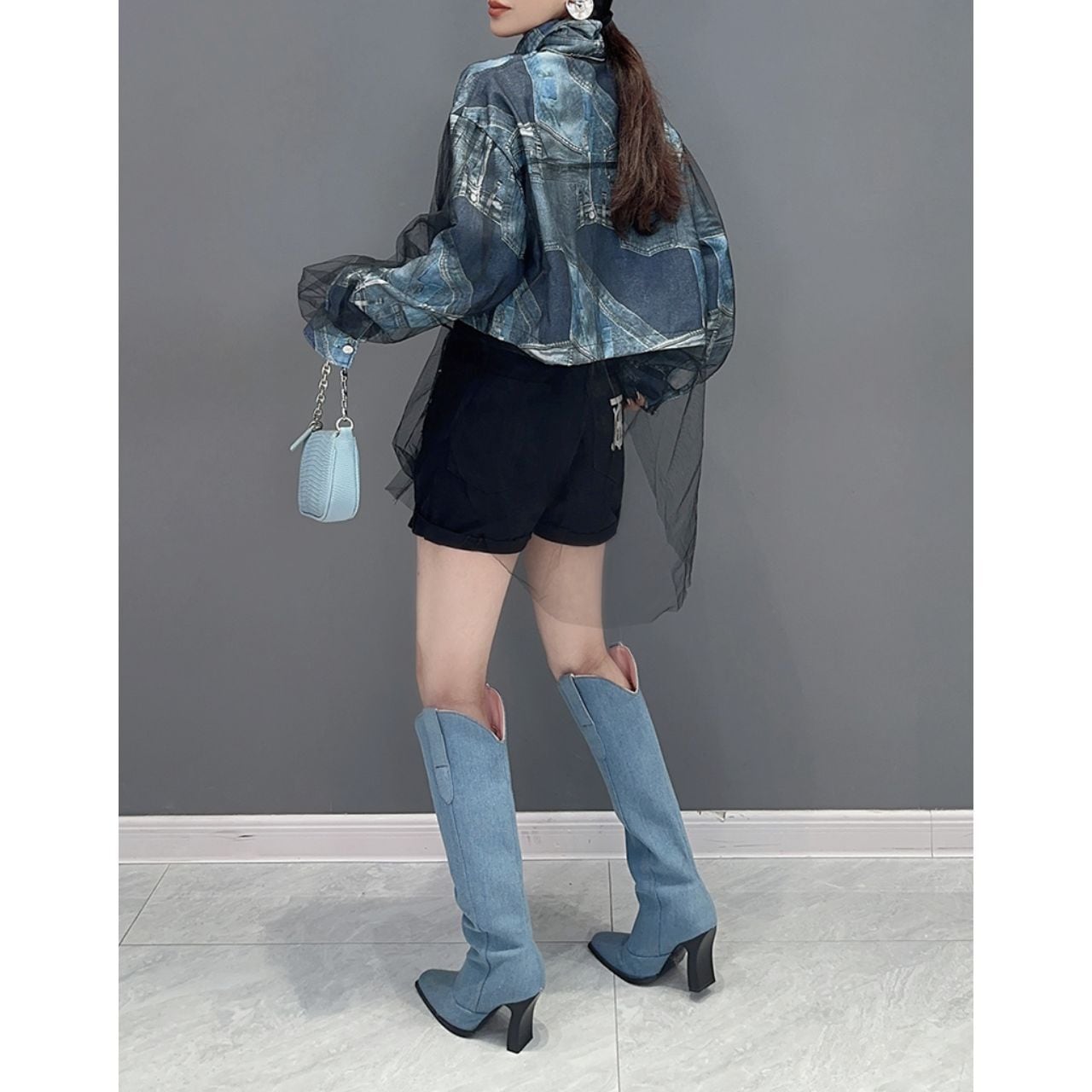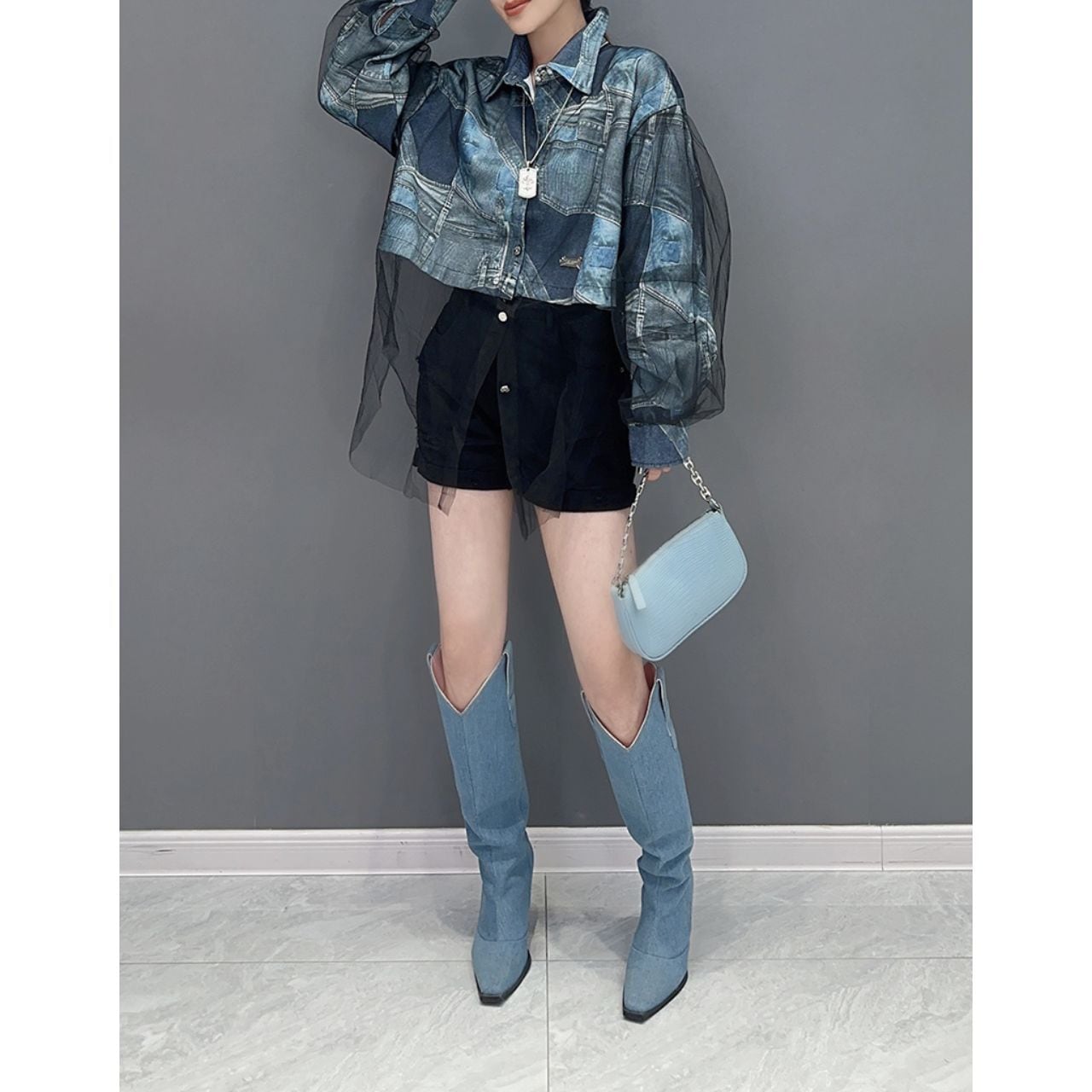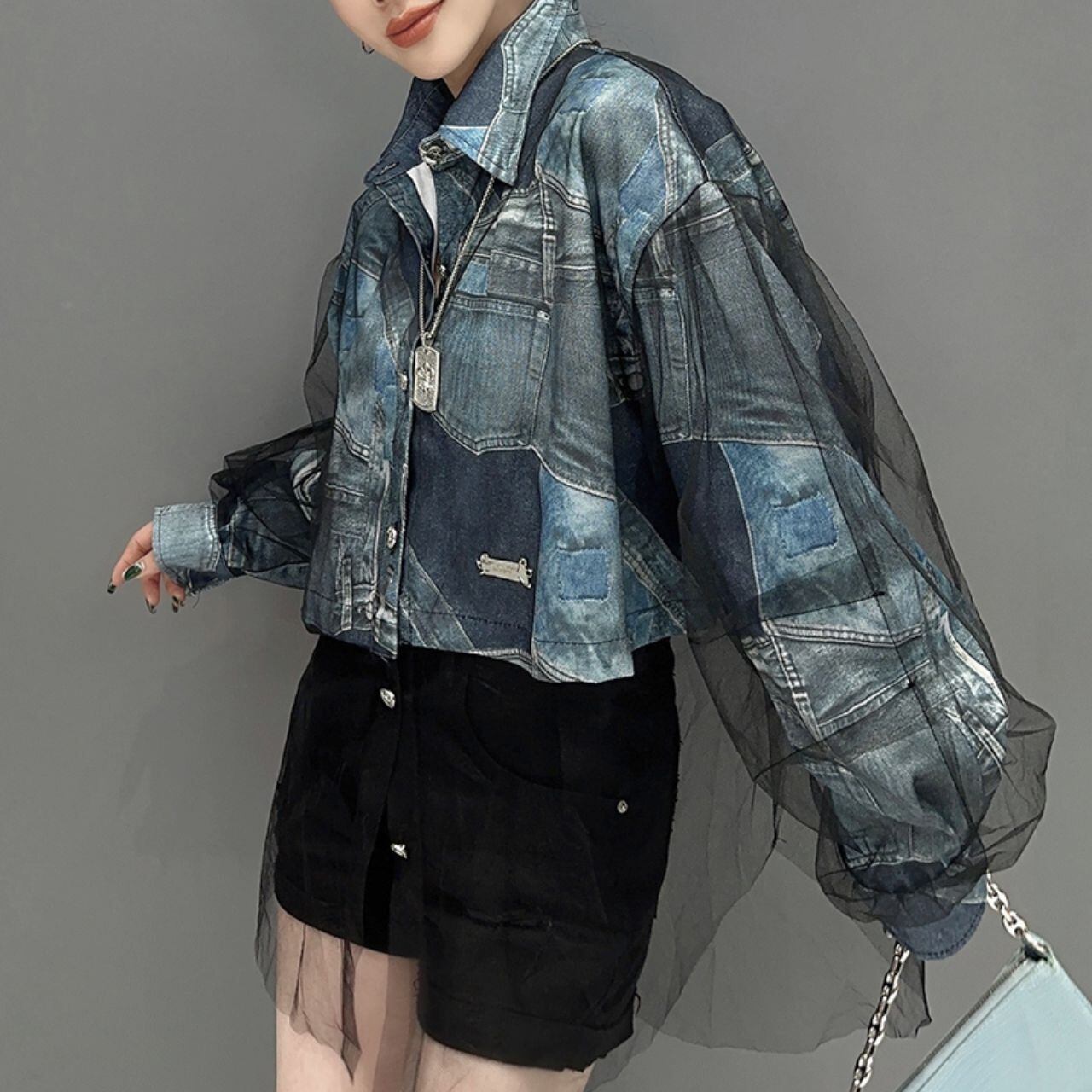 大胆なデニムプリントが目を引く、オーバーサイズシャツ。