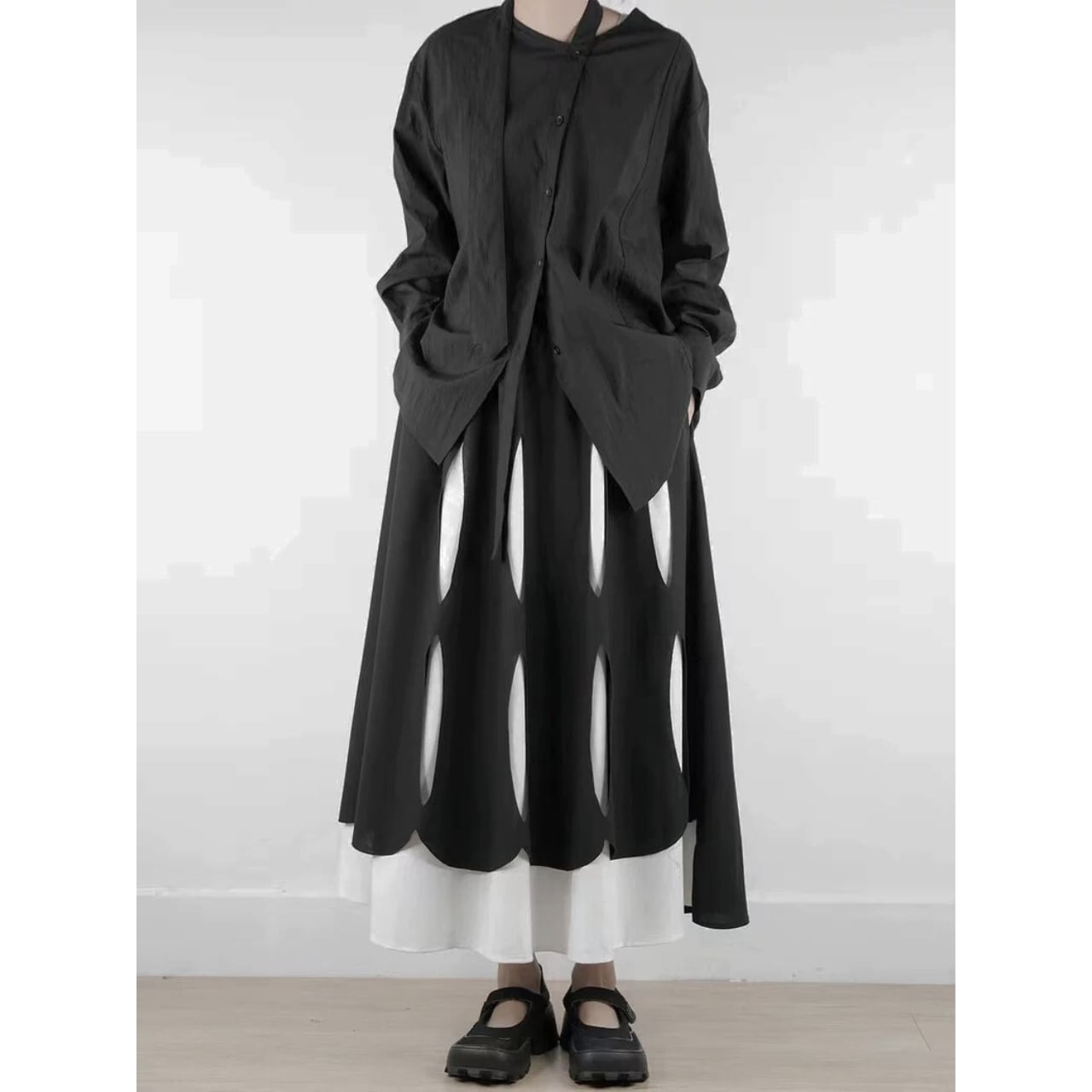 前面に縦長のカットアウトを施したレイヤードデザインのスカート。