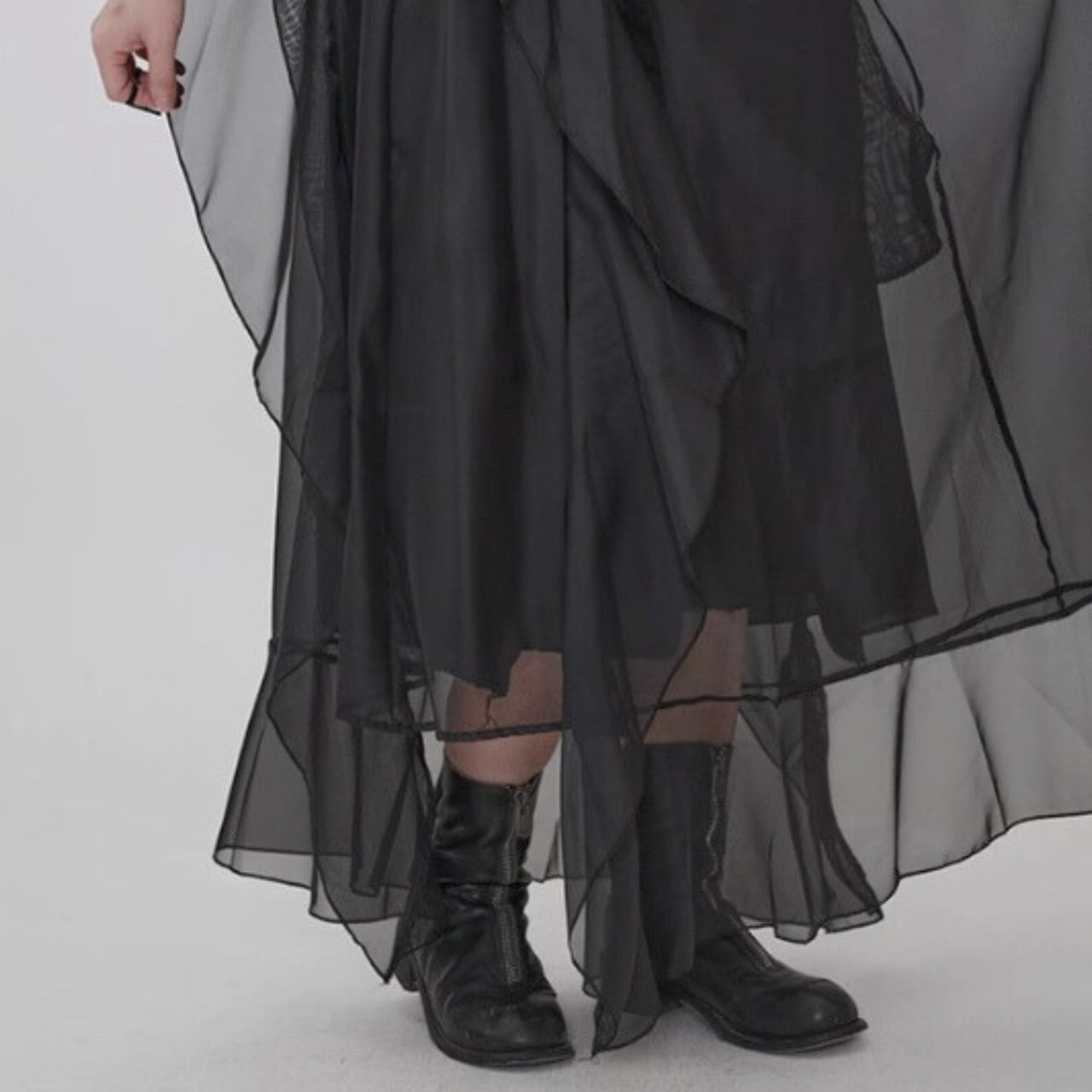 サイドに流れるフリルが動きにニュアンスを加え、アシンメトリーなデザインが立体感を演出します。