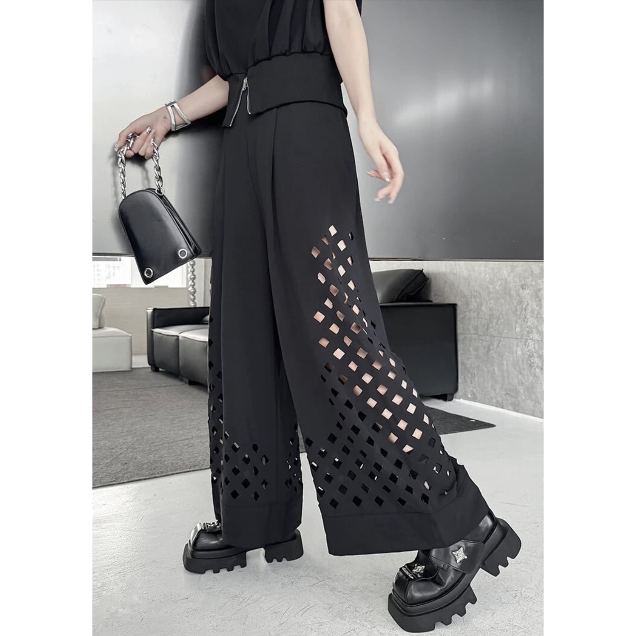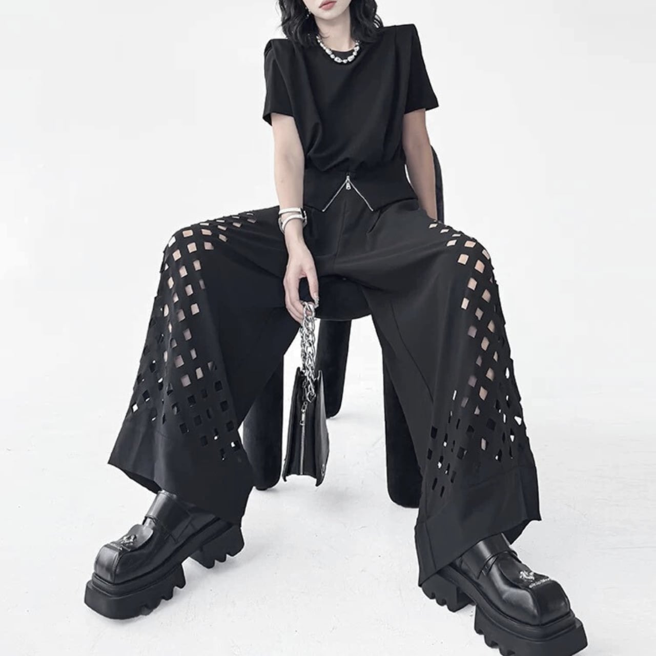 幾何カットが際立つ、ハイウエストのワイドパンツ。