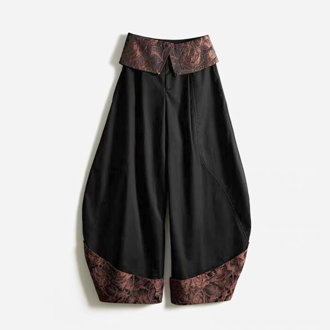ウエストと裾に大胆なローズ柄の折り返しをあしらったワイドパンツ。