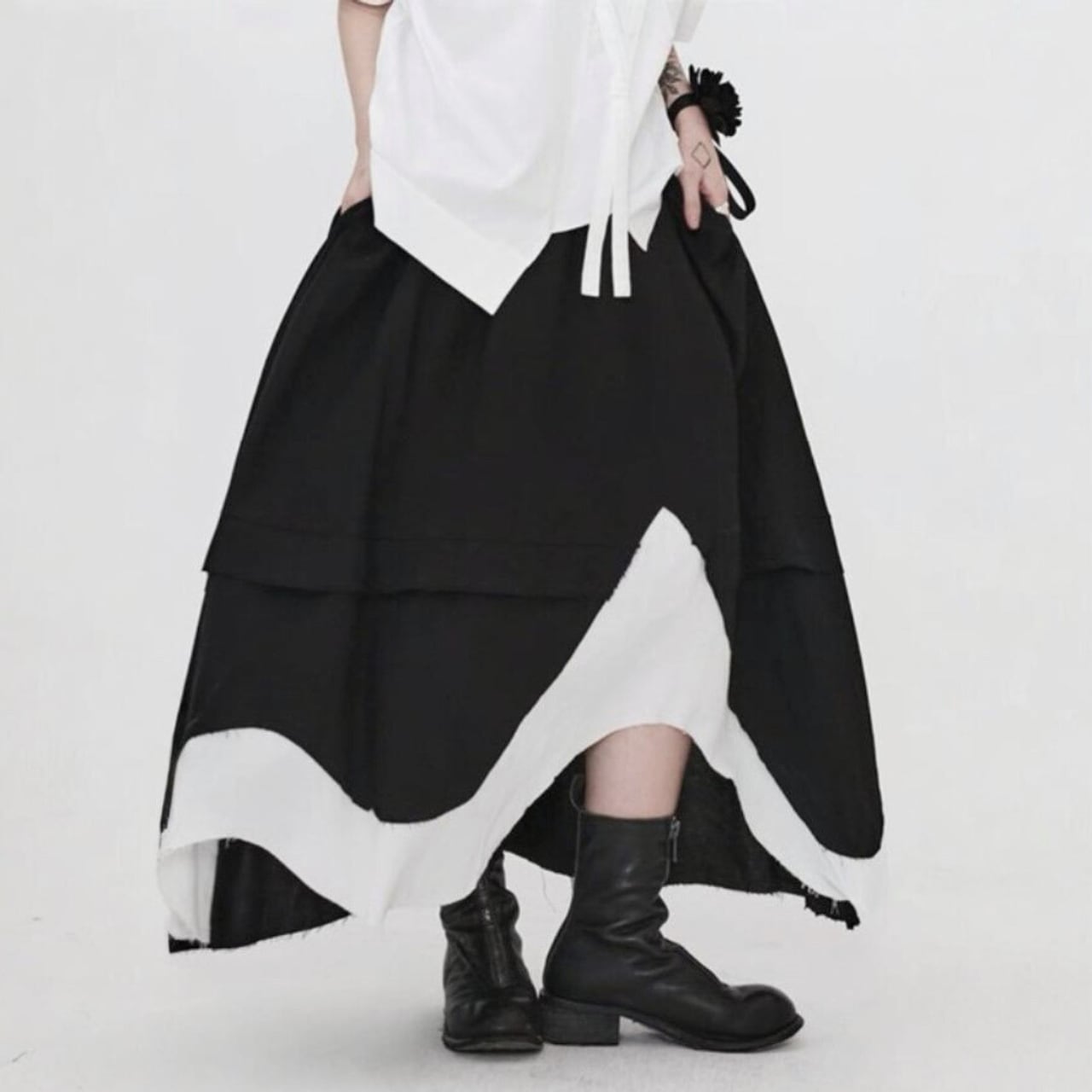 白の切り替えを効かせたロング丈のレイヤードスカート。
