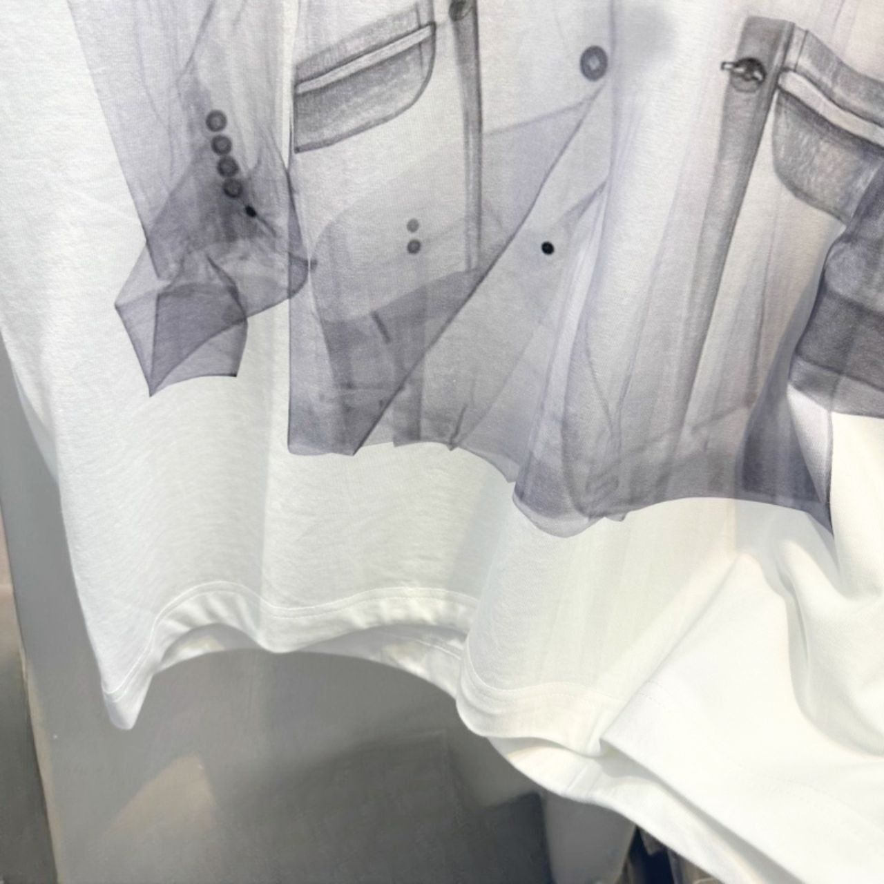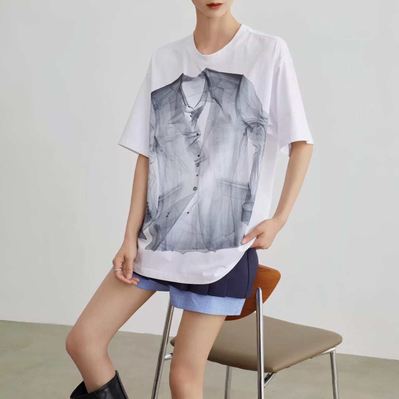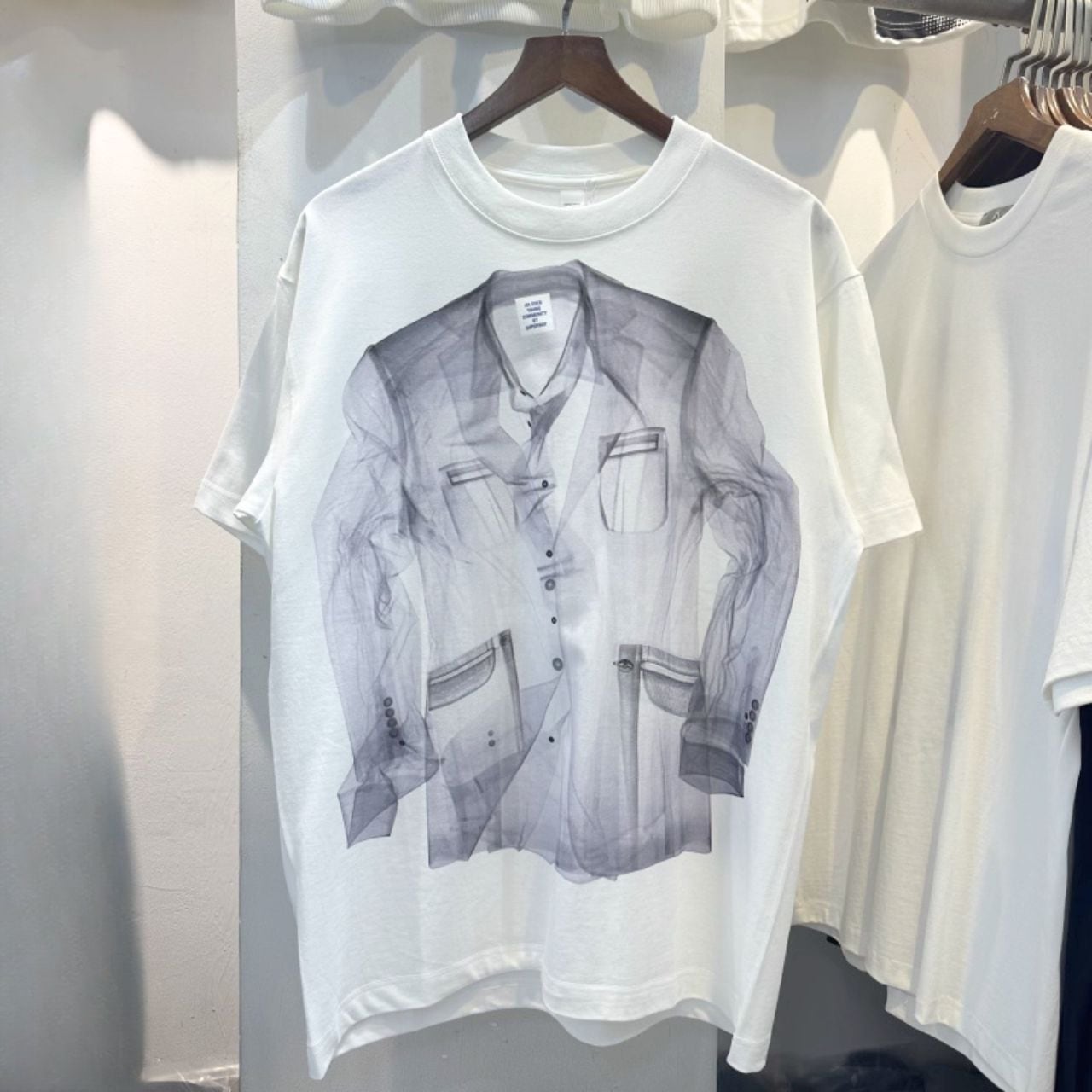 スーツスタイルをプリントで表現した視覚的インパクトのあるTシャツ。