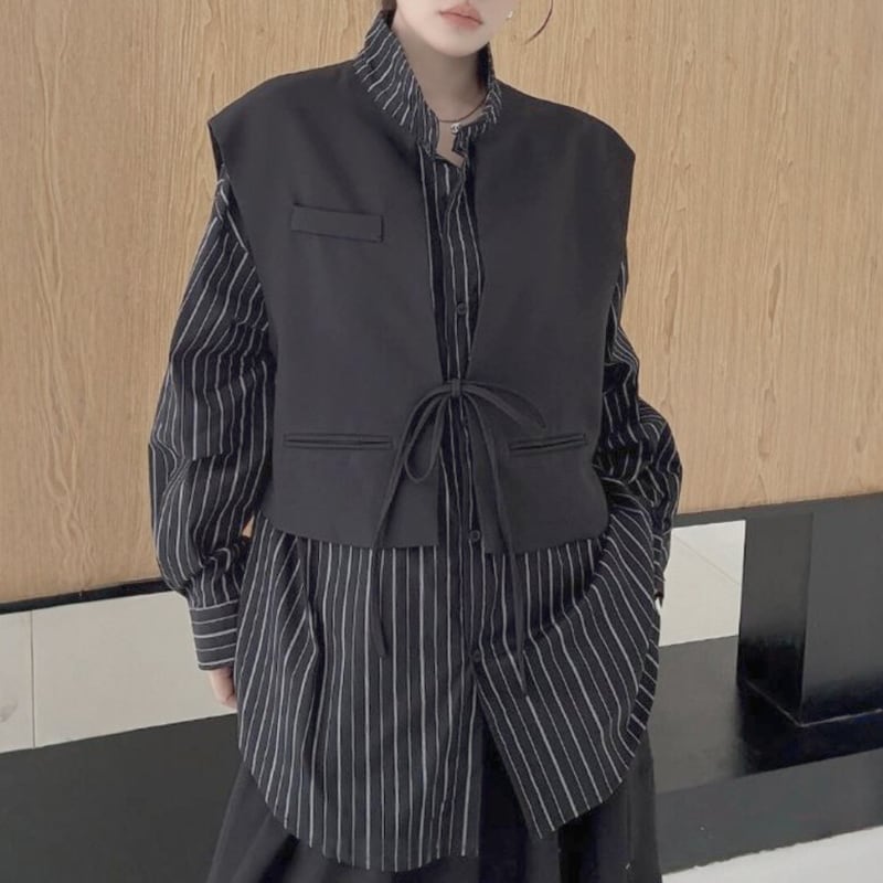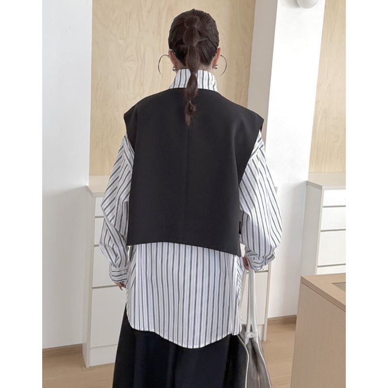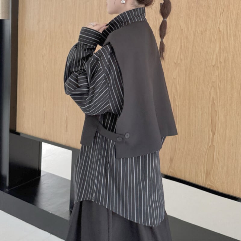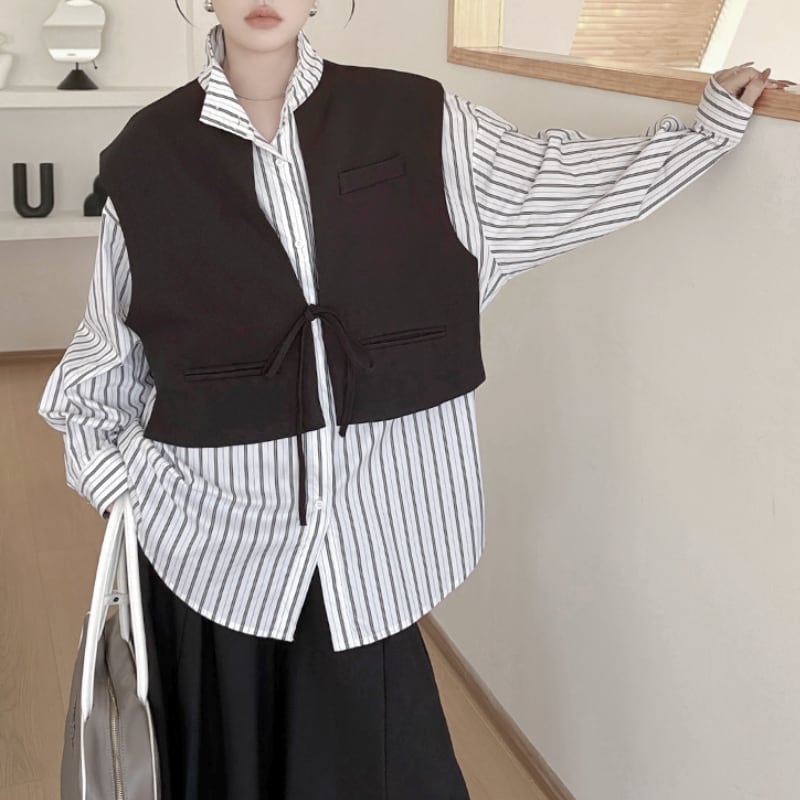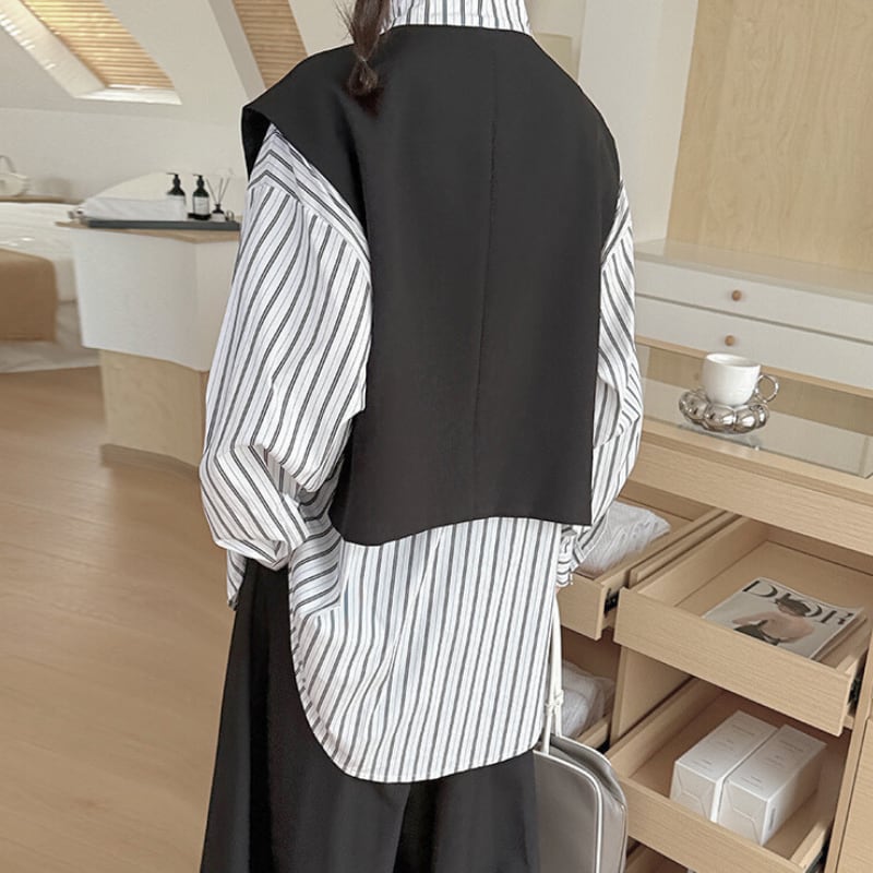 ストライプ柄のシャツに、ショート丈のベストをレイヤードしたデザイン。