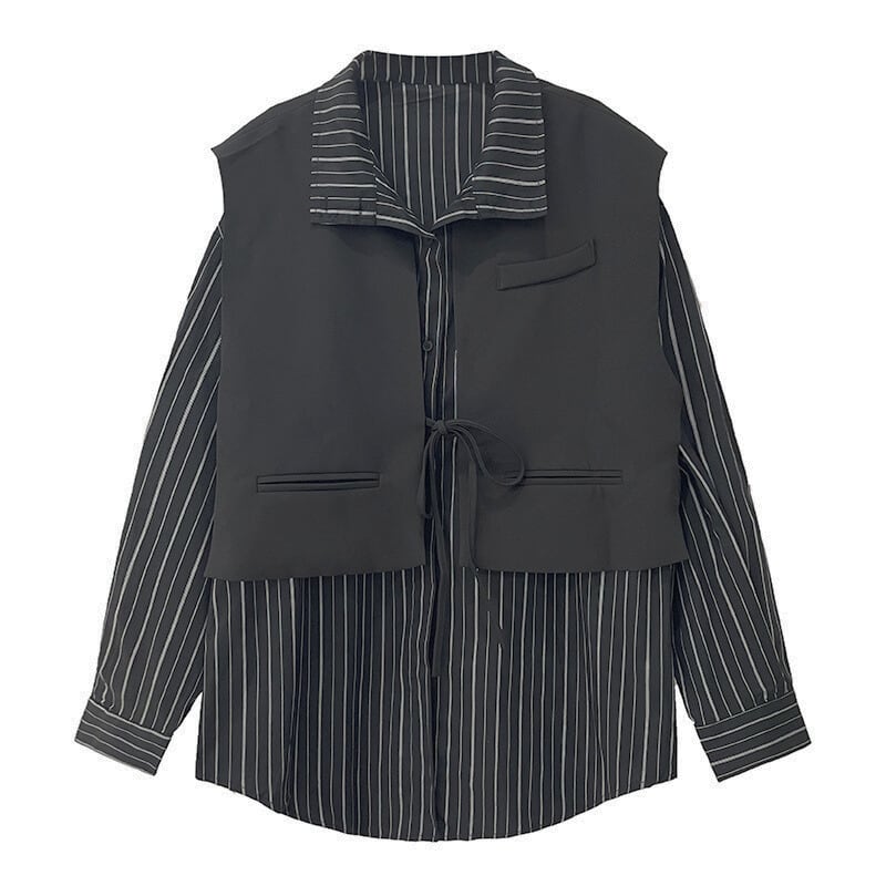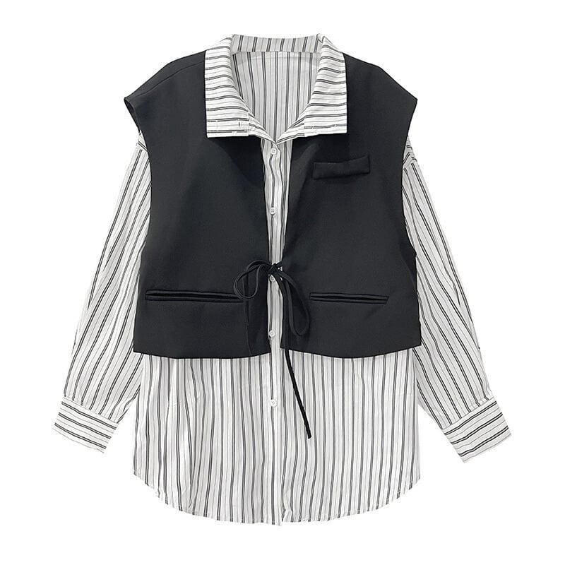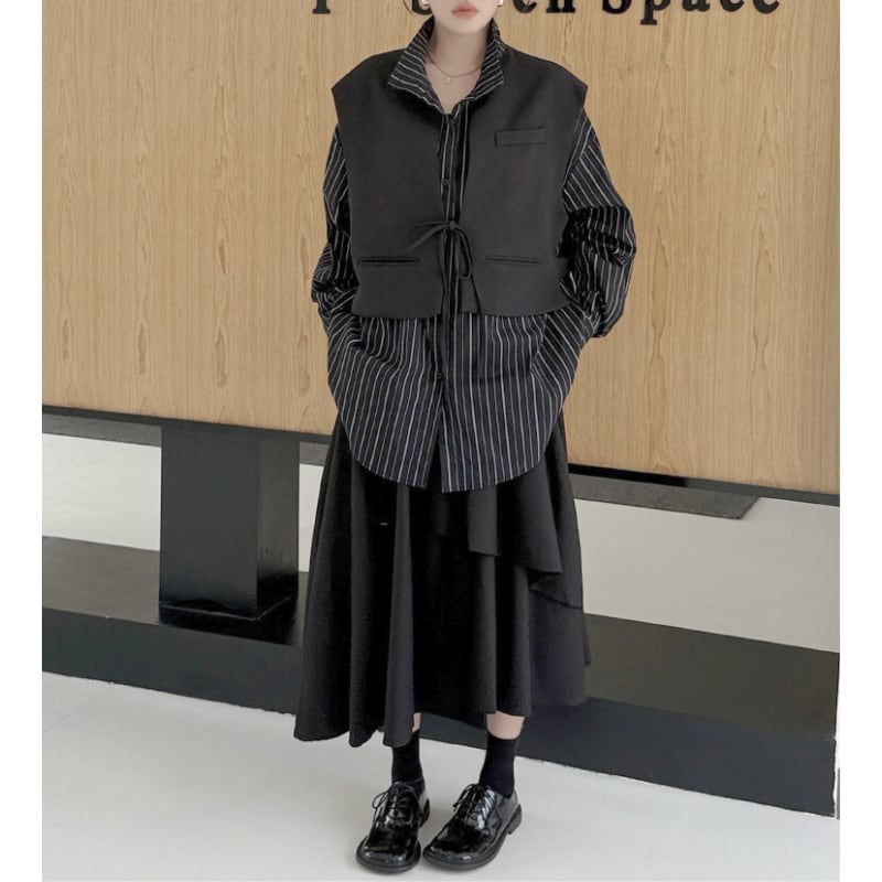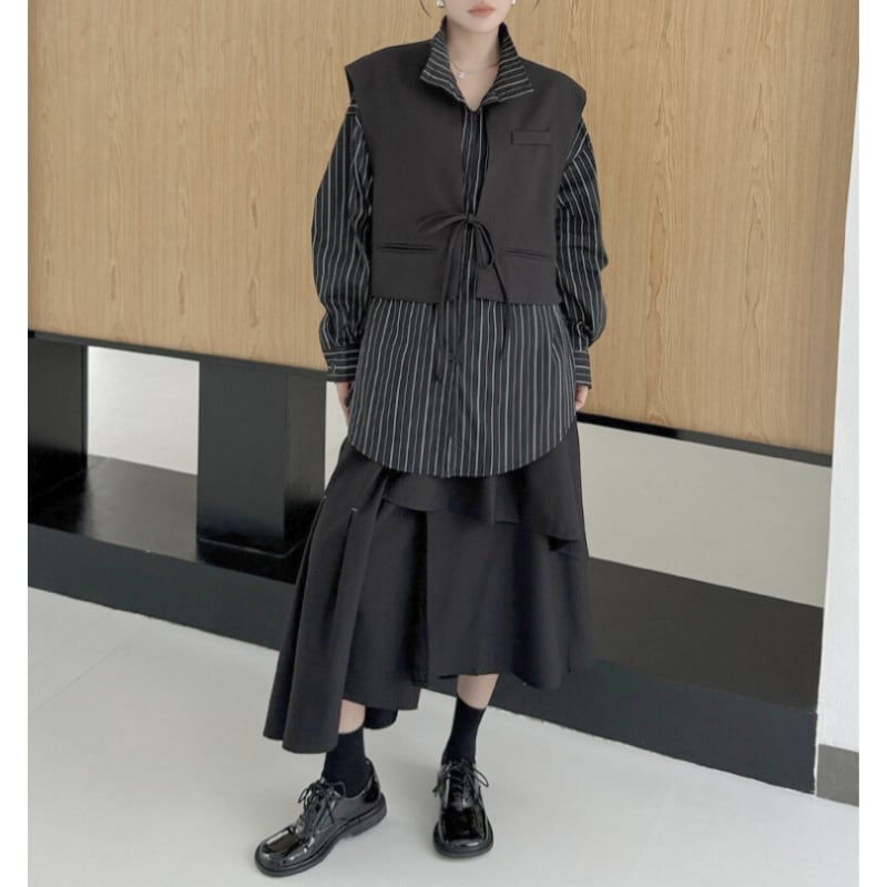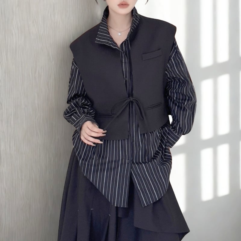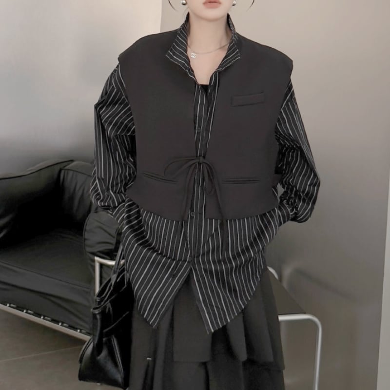ストライプ柄のシャツに、ショート丈のベストをレイヤードしたデザイン。