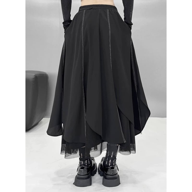 スカートはイレギュラーヘムでモードな雰囲気を演出。