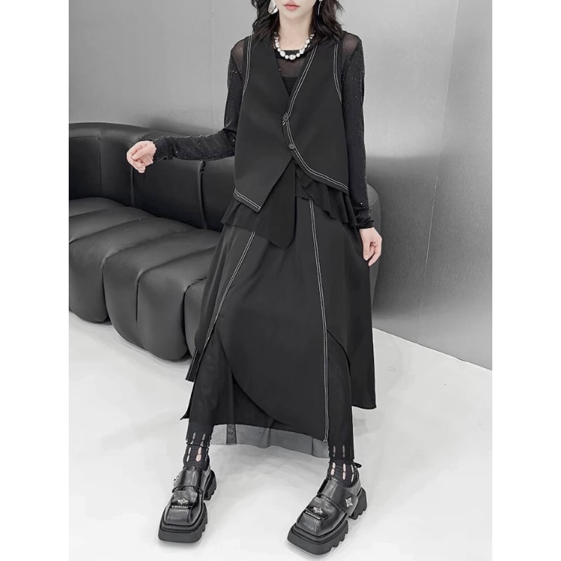 アシンメトリーなデザインのベストとスカートのセットアップ。