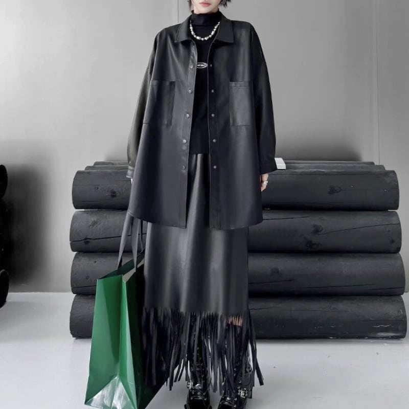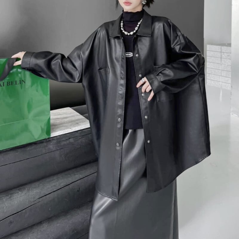 オーバーサイズのシルエットで仕上げられたフェイクレザーシャツ。