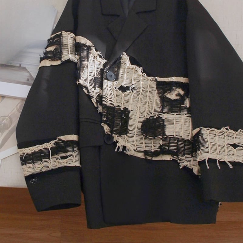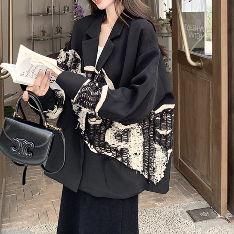 ブラックのボディにオフホワイト×ブラックのレースパネルを重ねたジャケット。