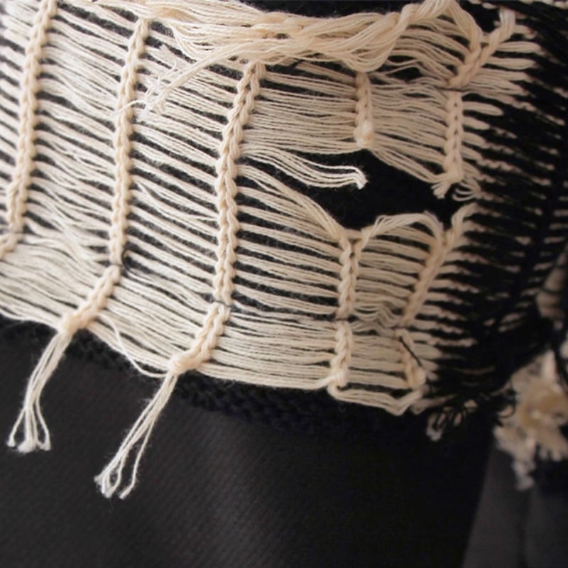 端をほどいたレースとフリンジが立体感を強調するデザイン。
