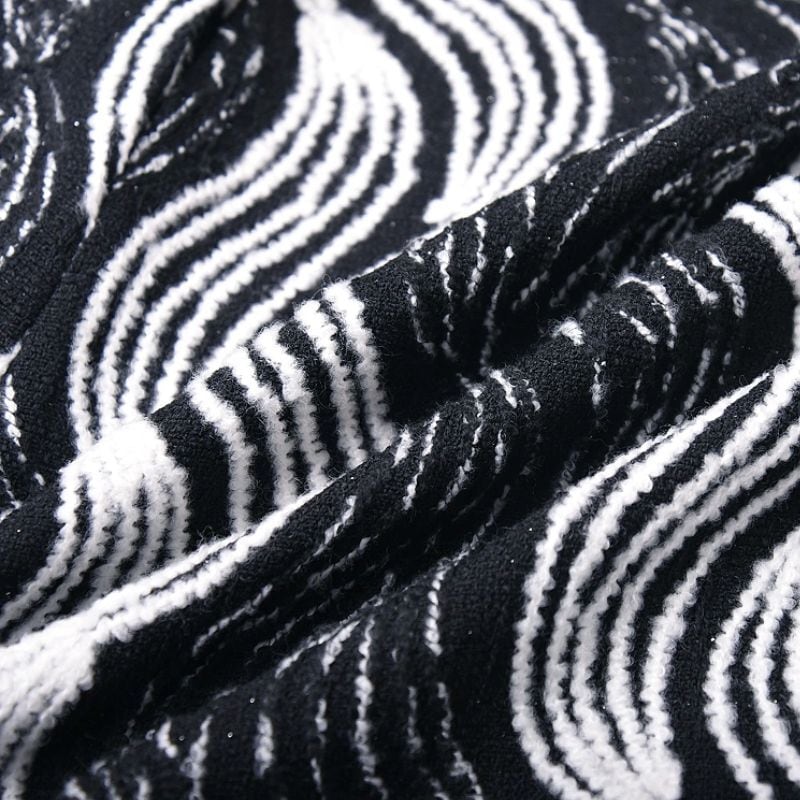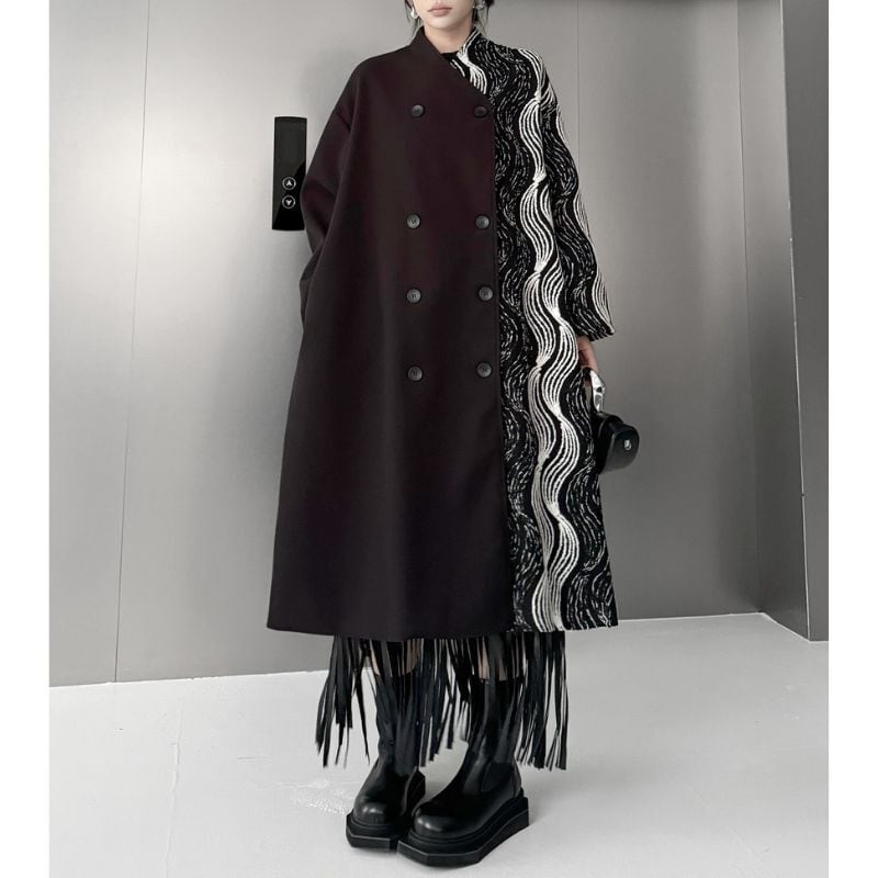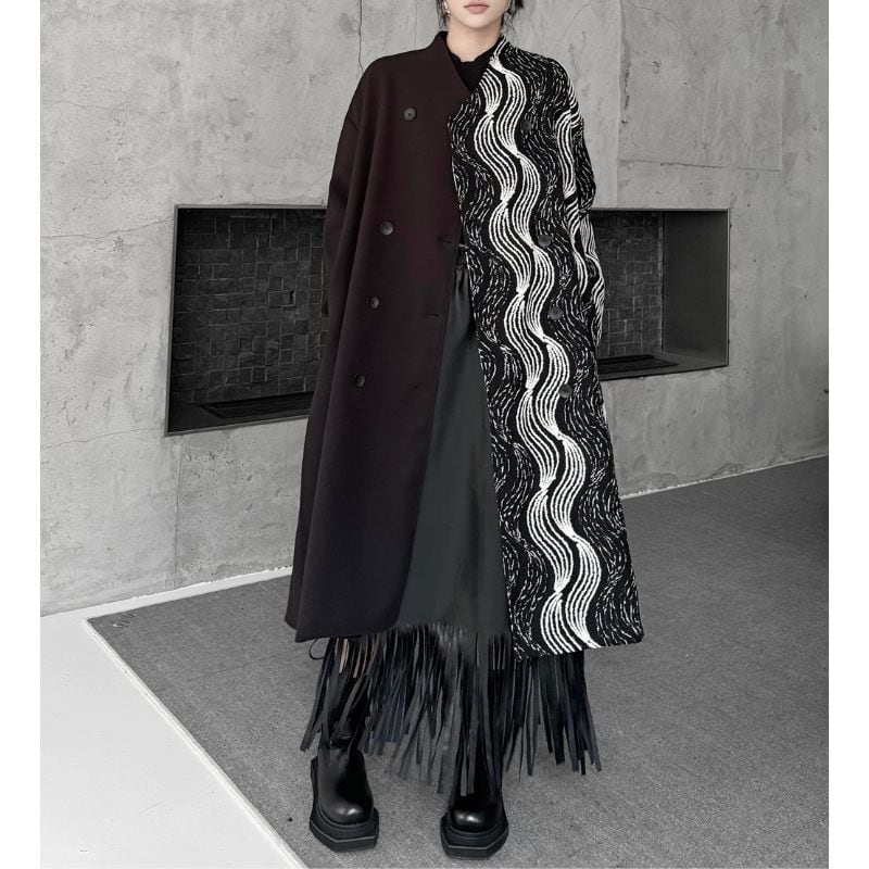 ノーカラーのすっきりとしたシルエットに、片側だけ柄をあしらった印象的なウールコート。