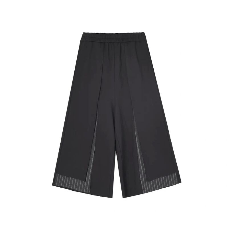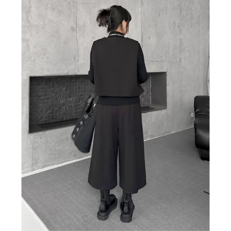カーブラインを描くベスト風トップスと、ワイドクロップドパンツを組み合わせたセットアップ。