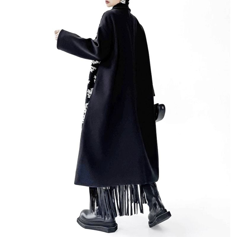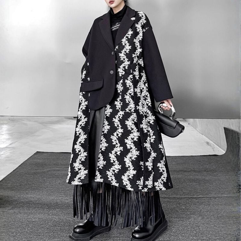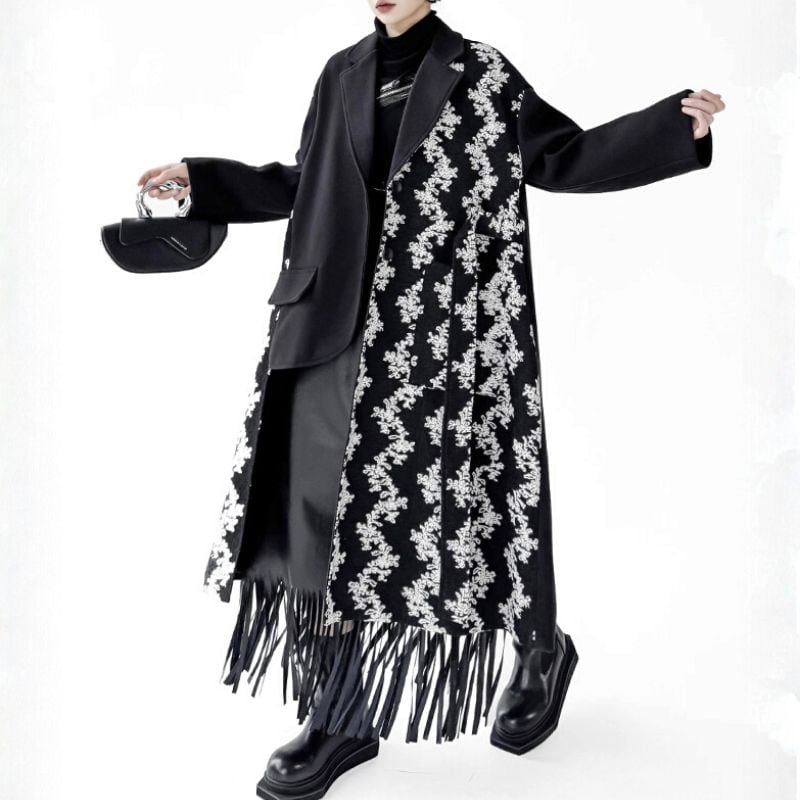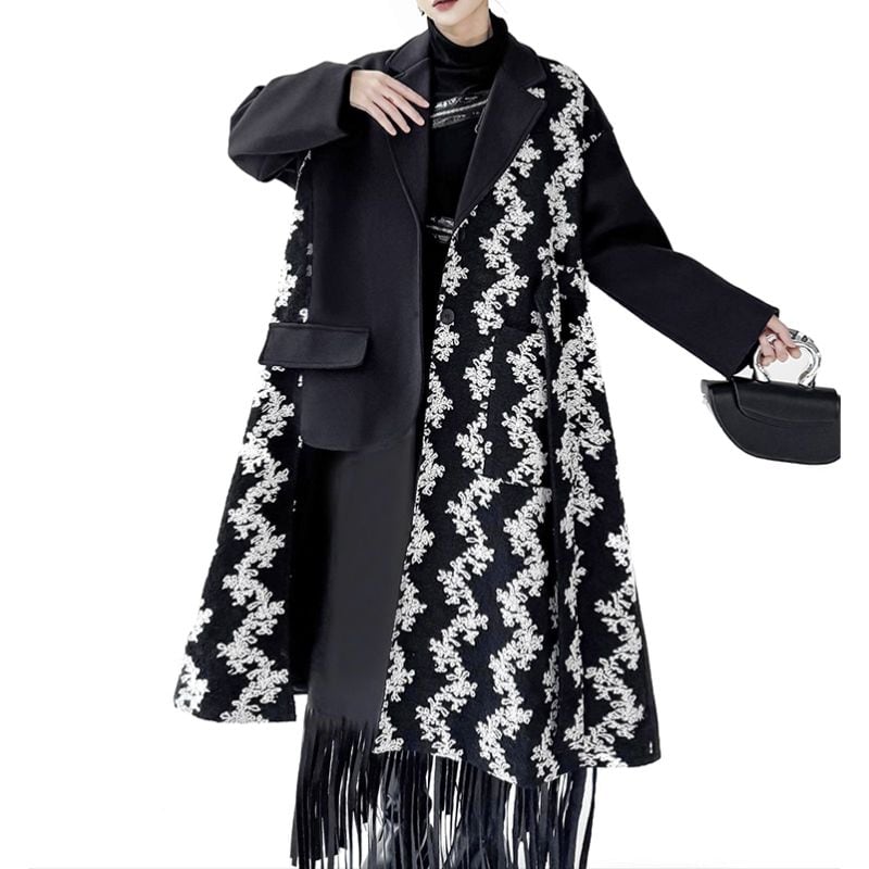 立体感のある花柄ジャカードを大胆に切り替えたロングコート。