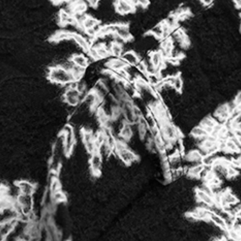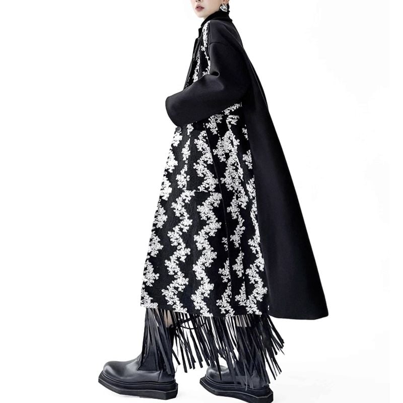 シンプルなブラックにホワイトの模様が映え、クラシカルとモードが共存する一着。