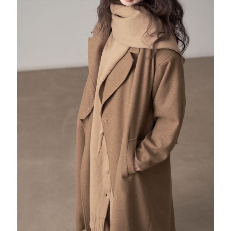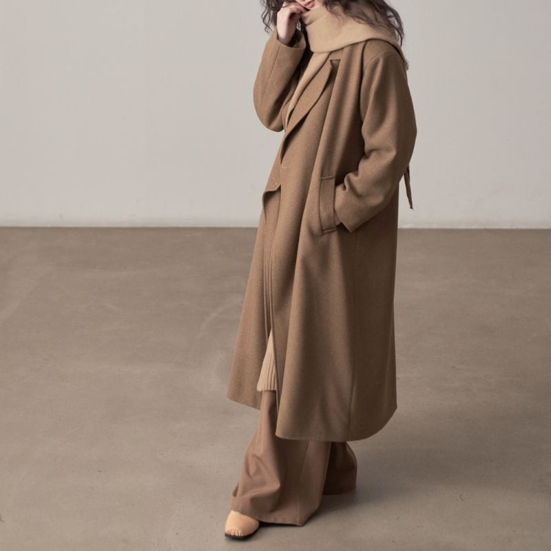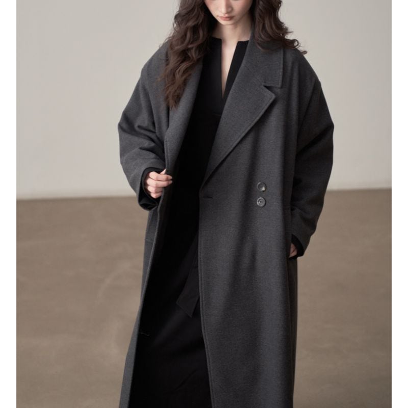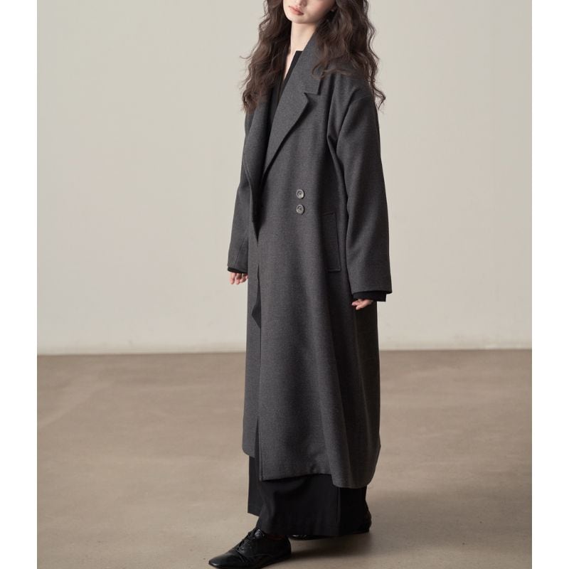 ロング丈が優雅な印象を与える、ダブルブレストのコート。