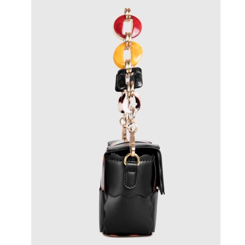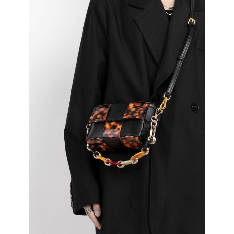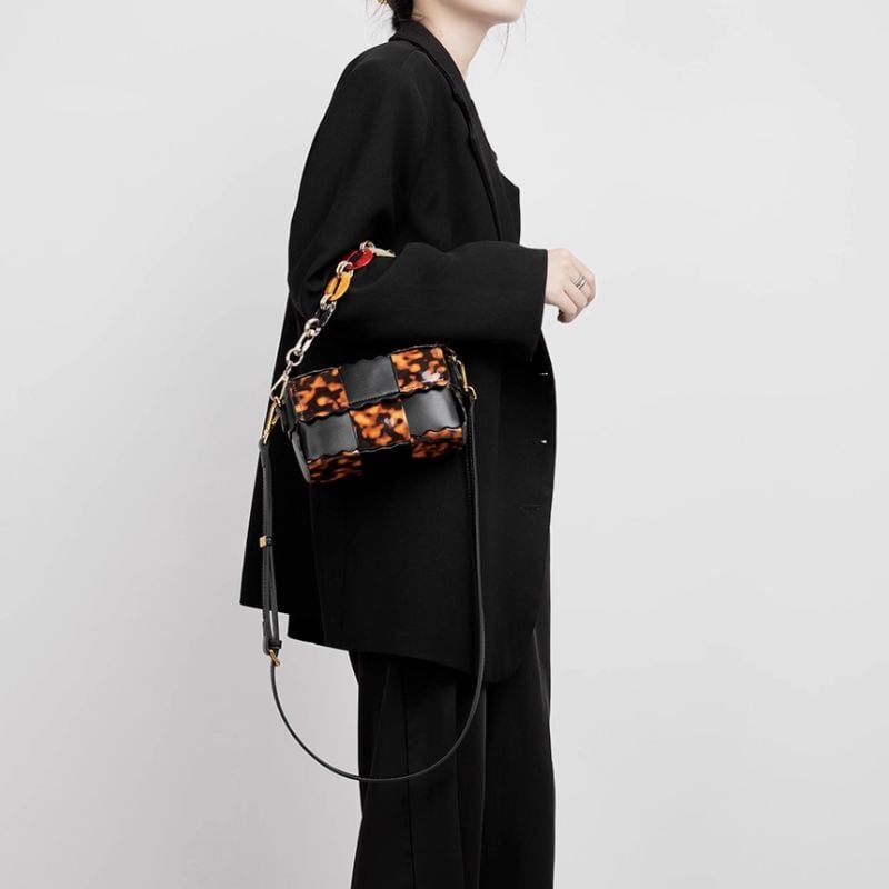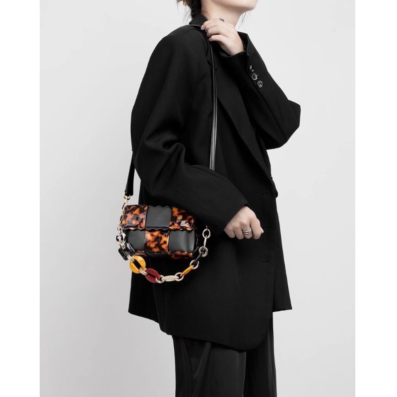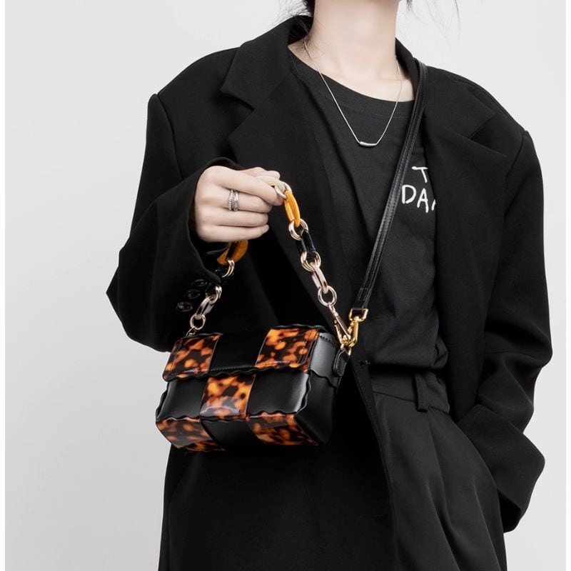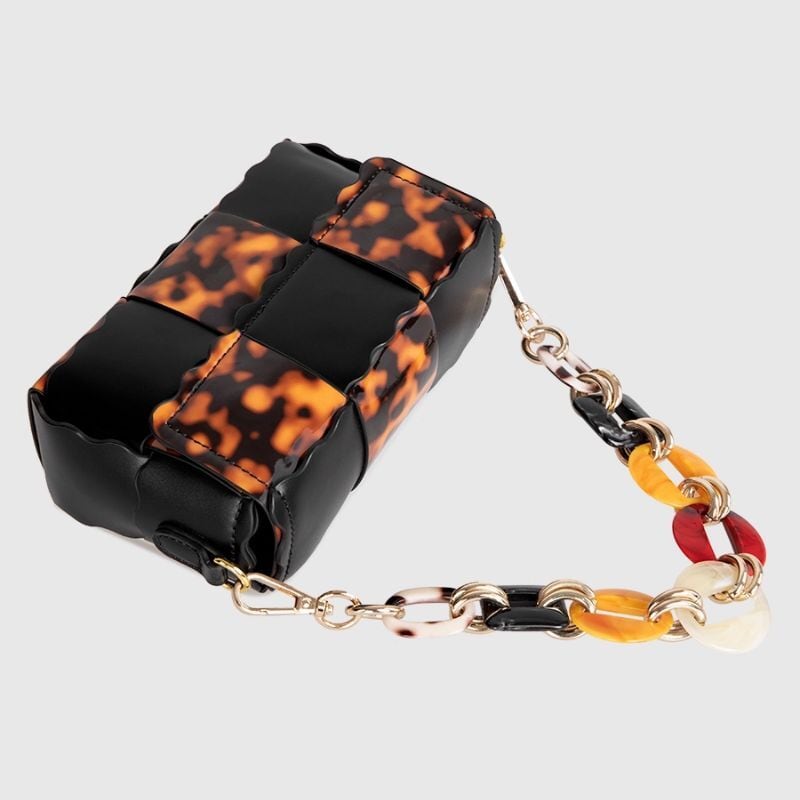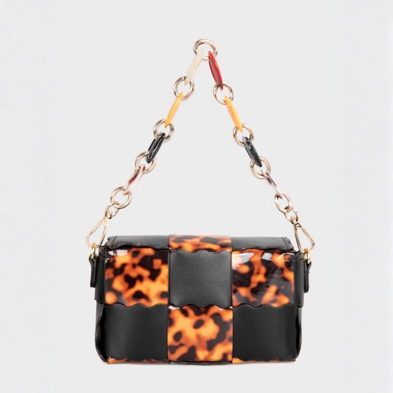 べっ甲柄の素材とフェイクレザーを組み合わせた、スモールスクエアハンドバッグ。