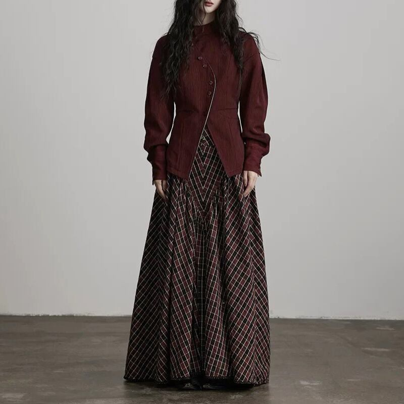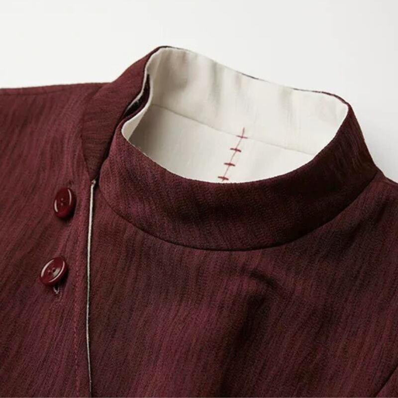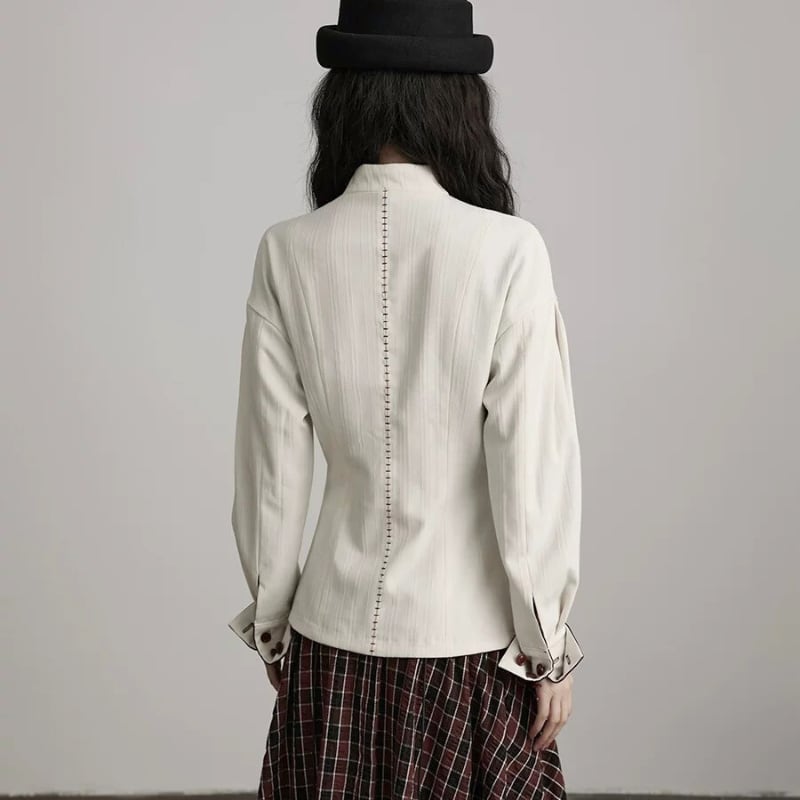 斜めに走るボタンラインとスタンドカラーが、構築的でシャープな印象を演出。