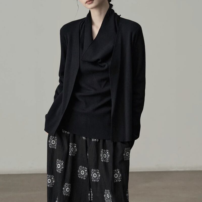 上品なドレープネックのノースリーブニットと、同素材のカーディガンを組み合わせたツーピース。