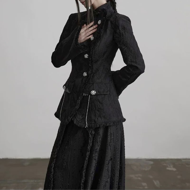フロントの装飾ボタンやポケットに添えたラインディテール、そしてエッジに残したフリンジが、ブラックに繊細な表情を加えます。