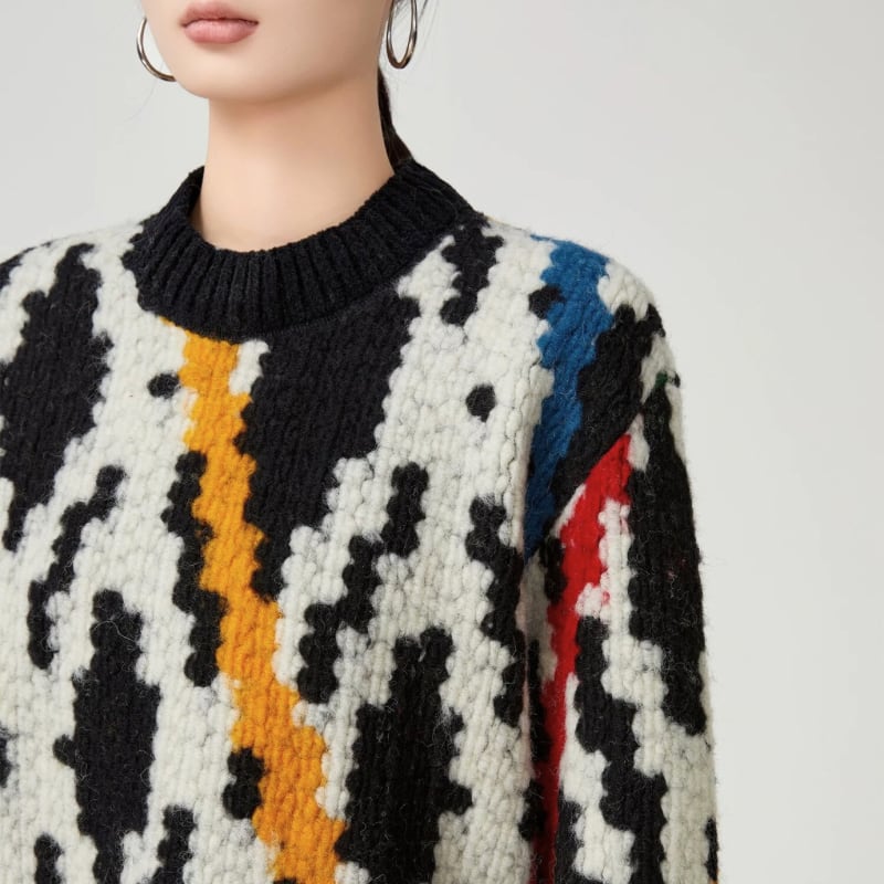 配色のコントラストと立体感のある編地が、スタイリングに強さを与えます。