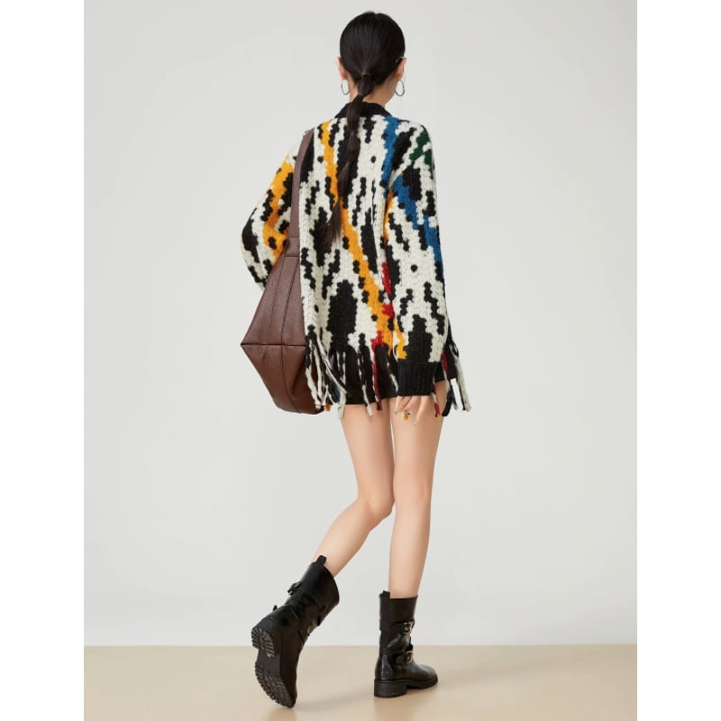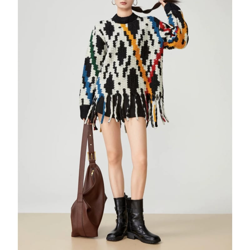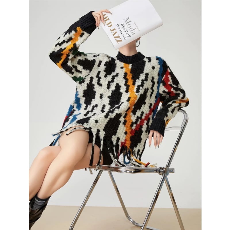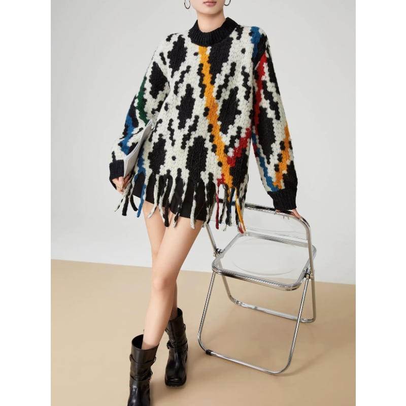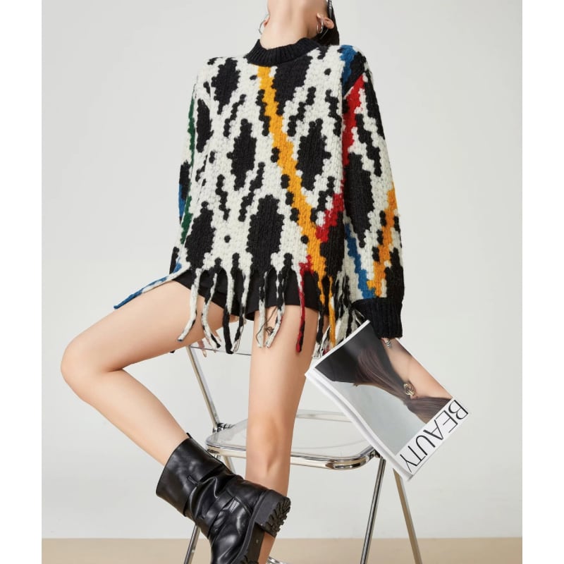 抽象的な柄を全面に落とし込んだフリンジデザインのニット。