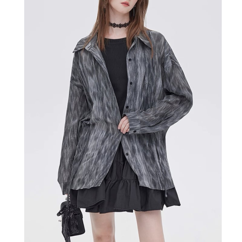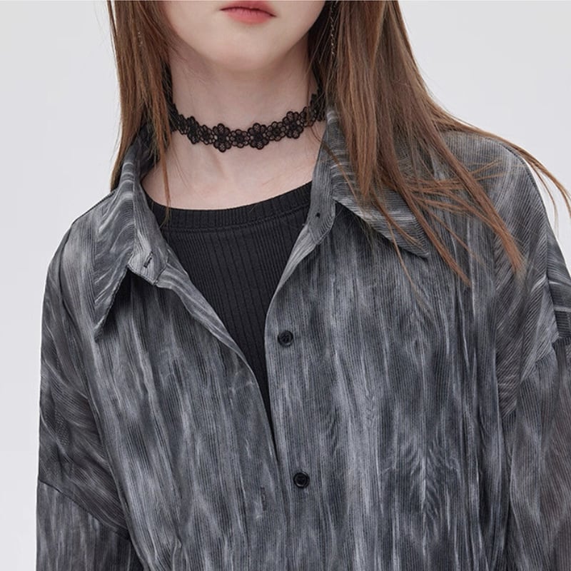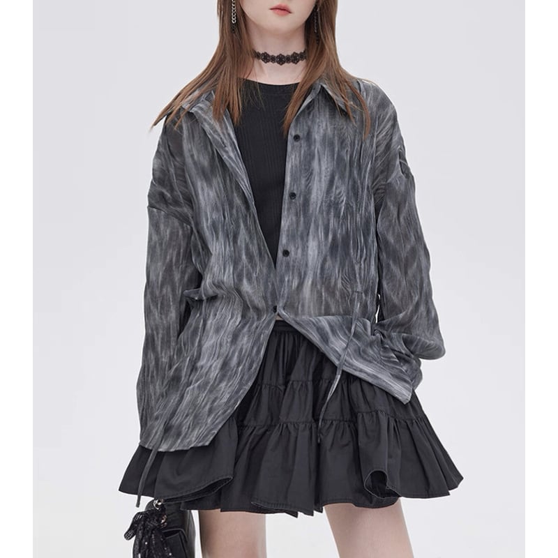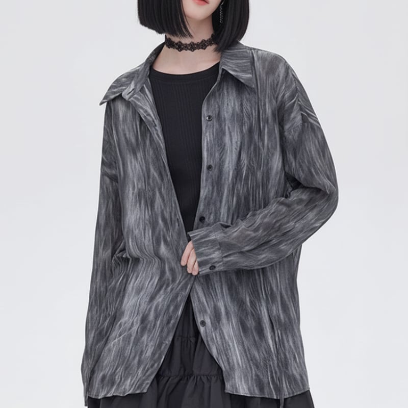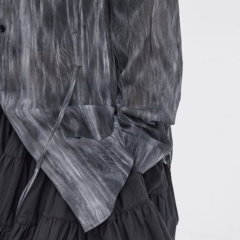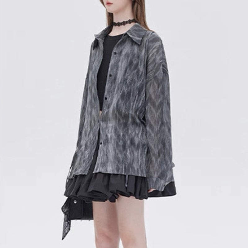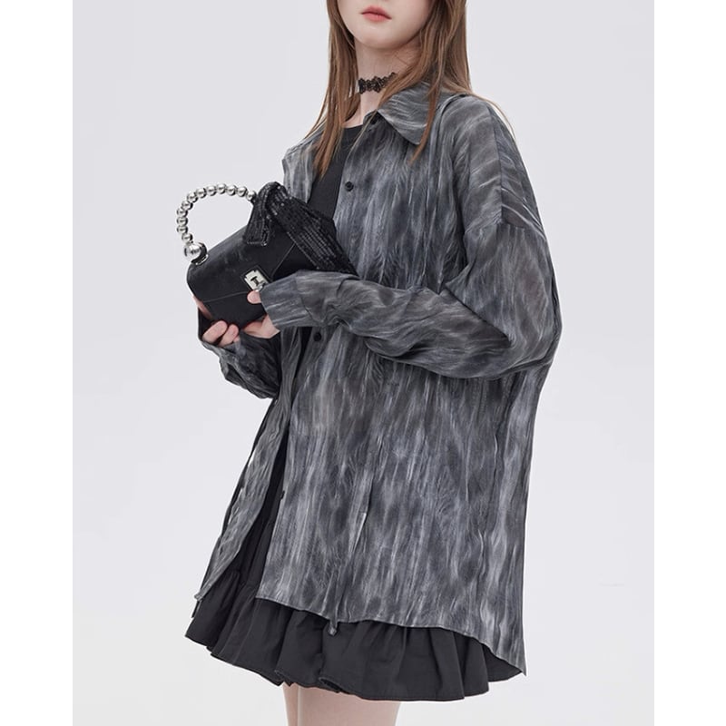 流れるようなマーブル調の柄が印象的なシアーシャツ。