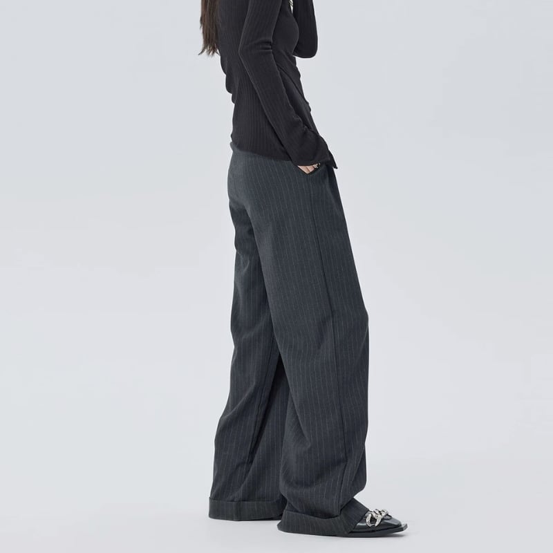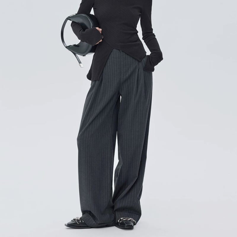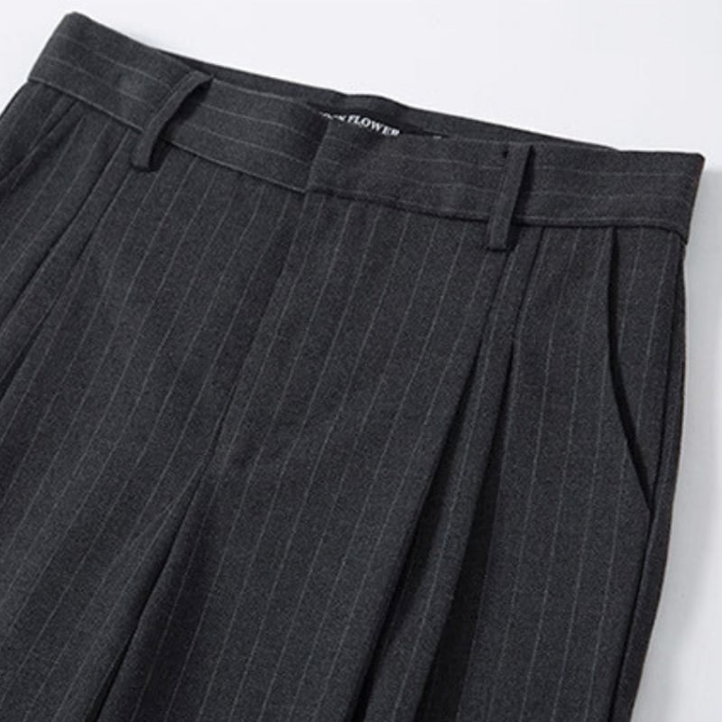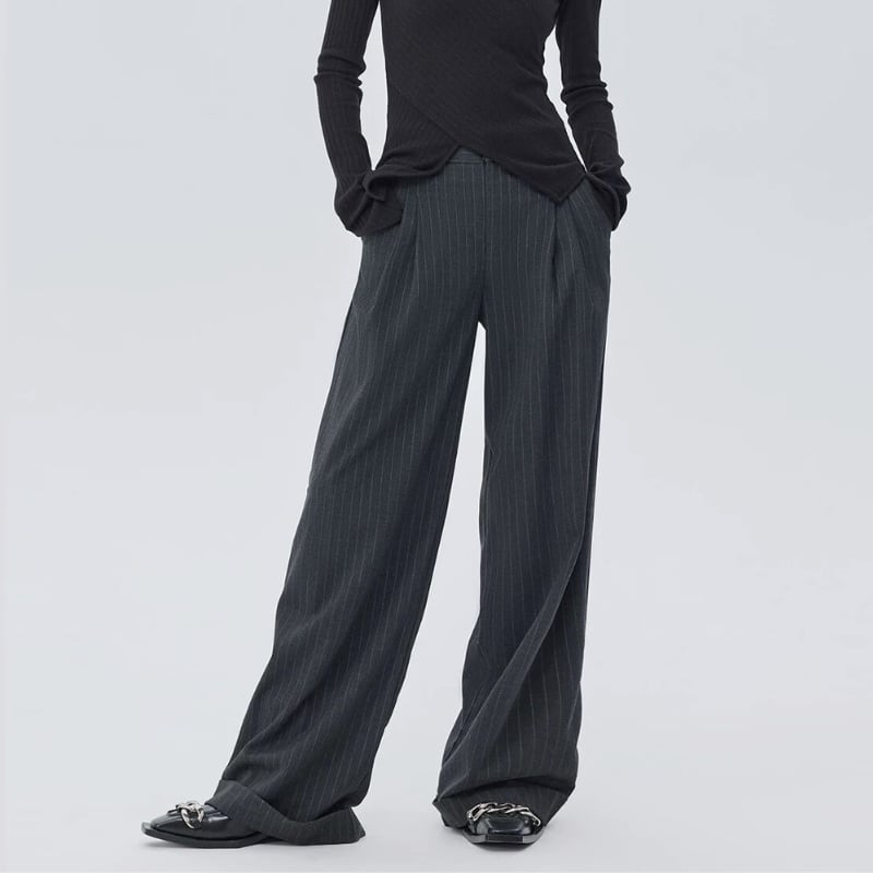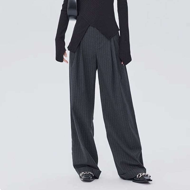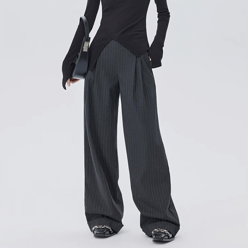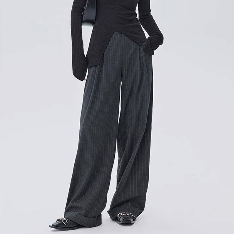 細いピンストライプが入った、落ち感のあるワイドシルエットのパンツ。