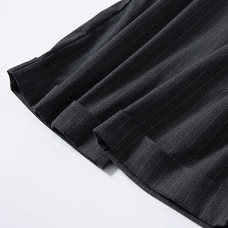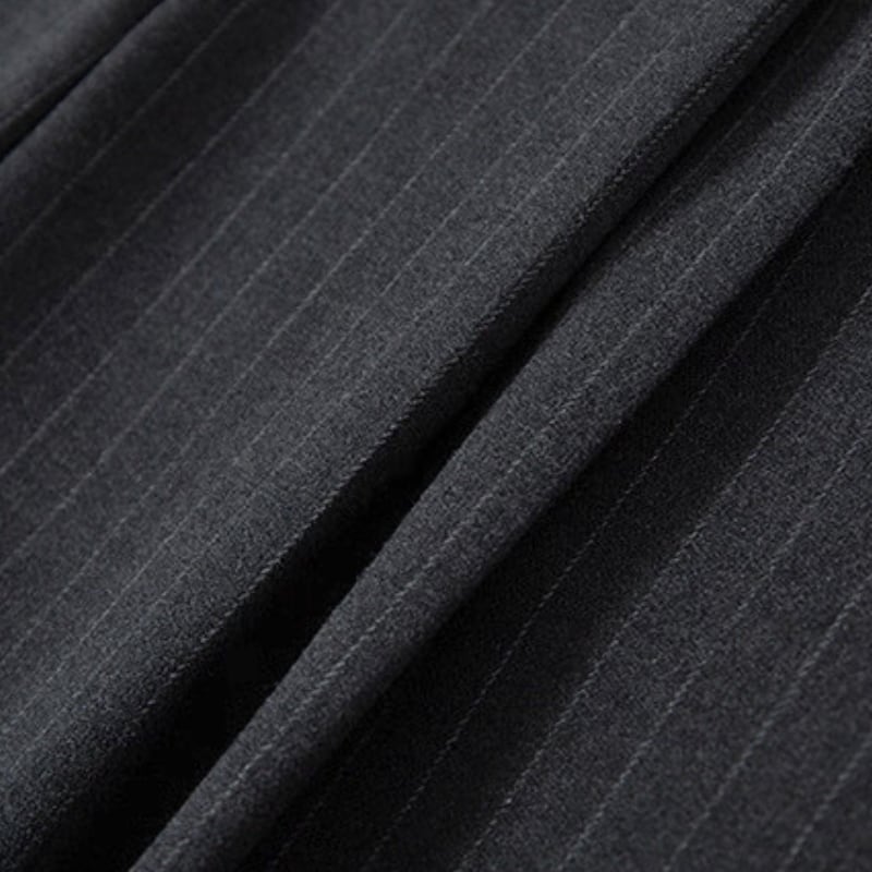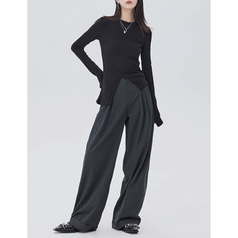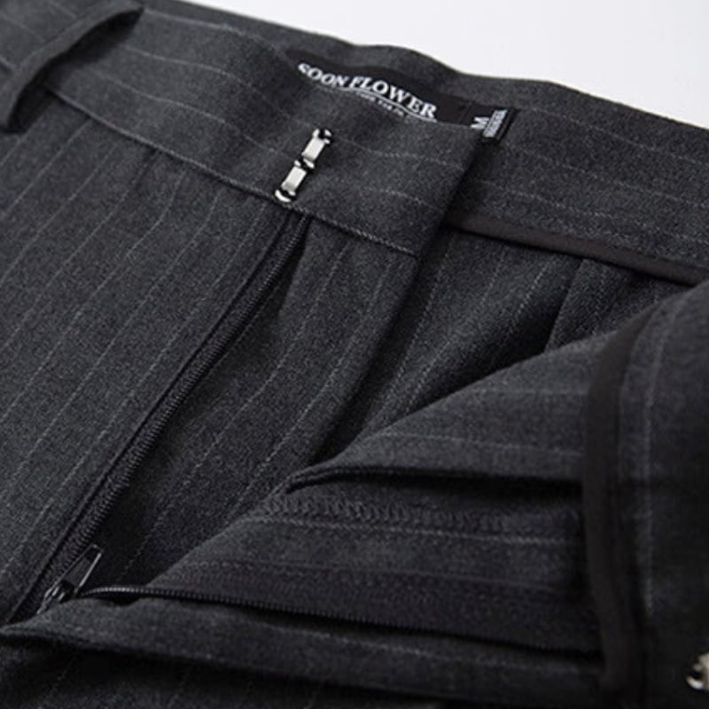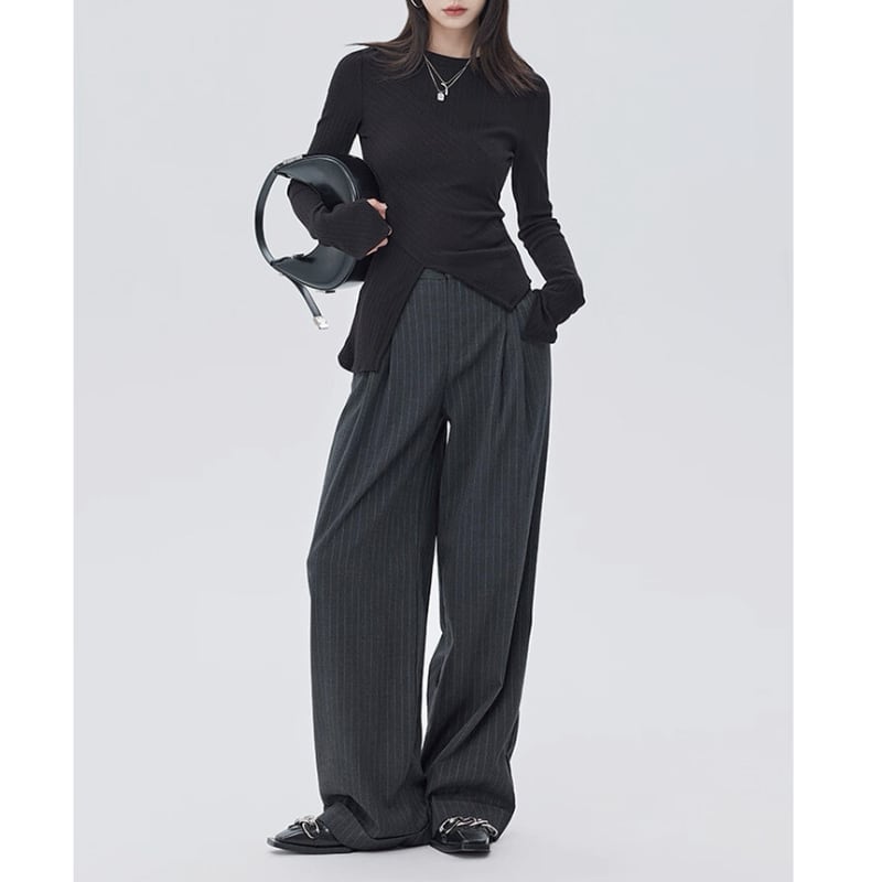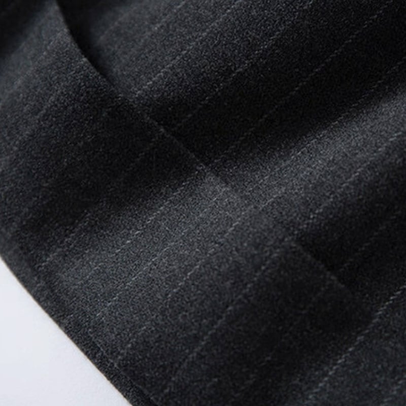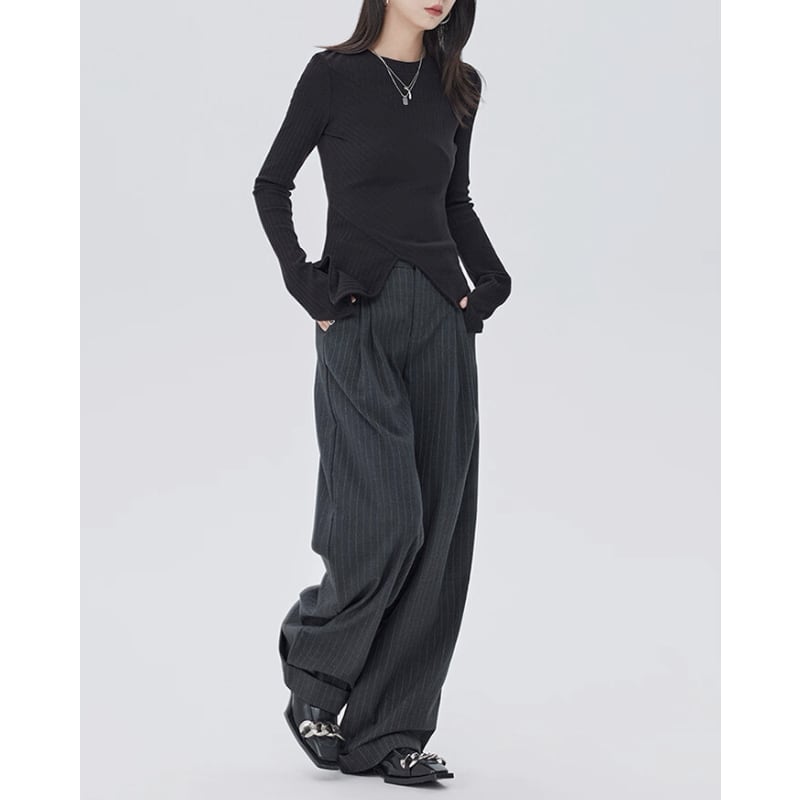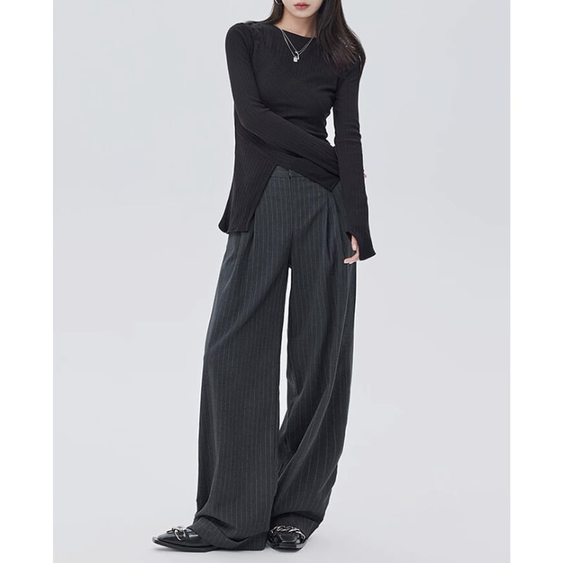 細いピンストライプが入った、落ち感のあるワイドシルエットのパンツ。