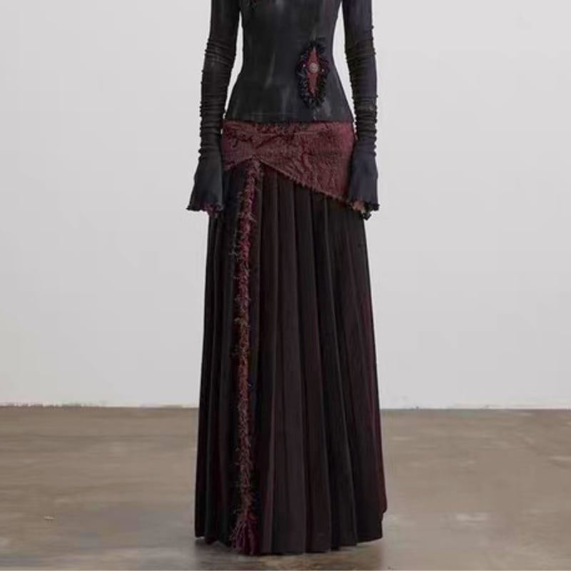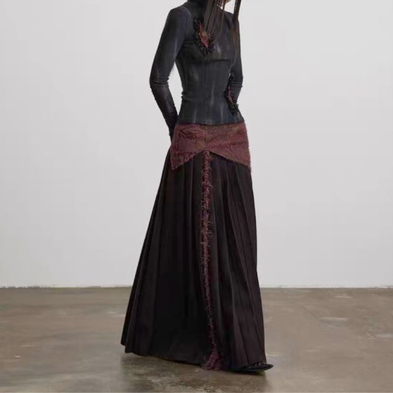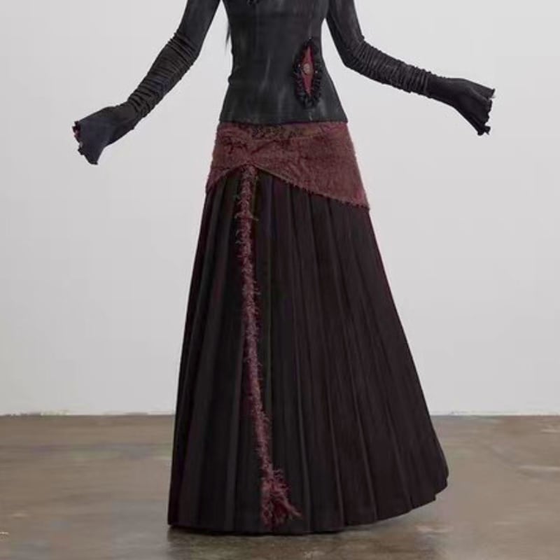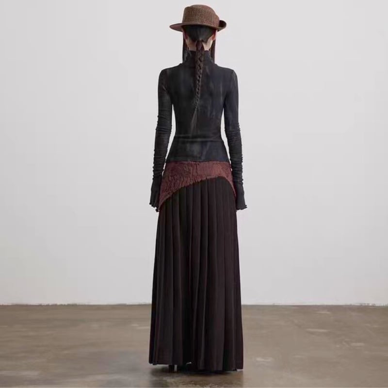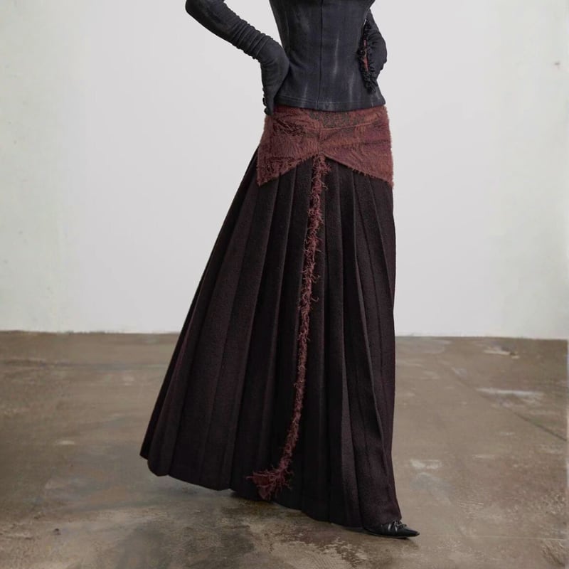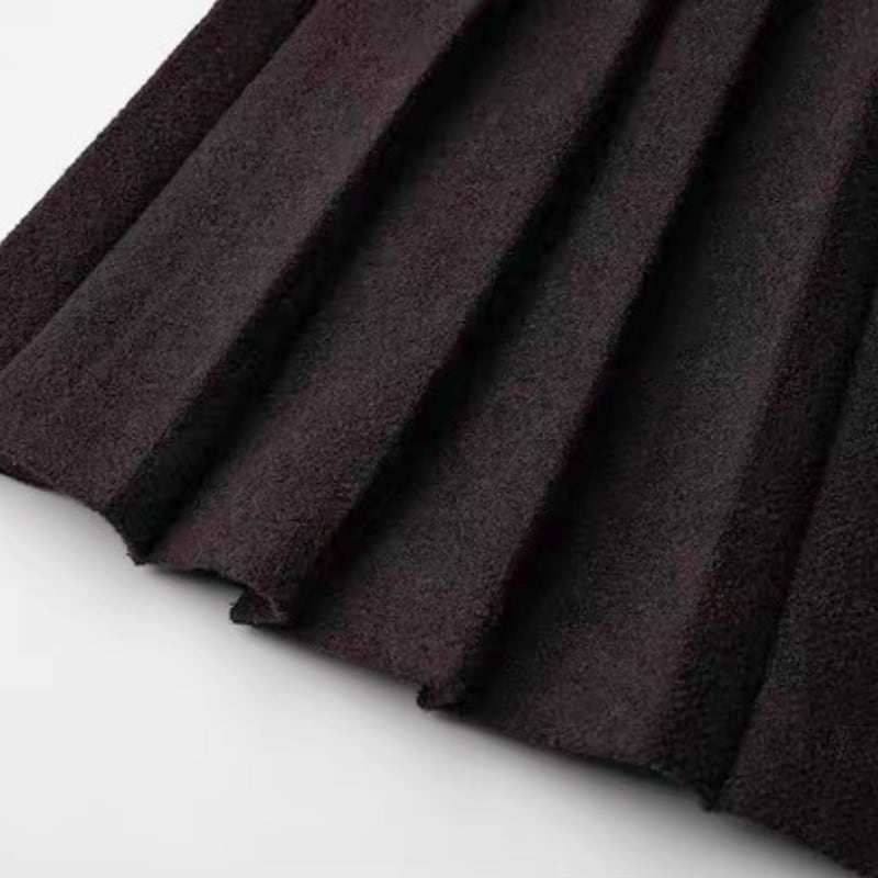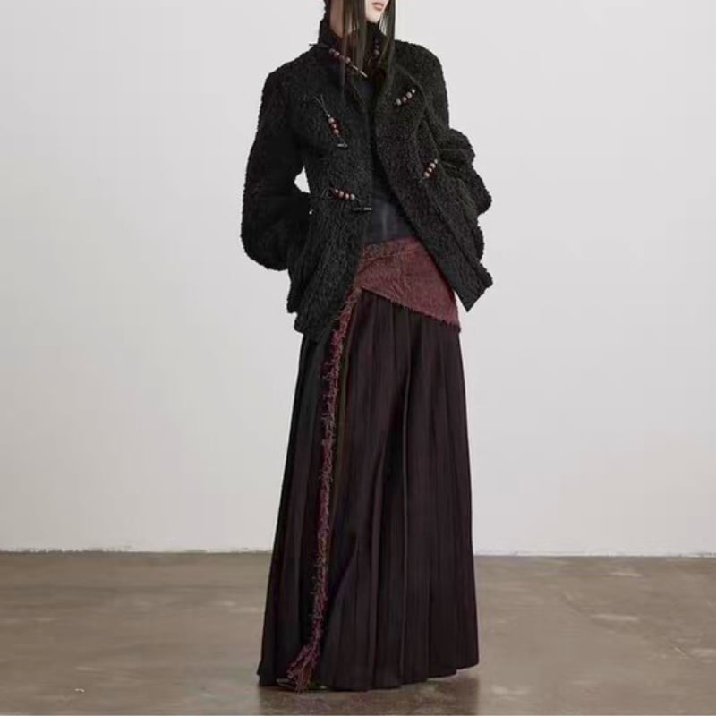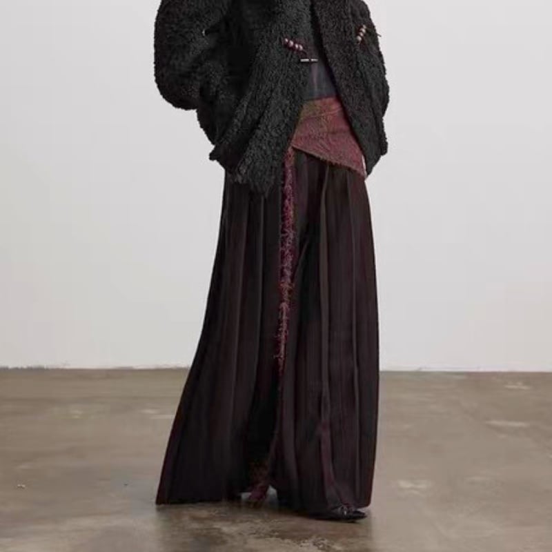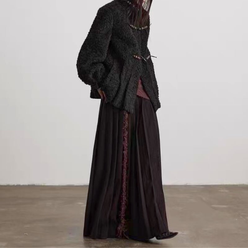 プリーツの落ち感と装飾のコントラストが、スタイリングに深みを与える一枚です。