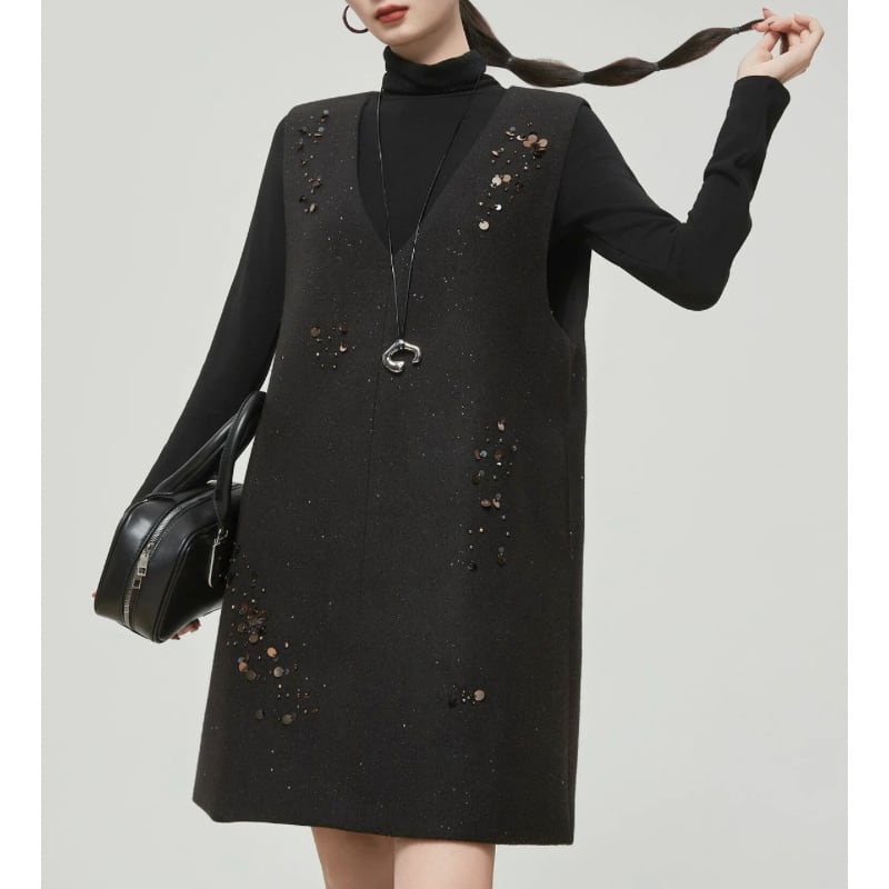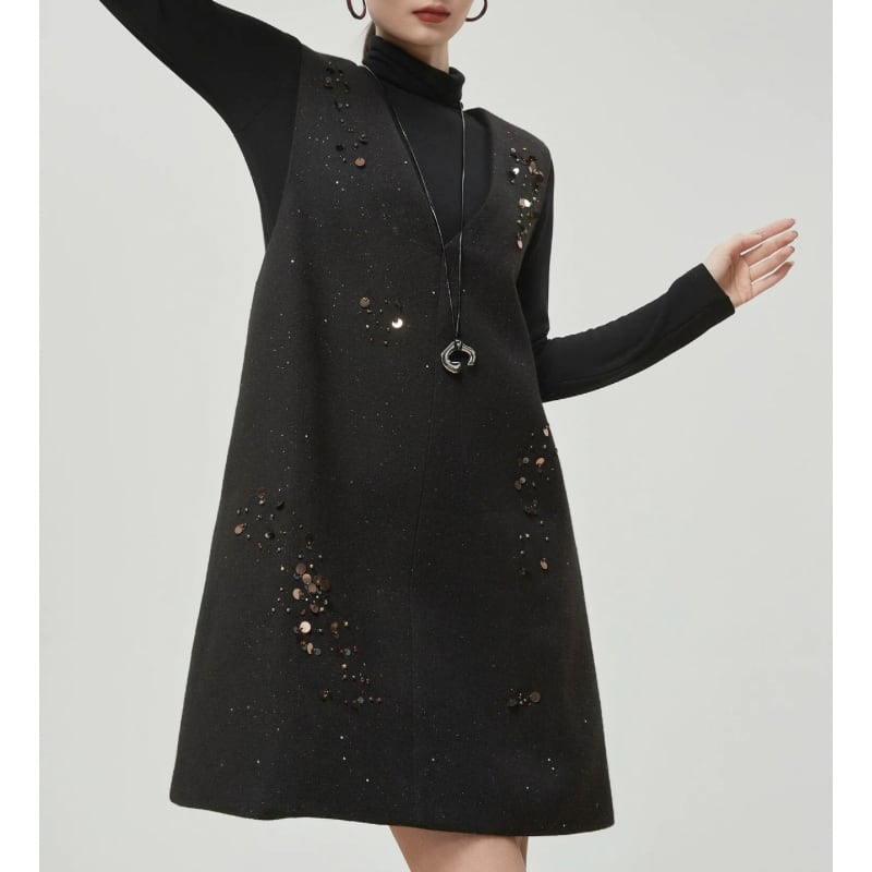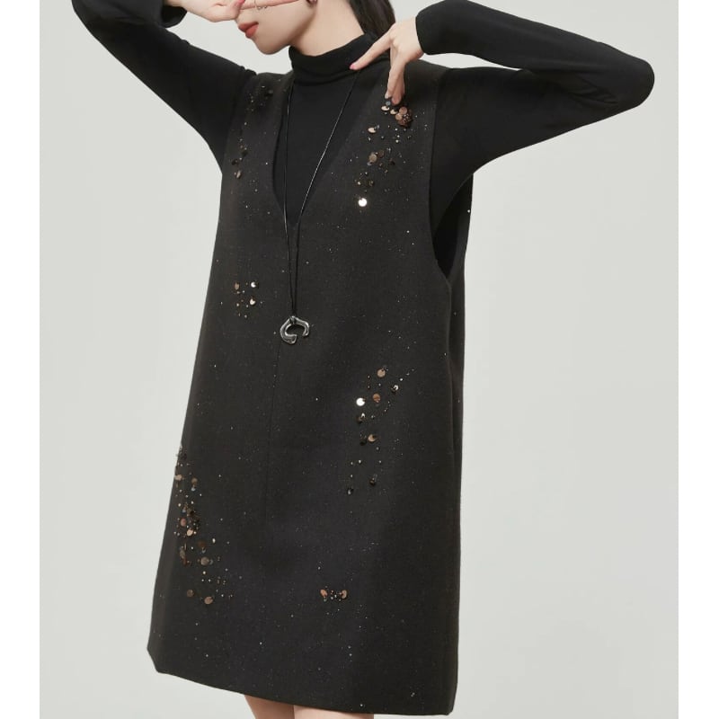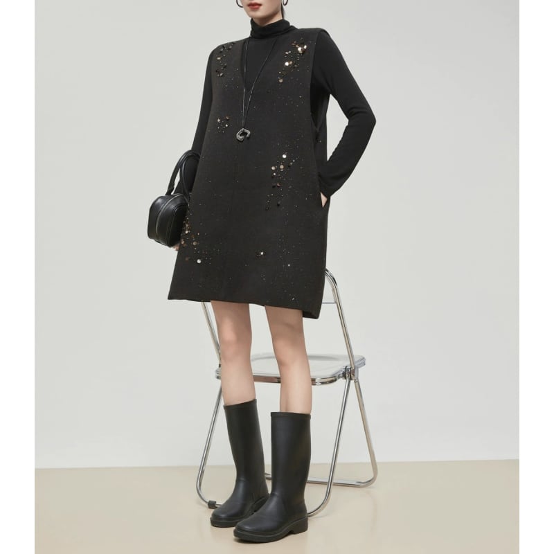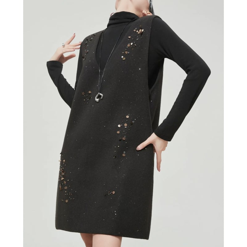 散りばめたようなスパンコール装飾が、控えめなきらめきを添えるノースリーブワンピース。